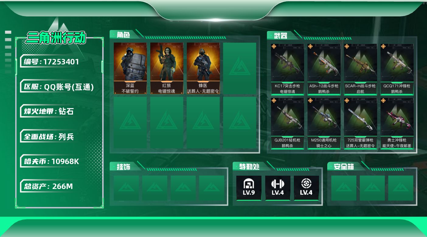 [17253401]可二次【店主推荐捡漏号!可直接换绑】 10968k哈伏币-224m流动资产-60烽火等级-钻石-18战场等级-列兵 【干员外观】:蜂医-送葬人·无题密令,深蓝-不破誓约,红狼-电锯惊魂 【近战皮肤】:近战-黑鹰 【典藏外观】:M7战斗步枪-天际线,PKM通用机枪-极地勘察队,QCQ171冲锋枪-地平线,M4A1突击步枪-雪地迷彩,.357左轮-淘金者,沙漠之鹰-蛇纹涂装,AKM突击步枪-黄铜,Mini-14射手步枪-黄铜,.357左轮-黄铜,QCQ171冲锋枪-凶兽 【传说级普通外观】:M4A1突击步枪-阿米娅,ASh-12战斗步枪-鹅鸭杀,M16A4突击步枪-狩猎时刻,AK-12突击步枪-特斯拉线圈,SCAR-H战斗步枪-启航,G3战斗步枪-狩猎时刻,CAR-15突击步枪-阿米娅,KC17突击步枪-电锯惊魂,Vector冲锋枪-狩猎时刻,UZI冲锋枪-特斯拉线圈,SR-3M紧凑突击步枪-特斯拉线圈,勇士冲锋枪-能天使-午夜邮差,QCQ171冲锋枪-鹅鸭杀,725双管霰弹枪-送葬人-无题密令,M250通用机枪-骑士之心,QJB201轻机枪-鹅鸭杀,复合弓-黑·天际线 【史诗级普通外观】:QBZ95-1突击步枪-曙光,ASh-12战斗步枪-无极限,M16A4突击步枪-竞赛选手,AUG突击步枪-蝮蛇,SCAR-H战斗步枪-囚徒,腾龙突击步枪-无垢,K437突击步枪-守护者,MP5冲锋枪-战术竞备,MP5冲锋枪-竞技风,Vector冲锋枪-阿萨拉文明,Vector冲锋枪-猎鳄行动,SR-3M紧凑突击步枪-荒野求生,SR-3M紧凑突击步枪-战术竞备,勇士冲锋枪-工业狂潮,MP7冲锋枪-无垢,MP7冲锋枪-守护者,PKM通用机枪-蝮蛇,PKM通用机枪-荒野求生,M250通用机枪-囚徒,Mini-14射手步枪-守护者,SVD狙击步枪-荒野求生,PSG-1射手步枪-无垢,SV-98狙击步枪-林中猎手,SV-98狙击步枪-囚徒,M700狙击步枪-蝮蛇,AWM狙击步枪-无极限,复合弓-守护者 【稀有级普通外观】:AKM突击步枪-战术演练,AKM突击步枪-精英联盟,AKM突击步枪-肃杀,QBZ95-1突击步枪-公平竞技,K416突击步枪-虎啸,M7战斗步枪-捣蛋鬼,SCAR-H战斗步枪-荣耀列队,SCAR-H战斗步枪-黄昏,G3战斗步枪-战术演练,G3战斗步枪-主宰,PTR-32突