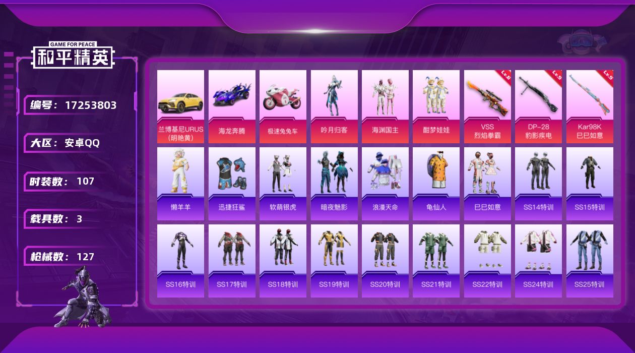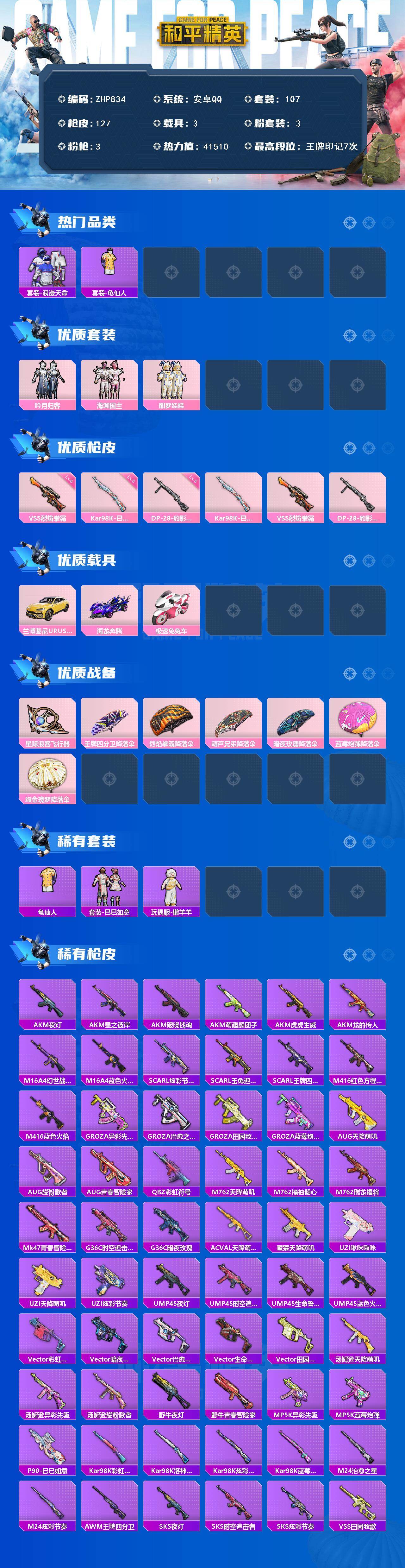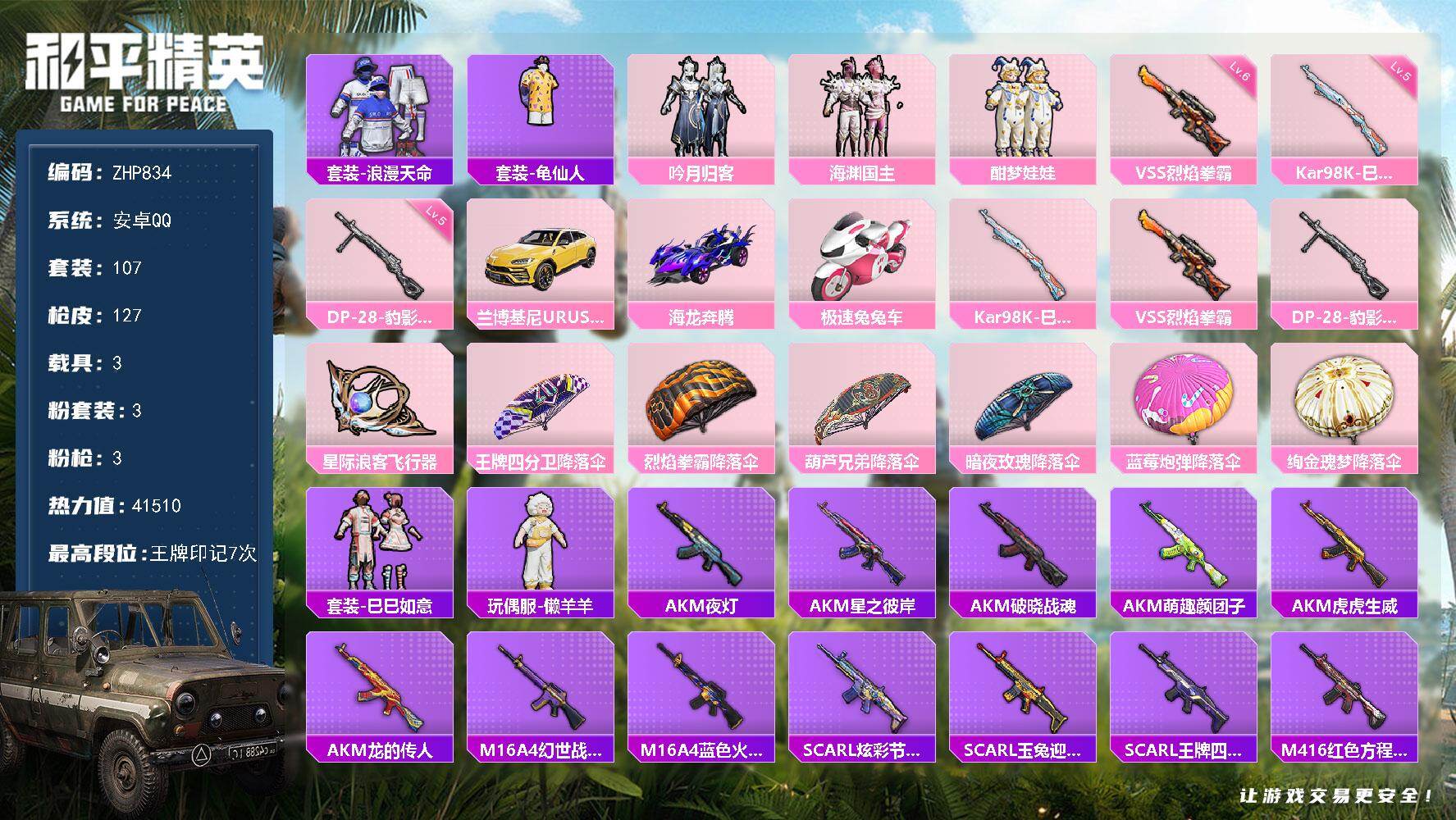 [17253803]安卓 手Q-3粉装-3特效枪-3载具-1粉色飞行器-41510热力值-7王牌印记-107套装-127枪皮 【热门品类】:套装-浪漫天命,套装-龟仙人 【粉色套装】:粉装-吟月归客,粉装-海渊国主,粉装-酣梦娃娃 【粉色枪皮等级】:Kar98K-巳巳如意(五级),VSS-烈焰拳霸(六级),DP-28-豹影疾电(五级) 【粉色载具】:兰博基尼URUS(明艳黄),海龙奔腾,极速兔兔车 【粉色枪皮】:Kar98K-巳巳如意,VSS-烈焰拳霸,DP-28-豹影疾电 【粉色飞行器】:星际浪客飞行器 【粉色降落伞】:王牌四分卫降落伞,烈焰拳霸降落伞,葫芦兄弟降落伞,暗夜玫瑰降落伞,蓝莓炮弹降落伞,绚金瑰梦降落伞 【稀有套装】:套装-龟仙人,套装-巳巳如意,玩偶服-懒羊羊 【稀有枪皮】:AKM-夜灯,AKM-星之彼岸,AKM-破晓战魂,AKM-萌趣颜团子,AKM-虎虎生威,AKM-龙的传人,M16A4-幻世战舞者,M16A4-蓝色火焰,SCAR-L-炫彩节奏,SCAR-L-玉兔迎春,SCAR-L-王牌四分卫,M416-红色方程式,M416-蓝色火焰,GROZA-异彩先驱,GROZA-治愈之星,GROZA-田园牧歌,GROZA-蓝莓炮弹,AUG-天降萌叽,AUG-耀粉歌者,AUG-青春冒险家,QBZ-彩虹符号,M762-天降萌叽,M762-橘柚倾心,M762-瑞龙福将,Mk47-青春冒险家,G36C-时空追击者,G36C-暗夜玫瑰,AC-VAL-天降萌叽,蜜獾-天降萌叽,UZI-啾咪啾咪,UZI-天降萌叽,UZI-炫彩节奏,UMP45-夜灯,UMP45-时空追击者,UMP45-生命誓言,UMP45-蓝色火焰,Vector-彩虹符号,Vector-暗夜玫瑰,Vector-治愈之星,Vector-生命誓言,Vector-田园牧歌,汤姆逊-天降萌叽,汤姆逊-异彩先驱,汤姆逊-耀粉歌者,野牛-夜灯,野牛-青春冒险家,MP5K-异彩先驱,MP5K-蓝莓炮弹,P90-巳巳如意,Kar98K-彩虹符号,Kar98K-洛神天依,Kar98K-炫彩节奏,Kar98K-蓝莓炮弹,M24-治愈之星,M24-炫彩节奏,AWM-王牌四分卫,SKS-夜灯,SKS-时空追击者,SKS-炫彩节奏,VSS-田园牧歌,Mini14-异彩先驱,Mini14-炫彩节奏,Mini14-耀粉歌者,Mk14-治愈之星,Mk14