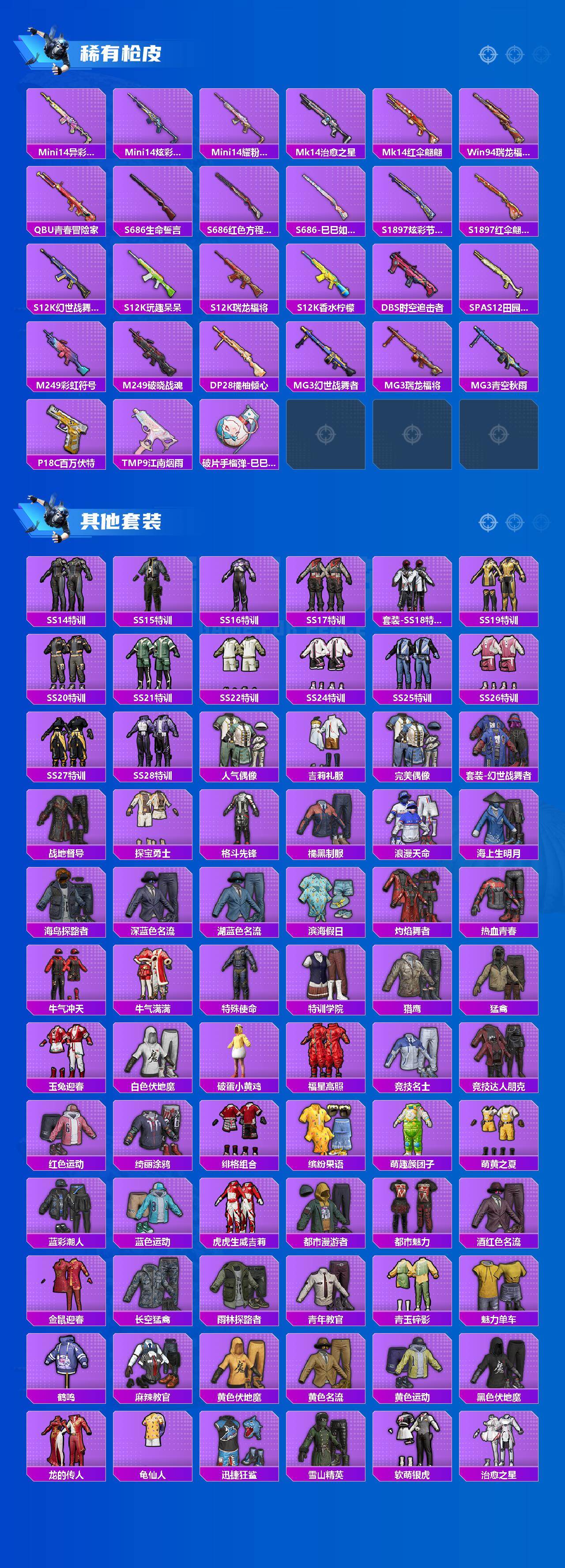 【稀有枪皮】:AKM-夜灯,AKM-星之彼岸,AKM-破晓战魂,AKM-萌趣颜团子,AKM-虎虎生威,AKM-龙的传人,M16A4-幻世战舞者,M16A4-蓝色火焰,SCAR-L-炫彩节奏,SCAR-L-玉兔迎春,SCAR-L-王牌四分卫,M416-红色方程式,M416-蓝色火焰,GROZA-异彩先驱,GROZA-治愈之星,GROZA-田园牧歌,GROZA-蓝莓炮弹,AUG-天降萌叽,AUG-耀粉歌者,AUG-青春冒险家,QBZ-彩虹符号,M762-天降萌叽,M762-橘柚倾心,M762-瑞龙福将,Mk47-青春冒险家,G36C-时空追击者,G36C-暗夜玫瑰,AC-VAL-天降萌叽,蜜獾-天降萌叽,UZI-啾咪啾咪,UZI-天降萌叽,UZI-炫彩节奏,UMP45-夜灯,UMP45-时空追击者,UMP45-生命誓言,UMP45-蓝色火焰,Vector-彩虹符号,Vector-暗夜玫瑰,Vector-治愈之星,Vector-生命誓言,Vector-田园牧歌,汤姆逊-天降萌叽,汤姆逊-异彩先驱,汤姆逊-耀粉歌者,野牛-夜灯,野牛-青春冒险家,MP5K-异彩先驱,MP5K-蓝莓炮弹,P90-巳巳如意,Kar98K-彩虹符号,Kar98K-洛神天依,Kar98K-炫彩节奏,Kar98K-蓝莓炮弹,M24-治愈之星,M24-炫彩节奏,AWM-王牌四分卫,SKS-夜灯,SKS-时空追击者,SKS-炫彩节奏,VSS-田园牧歌,Mini14-异彩先驱,Mini14-炫彩节奏,Mini14-耀粉歌者,Mk14-治愈之星,Mk14