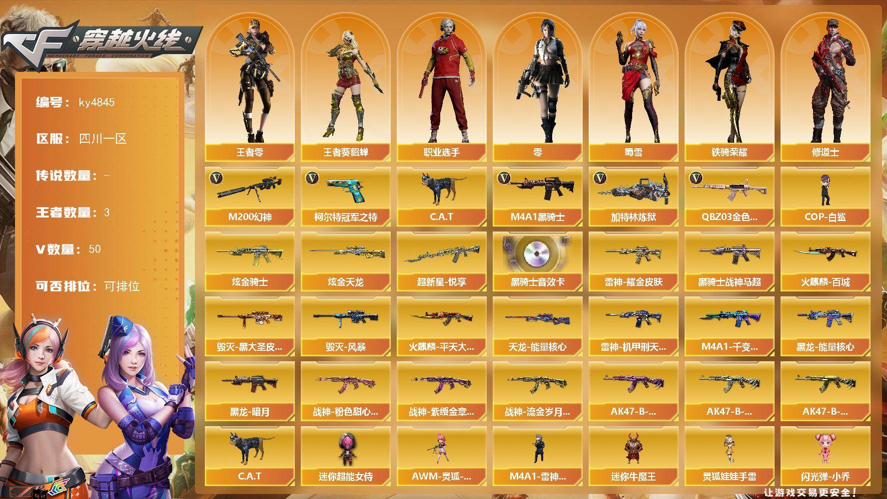 [17253957]四川一区-50V-3王者-2炫金 【热门武器】:QBZ03-金色蔷薇,M200-幻神,柯尔特-冠军之特,C.A.T,M4A1-黑骑士,加特林-炼狱,COP-白鲨 【王者炫金武器】:超新星-悦享,炫金骑士,炫金天龙 【音效卡】:M4A1-黑骑士音效卡 【皮肤】:雷神-耀金皮肤,雷神-机甲刑天皮肤,火麒麟-平天大圣,火麒麟-百城,毁灭-黑大圣皮肤,毁灭-风暴,M4A1-千变-孔明皮肤,黑龙-能量核心,黑龙-暗月,黑骑士-战神马超,战神-粉色甜心皮肤,战神-紫绶金章皮肤*3,战神-流金岁月皮肤*3,AK47-B-常胜将军-曹操*2,AK47-B-常胜将军-刘备,AK47-B-常胜将军-孙权*2,天龙-能量核心 【角色】:零,王者-葵-貂蝉,王者-零,修道士,初恋灵狐,芳心审判者,风暴女,嘉年华灵狐,娟娟,灵狐者-黄金海岸,灵狐者-七夕宝贝,龙儿,龙儿-小淘气,曼陀罗-X,潘多拉-X,潘多拉-甜心教官,邱刚敖,蜀雪,铁骑荣耀,兔囡囡,新娜塔莎,雪莉杨-摸金校尉,樱-战斗天使,影武者-X,职业选手,海豹突击队 【人偶武器】:COP-白鲨,M4A1-雷神-精英刀锋,迷你泡泡象,AWM-灵狐-15周年嘉年华,C.A.T,迷你牛魔王,闪光弹-小乔,闪光弹-貂蝉,高爆手雷-大乔,迷你超能女侍,灵狐娃娃手雷 【挑战大师】:AK47-冰龙粉碎者,激光毁灭者III-白马银枪 【英雄级武器】:M4A1-千变,AK47-火麒麟*3,M4A1-黑龙,M4A1-雷神*2,M4A1-黑骑士,AK47-黑武士,AK12-天启*2,AK47-机械迷城,AK47-黑鲨,M4A1-龙血,QBZ03-金色蔷薇,AK-47-猩红传说*2,AK47-B-战神,黑骑士-海王*2,AK47-B-常胜将军,AWM-天龙,Barrett-毁灭,M200-幻神,Barrett-朱雀,Barrett-金色蔷薇,加特林-炼狱,柯尔特-冠军之特,屠龙*2,擎天,擎天-竞技荣光,王者之击-觉醒版*2,高爆手雷-幻灵,高爆手雷-竞技荣光*3,闪光弹-幻灵,闪光弹-竞技荣光*4,烟雾弹-竞技荣光*2 【道具】:BS战队炫彩背包,CFS限定背包,炫彩背包,虎牙炫彩背包,超级背包,绿色巨人,灵魂忍者,迷雾幽灵,夺命之镰,防化服*2,金色流光-枪王排位*2,流光-鎏金之域,枪王排位28赛季金色流光,枪王排位29赛季金色流光,电玩兔兔表情,