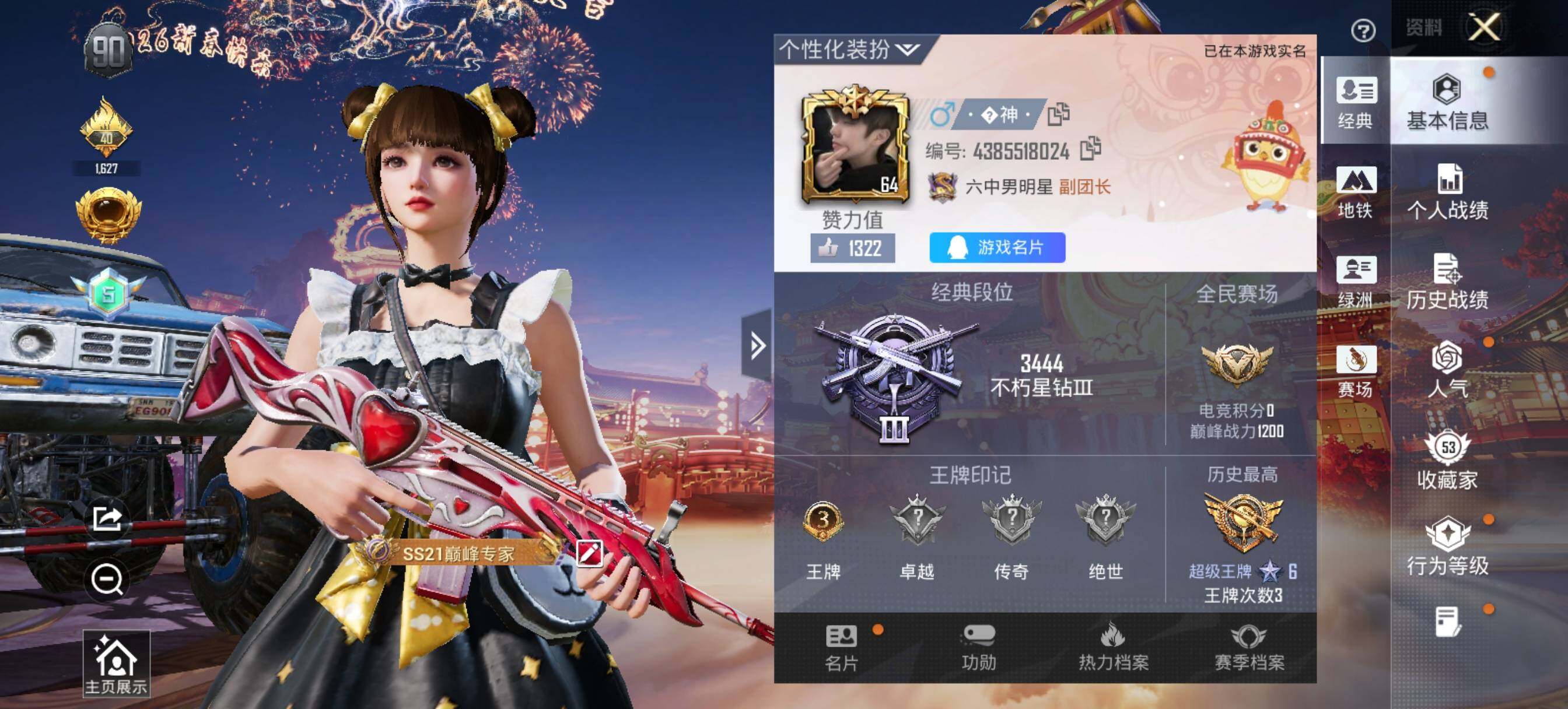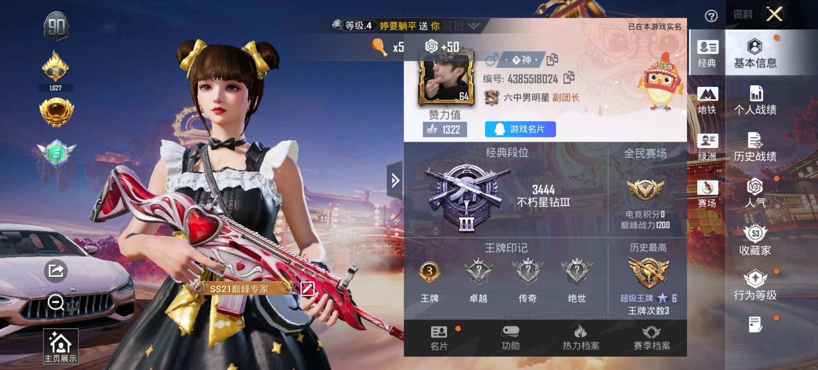 - [16906900]10英雄角色数-378英雄武器数 【王者系列】:王者之影,王者之魄,王者之心,王者之神,王者之锋,王者之迹,王者之蝶,王者之兽,王者之狱,王者之魂,王者幻神,王者之烈*2,王者之霆,王者之业,王者之誉,M4A1-雷霆王者,巴雷特-雷霆王者,M12S-雷霆王者,王者之尊 【热门武器】:KSG-孟获,CZS2-仲康,COP 357-安琪拉*2,AN94-盖,81式-光明之神,MK47-仁德,M4A1-七色宝葫,AK47-孟德,M4A1-仲达,AK47-奉先,M4A1-星象,M4A1-游骑兵,TAC-慈,VEPR12-本初,黑龙魂,81式-阿波罗,COP 357-雷霆*2 【角色】:葵,幽灵刀锋-觉醒,关小雨*2,晴雅,月神-X,甄梦,步练师*2 【英雄武器】:AK47-无影,AK47-火麒麟,AK47-机械迷城,AK47-孟德,AK47-猩红传说,AK47-燎天净火,AK47-奉先,AK47-黑鲨,AK47-木兰,AK47-谜城烟火*2,M4A1-雷神*2,M4A1-黑骑士*2,M4A1-死神,M4A1-游骑兵,M4A1-星象,M4A1-仲达,M4A1-竞界荣光,M4A1-七色宝葫,M4A1-机械迷城,M4A1-赛博雷神,M4A1-海骑士,M4A1-运输船*3,M4A1-猎神,M4A1-雷暴,M4A1-雷霆王者,M4A1-太白诗仙,M4A1-铁胆虎魄,SCAR-幽暗骑士*2,SCAR-幽暗骑士觉醒,SCAR Light-白虎,SCAR-探星者,SCAR-心动PICK,AN94-卷帘大将军,AN94-四凶觉醒,AN94-精卫填海,AN94-盖,AUG-机械纪元,FAMAS-湮灭,9A91-游骑兵,9A91-魔蜥觉醒,M14EBR-暗夜觉醒,M14EBR-天神,M14EBR-拂影,M14EBR-玄武,M14EBR-葫芦山庄,M16-恶魔,AK12-天启,QBZ03-金色蔷薇*2,QBZ03-死神,QBZ03-玉面羞花,HK416-极光,HK417-炎龙铠甲,81式-光明之神,QBZ19-天使*2,G36-李星云,MK47-云舞,MK47-仁德,G3A3-衍神兵*2,FN F2000-十绝阵觉醒,QBZ97-岚舞,QBZ97-浩瀚征途,QBZ191-金甲虎啸觉醒,QBZ191-封神榜,AWM-天龙,AWM-裁决,AWM-大湾溢彩,巴雷特-毁灭*6,巴雷特-极光*6,巴雷特-
