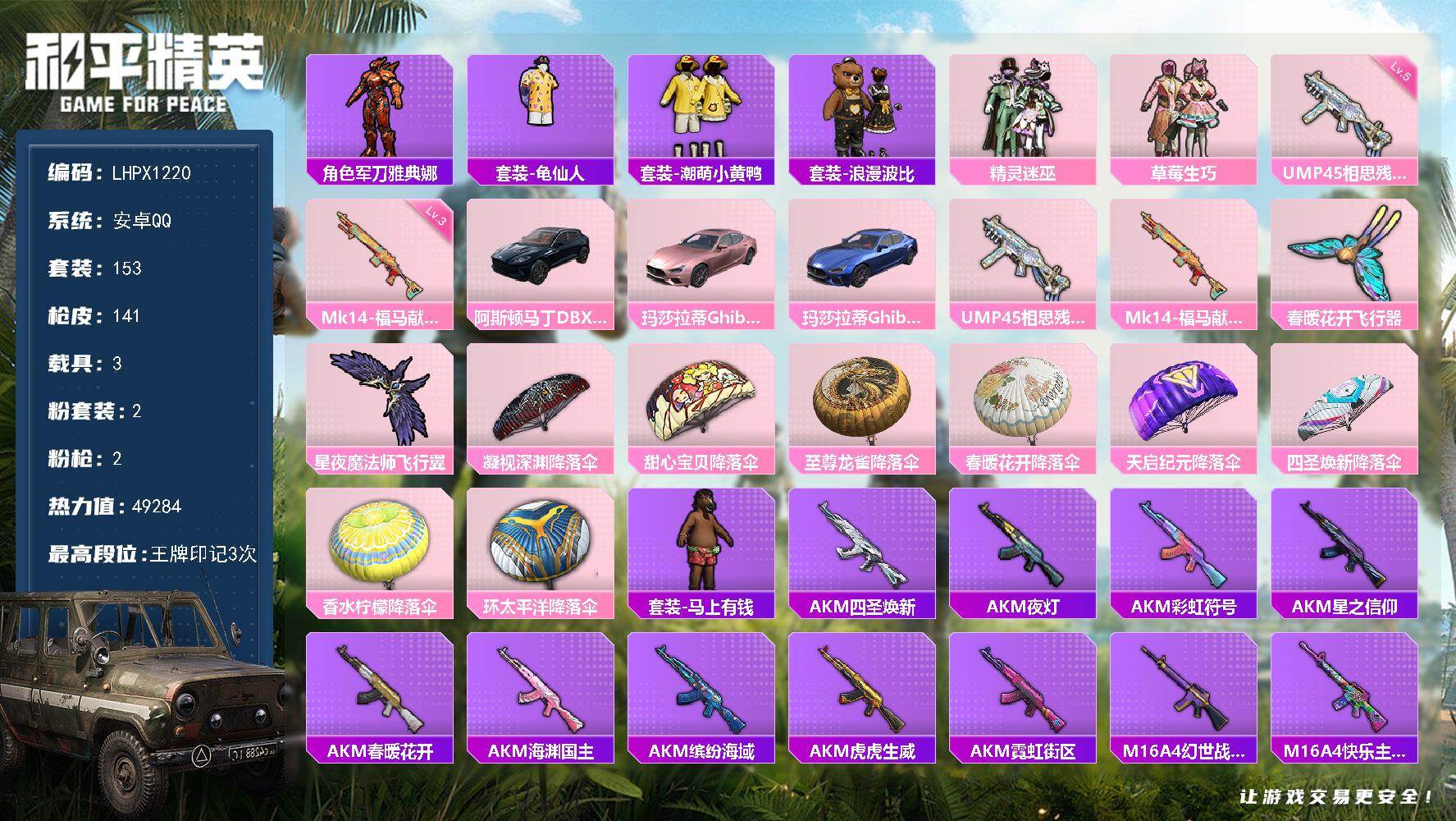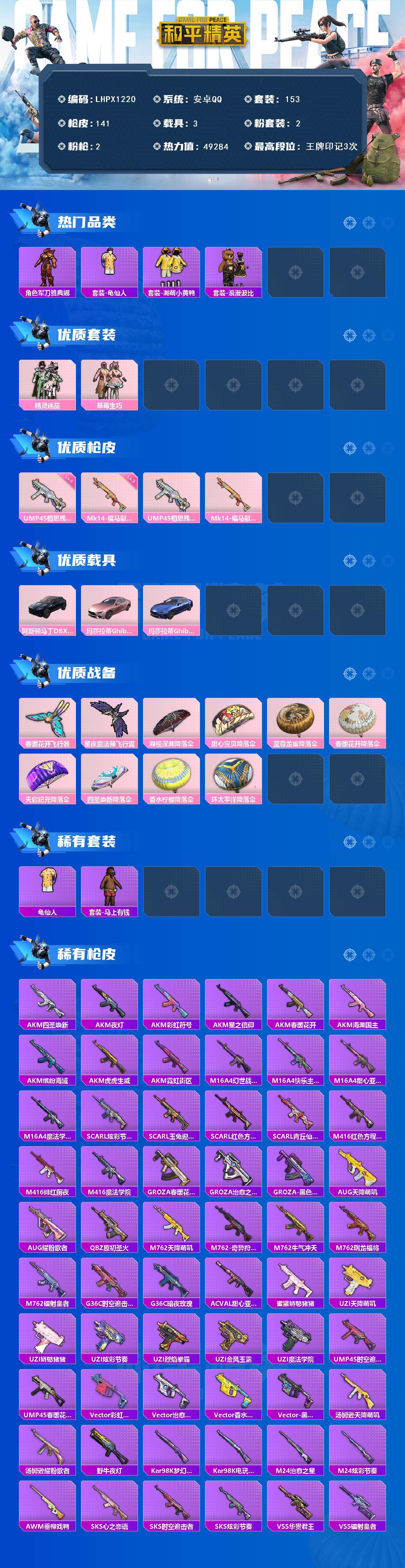 [17254310]可二次【特价出售/店主推荐】安卓 手Q-2粉装-2特效枪-3载具-2粉色飞行器-49284热力值-3王牌印记-153套装-141枪皮 【热门品类】:角色-军刀雅典娜,套装-龟仙人,套装-潮萌小黄鸭,套装-浪漫波比 【粉色套装】:粉装-精灵迷巫,粉装-草莓生巧 【粉色枪皮等级】:UMP45-相思残雪(五级),Mk14-福马献瑞(三级) 【粉色载具】:阿斯顿马丁DBX(蓝),玛莎拉蒂Ghibli(粉),玛莎拉蒂Ghibli(蓝) 【粉色枪皮】:UMP45-相思残雪,Mk14-福马献瑞 【粉色飞行器】:春暖花开飞行器,星夜魔法师飞行翼 【粉色降落伞】:凝视深渊降落伞,甜心宝贝降落伞,至尊龙雀降落伞,春暖花开降落伞,天启纪元降落伞,四圣焕新降落伞,香水柠檬降落伞,环太平洋降落伞 【稀有套装】:套装-龟仙人,套装-马上有钱 【稀有枪皮】:AKM-四圣焕新,AKM-夜灯,AKM-彩虹符号,AKM-星之信仰,AKM-春暖花开,AKM-海渊国主,AKM-缤纷海域,AKM-虎虎生威,AKM-霓虹街区,M16A4-幻世战舞者,M16A4-快乐主宰,M16A4-甜心亚梦,M16A4-魔法学院,SCAR-L-炫彩节奏,SCAR-L-玉兔迎春,SCAR-L-红色方程式,SCAR-L-青丘仙客,M416-红色方程式,M416-绯红前夜,M416-魔法学院,GROZA-春暖花开,GROZA-治愈之星,GROZA-黑色刀锋,AUG-天降萌叽,AUG-耀粉歌者,QBZ-原初圣火,M762-天降萌叽,M762-奇异狩猎者,M762-牛气冲天,M762-瑞龙福将,M762-镭射皇者,G36C-时空追击者,G36C-暗夜玫瑰,AC-VAL-甜心亚梦,蜜獾-娇憨猪猪,UZI-天降萌叽,UZI-娇憨猪猪,UZI-炫彩节奏,UZI-烈焰拳霸,UZI-金风玉露,UZI-魔法学院,UMP45-时空追击者,UMP45-春暖花开,Vector-彩虹符号,Vector-治愈之星,Vector-香水柠檬,Vector-黑色刀锋,汤姆逊-天降萌叽,汤姆逊-耀粉歌者,野牛-夜灯,Kar98K-梦幻火箭,Kar98K-电玩视界,M24-治愈之星,M24-炫彩节奏,AWM-垂柳戏鸭,SKS-心之恋语,SKS-时空追击者,SKS-炫彩节奏,VSS-华贵君王,VSS-镭射皇者,VSS-黑色刀锋,Mini14-原初圣火,Mini14-