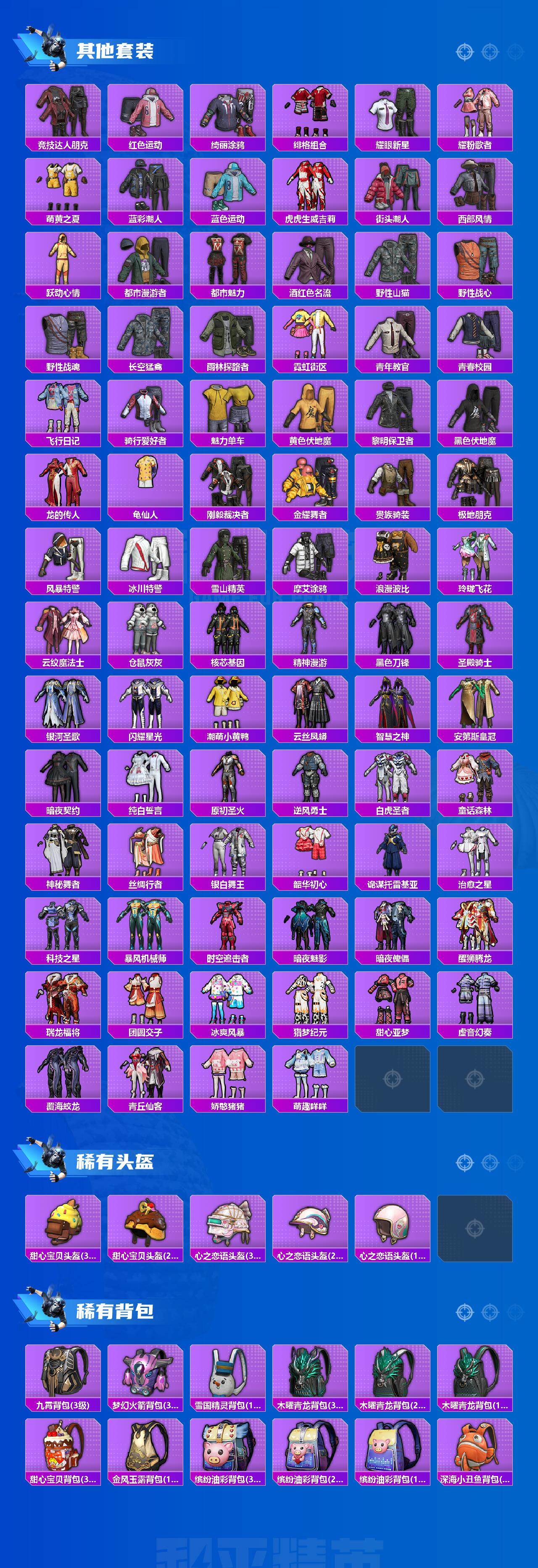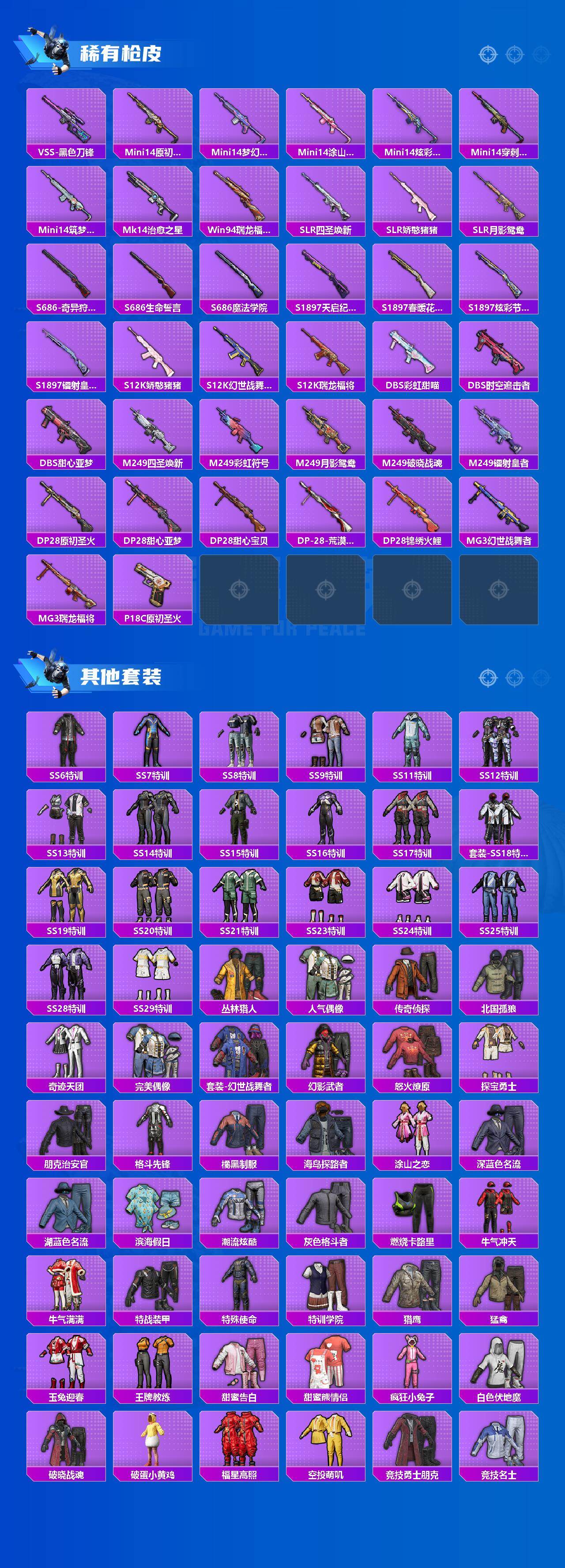 【稀有枪皮】:AKM-四圣焕新,AKM-夜灯,AKM-彩虹符号,AKM-星之信仰,AKM-春暖花开,AKM-海渊国主,AKM-缤纷海域,AKM-虎虎生威,AKM-霓虹街区,M16A4-幻世战舞者,M16A4-快乐主宰,M16A4-甜心亚梦,M16A4-魔法学院,SCAR-L-炫彩节奏,SCAR-L-玉兔迎春,SCAR-L-红色方程式,SCAR-L-青丘仙客,M416-红色方程式,M416-绯红前夜,M416-魔法学院,GROZA-春暖花开,GROZA-治愈之星,GROZA-黑色刀锋,AUG-天降萌叽,AUG-耀粉歌者,QBZ-原初圣火,M762-天降萌叽,M762-奇异狩猎者,M762-牛气冲天,M762-瑞龙福将,M762-镭射皇者,G36C-时空追击者,G36C-暗夜玫瑰,AC-VAL-甜心亚梦,蜜獾-娇憨猪猪,UZI-天降萌叽,UZI-娇憨猪猪,UZI-炫彩节奏,UZI-烈焰拳霸,UZI-金风玉露,UZI-魔法学院,UMP45-时空追击者,UMP45-春暖花开,Vector-彩虹符号,Vector-治愈之星,Vector-香水柠檬,Vector-黑色刀锋,汤姆逊-天降萌叽,汤姆逊-耀粉歌者,野牛-夜灯,Kar98K-梦幻火箭,Kar98K-电玩视界,M24-治愈之星,M24-炫彩节奏,AWM-垂柳戏鸭,SKS-心之恋语,SKS-时空追击者,SKS-炫彩节奏,VSS-华贵君王,VSS-镭射皇者,VSS-黑色刀锋,Mini14-原初圣火,Mini14-