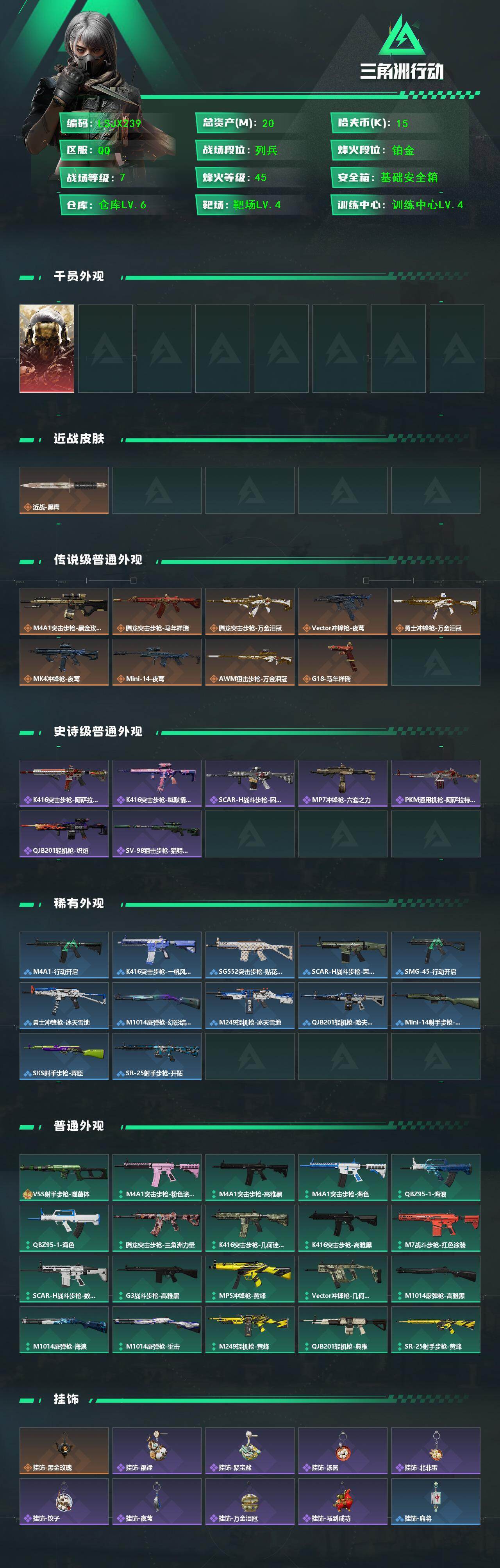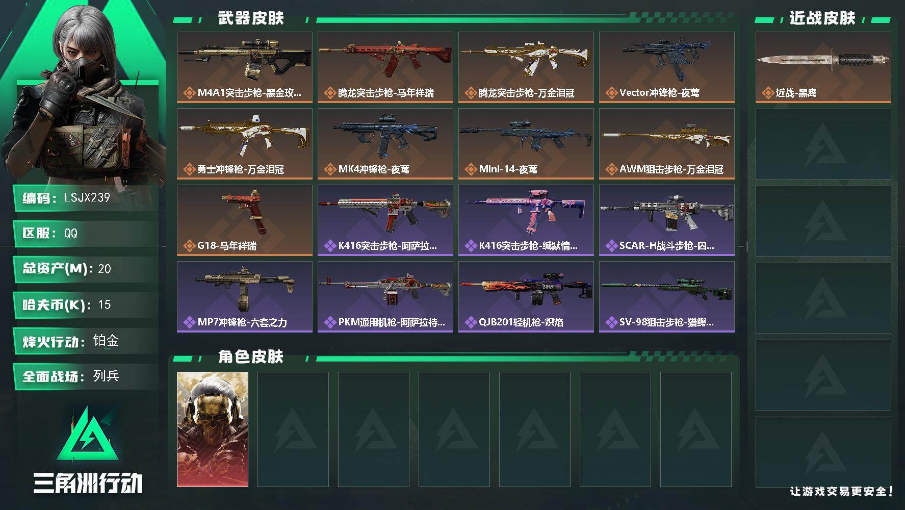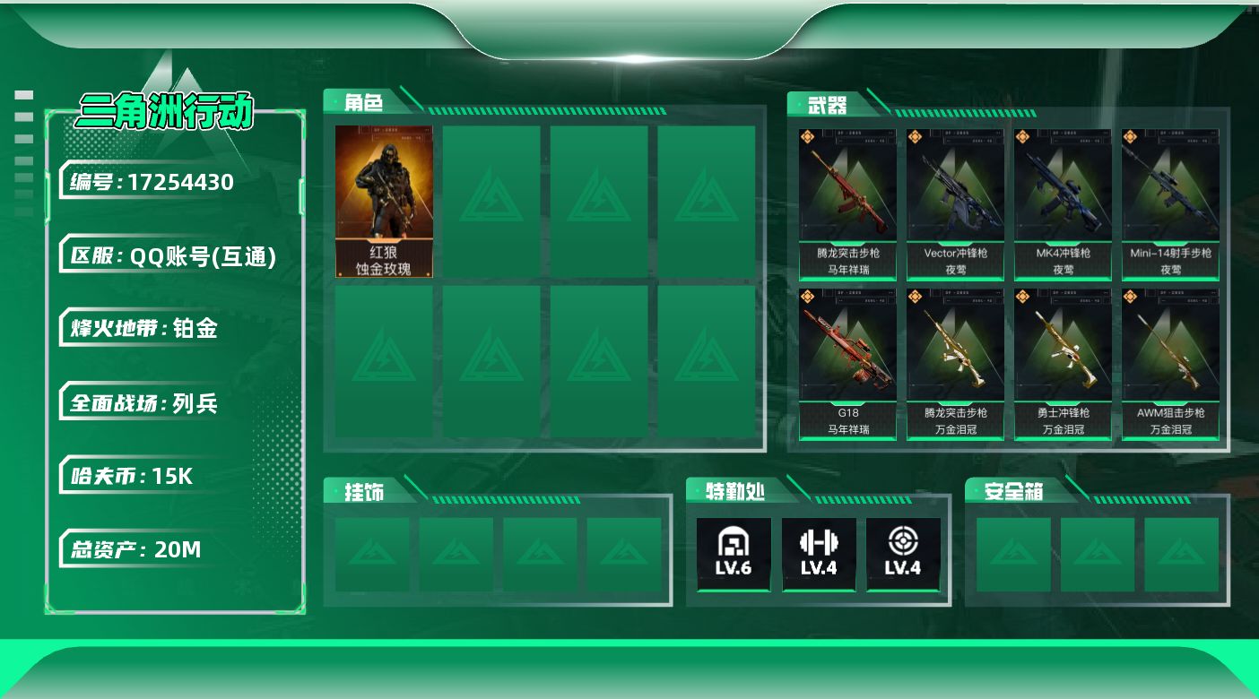 [17254430]【特价出售/店主推荐】20m总资产-15k哈伏币-45烽火等级-铂金-7战场等级-列兵 【干员外观】:红狼-蚀金玫瑰 【近战皮肤】:近战-黑鹰 【传说外观】:M4A1突击步枪-蚀金玫瑰,腾龙突击步枪-马年祥瑞,腾龙突击步枪-万金泪冠,Vector冲锋枪-夜莺,勇士冲锋枪-万金泪冠,MK4冲锋枪-夜莺,Mini-14射手步枪-夜莺,AWM狙击步枪-万金泪冠,G18-马年祥瑞 【史诗外观】:K416突击步枪-阿萨拉特攻,K416突击步枪-缄默情歌,SCAR-H战斗步枪-囚徒,MP7冲锋枪-六套之力,PKM通用机枪-阿萨拉特攻,QJB201轻机枪-炽焰,SV-98狙击步枪-猎鳄行动 【稀有外观】:M4A1突击步枪-行动开启,K416突击步枪-一帆风顺,SG552突击步枪-贴花艺术,SCAR-H战斗步枪-荣耀列队,SMG-45冲锋枪-行动开启,勇士冲锋枪-冰天雪地,M1014霰弹枪-幻影结构,M249轻机枪-冰天雪地,QJB201轻机枪-哈夫克卫队,Mini-14射手步枪-荣耀列队,SKS射手步枪-弄臣,SR-25射手步枪-开拓 【普通外观】:VSS射手步枪-噬菌体,M4A1突击步枪-粉色涂装,M4A1突击步枪-高雅黑,M4A1突击步枪-海色,QBZ95-1突击步枪-海浪,QBZ95-1突击步枪-海色,腾龙突击步枪-三角洲力量,K416突击步枪-几何迷彩,K416突击步枪-高雅黑,M7战斗步枪-红色涂装,SCAR-H战斗步枪-数码迷彩,G3战斗步枪-高雅黑,MP5冲锋枪-黄蜂,Vector冲锋枪-几何迷彩,M1014霰弹枪-高雅黑,M1014霰弹枪-海浪,M1014霰弹枪-重击,M249轻机枪-黄蜂,QJB201轻机枪-典雅,SR-25射手步枪-黄蜂 【挂饰】:挂饰-蚀金玫瑰,挂饰-福禄,挂饰-聚宝盆,挂饰-汤圆,挂饰-北非蛋,挂饰-饺子,挂饰-夜莺,挂饰-万金泪冠,挂饰-马到成功,挂饰-麻将*5