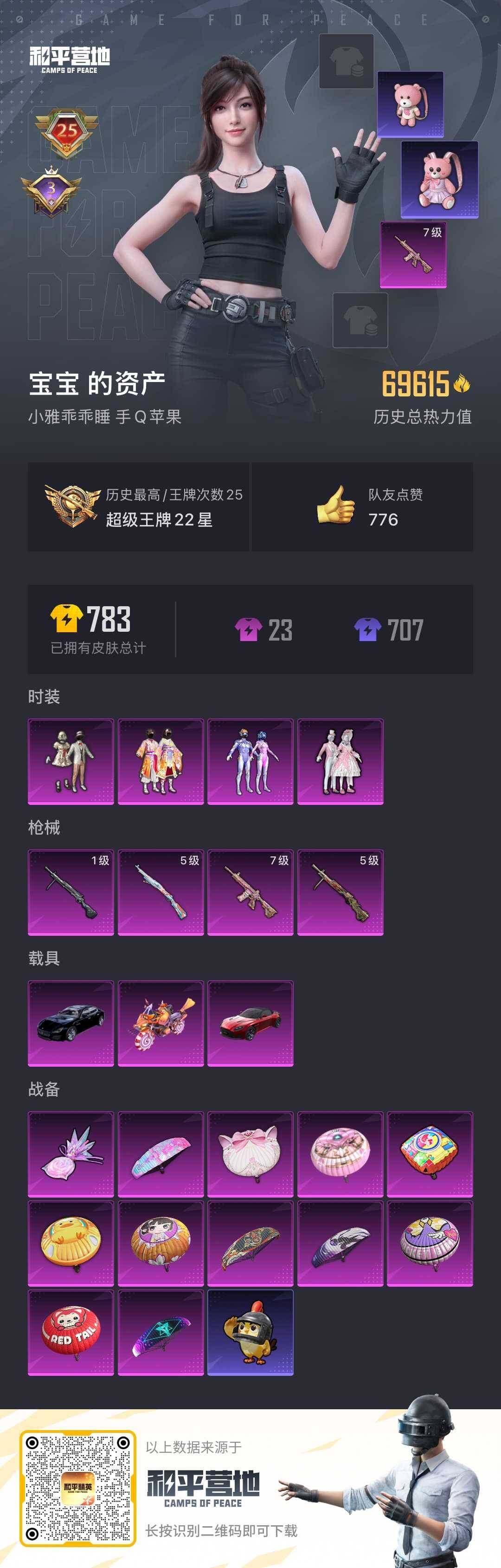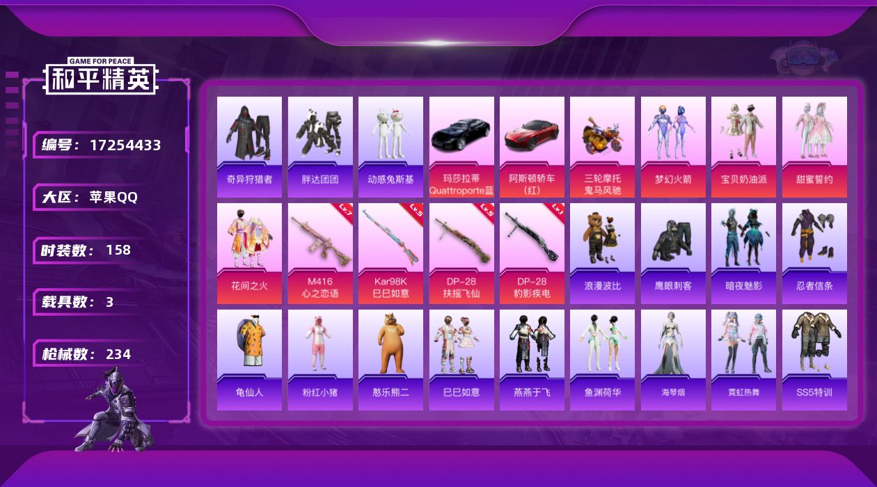 [17254433]可二次【特价出售/店主推荐】苹果 手Q-4粉装-4特效枪-3载具-1粉色飞行器-69615热力值-25王牌印记-158套装-234枪皮