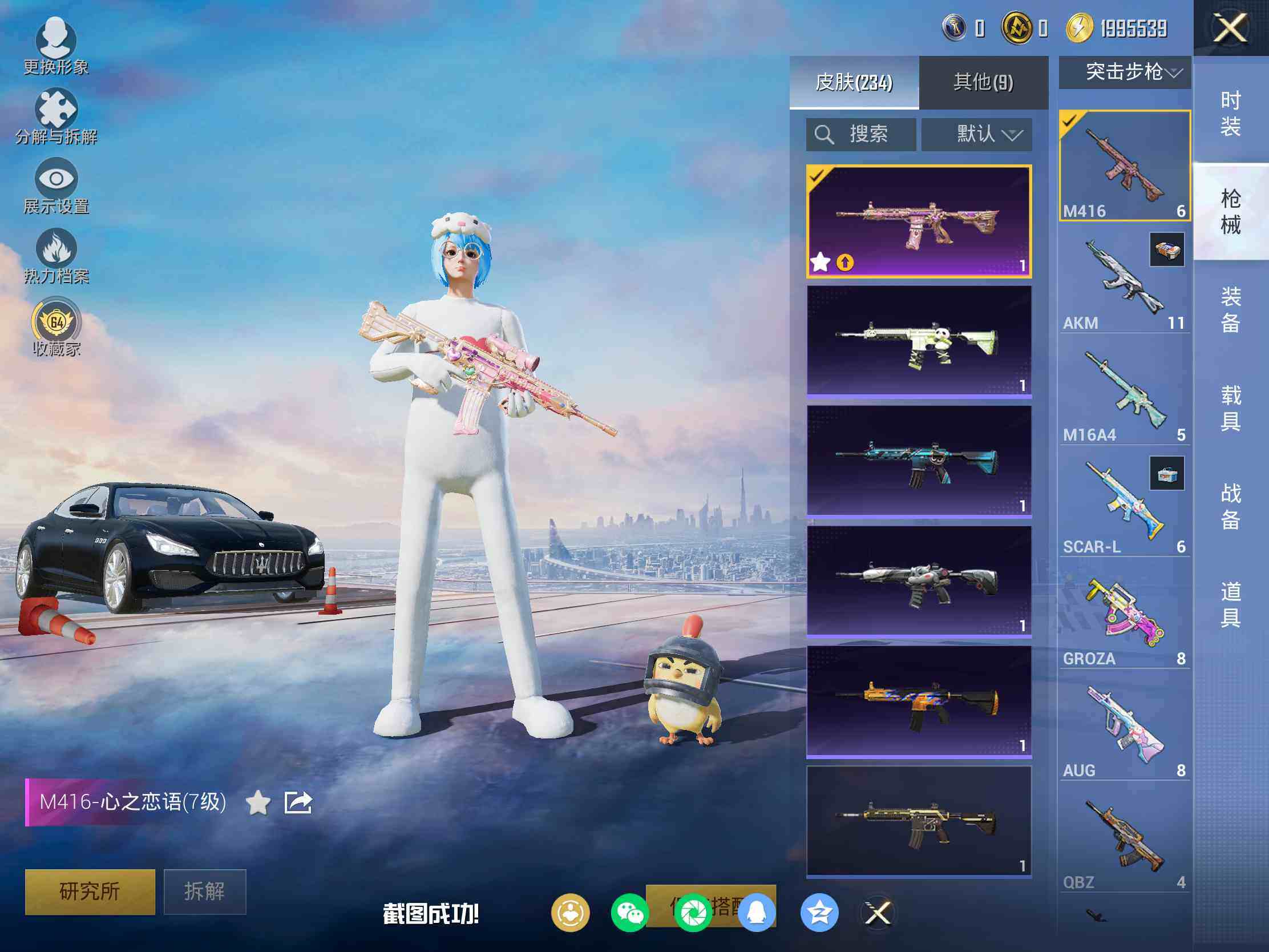 【粉色枪皮等级】:M416-心之恋语(七级),Kar98K-巳巳如意(五级),DP-28-扶摇飞仙(五级),DP-28-豹影疾电(一级)