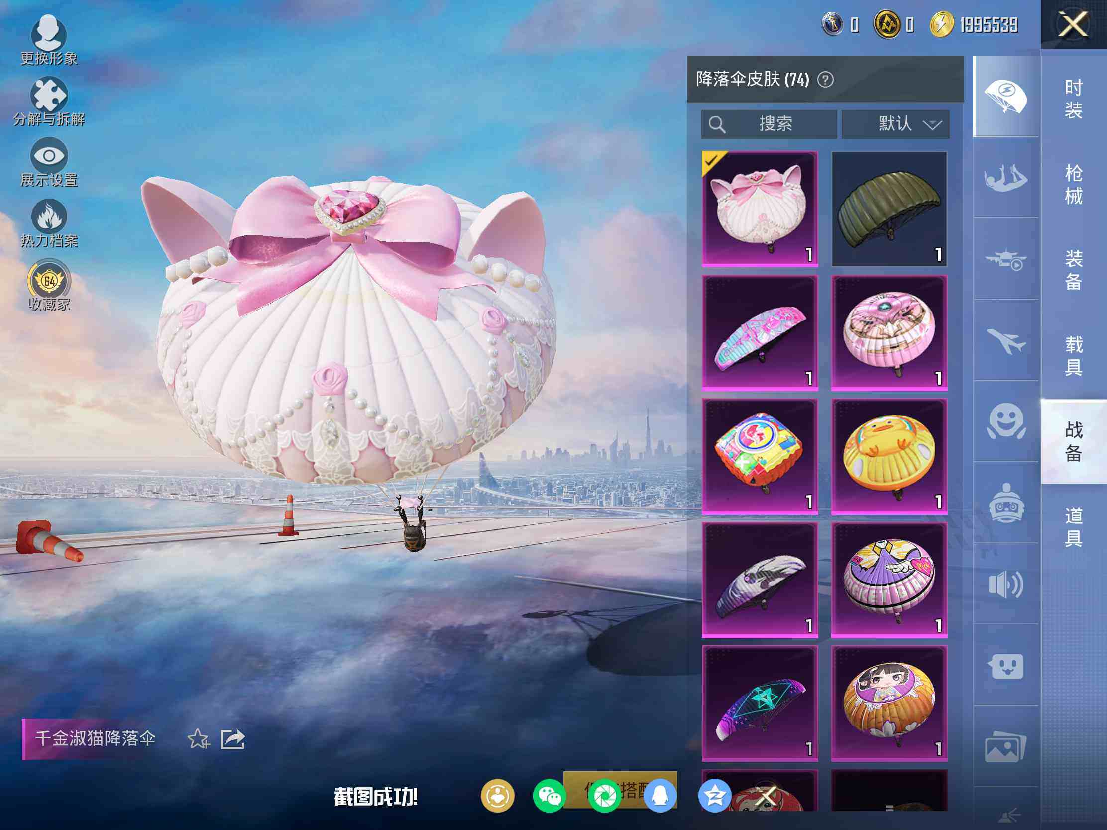 【粉色降落伞】:幻影战神降落伞,梦幻火箭降落伞,花间之火降落伞,诡面斩降落伞,阿狸红降落伞,葫芦兄弟降落伞,垂柳戏鸭降落伞,炫光之旅降落伞,守护天翼降落伞,千金淑猫降落伞,炫彩糖果降落伞