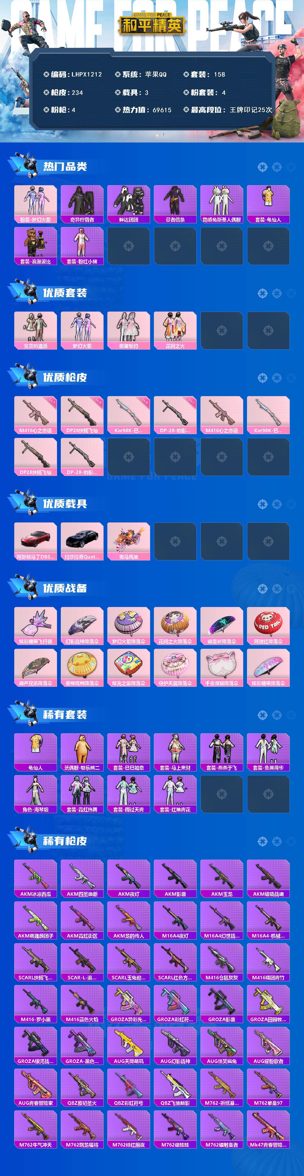 [17254433]可二次【特价出售/店主推荐】苹果 手Q-4粉装-4特效枪-3载具-1粉色飞行器-69615热力值-25王牌印记-158套装-234枪皮 【热门品类】:粉装-梦幻火箭,套装-奇异狩猎者,套装-胖达团团,套装-忍者信条,套装-动感兔斯基人偶服,套装-龟仙人,套装-浪漫波比,套装-粉红小猪 【粉色套装】:粉装-宝贝奶油派,粉装-梦幻火箭,粉装-甜蜜誓约,粉装-花间之火 【粉色枪皮等级】:M416-心之恋语(七级),Kar98K-巳巳如意(五级),DP-28-扶摇飞仙(五级),DP-28-豹影疾电(一级) 【粉色载具】:阿斯顿马丁DBS(红),玛莎拉蒂Quattroporte(夜幕蓝),鬼马风驰 【粉色枪皮】:M416-心之恋语,Kar98K-巳巳如意,DP-28-扶摇飞仙,DP-28-豹影疾电 【粉色飞行器】:炫彩糖果飞行器 【粉色降落伞】:幻影战神降落伞,梦幻火箭降落伞,花间之火降落伞,诡面斩降落伞,阿狸红降落伞,葫芦兄弟降落伞,垂柳戏鸭降落伞,炫光之旅降落伞,守护天翼降落伞,千金淑猫降落伞,炫彩糖果降落伞 【稀有套装】:套装-龟仙人,玩偶服-憨乐熊二,套装-巳巳如意,套装-炫彩糖果,套装-马上来财,套装-燕燕于飞,套装-鱼渊荷华,角色-海琴烟,套装-霓虹热舞,套装-雨过天青,套装-红釉青花 【稀有枪皮】:AUG-冰晶雪宝,AKM-冰凉西瓜,AKM-四圣焕新,AKM-夜灯,AKM-影袭,AKM-玉龙,AKM-破晓战魂,AKM-萌趣颜团子,AKM-霓虹街区,AKM-龙的传人,M16A4-夜灯,M16A4-幻世战舞者,M16A4-机械英豪,SCAR-L-扶摇飞仙,SCAR-L-浪客战士,SCAR-L-玉兔迎春,SCAR-L-红色方程式,M416-仓鼠灰灰,M416-糯团青竹,M416-罗小黑,M416-蓝色火焰,GROZA-异彩先驱,GROZA-彩虹符号,GROZA-影袭,GROZA-田园牧歌,GROZA-银河战甲,GROZA-黑色刀锋,AUG-天降萌叽,AUG-幻影战神,AUG-怪笑疯兔,AUG-耀粉歌者,AUG-青春冒险家,QBZ-原初圣火,QBZ-彩虹符号,QBZ-飞驰魅影,M762-折纸暴龙,M762-拳皇97,M762-牛气冲天,M762-瑞龙福将,M762-绯红前夜,M762-诡娃娃,M762-镭射皇者,Mk47-青春冒险家,Mk47-虹云熊熊,G36C-时空