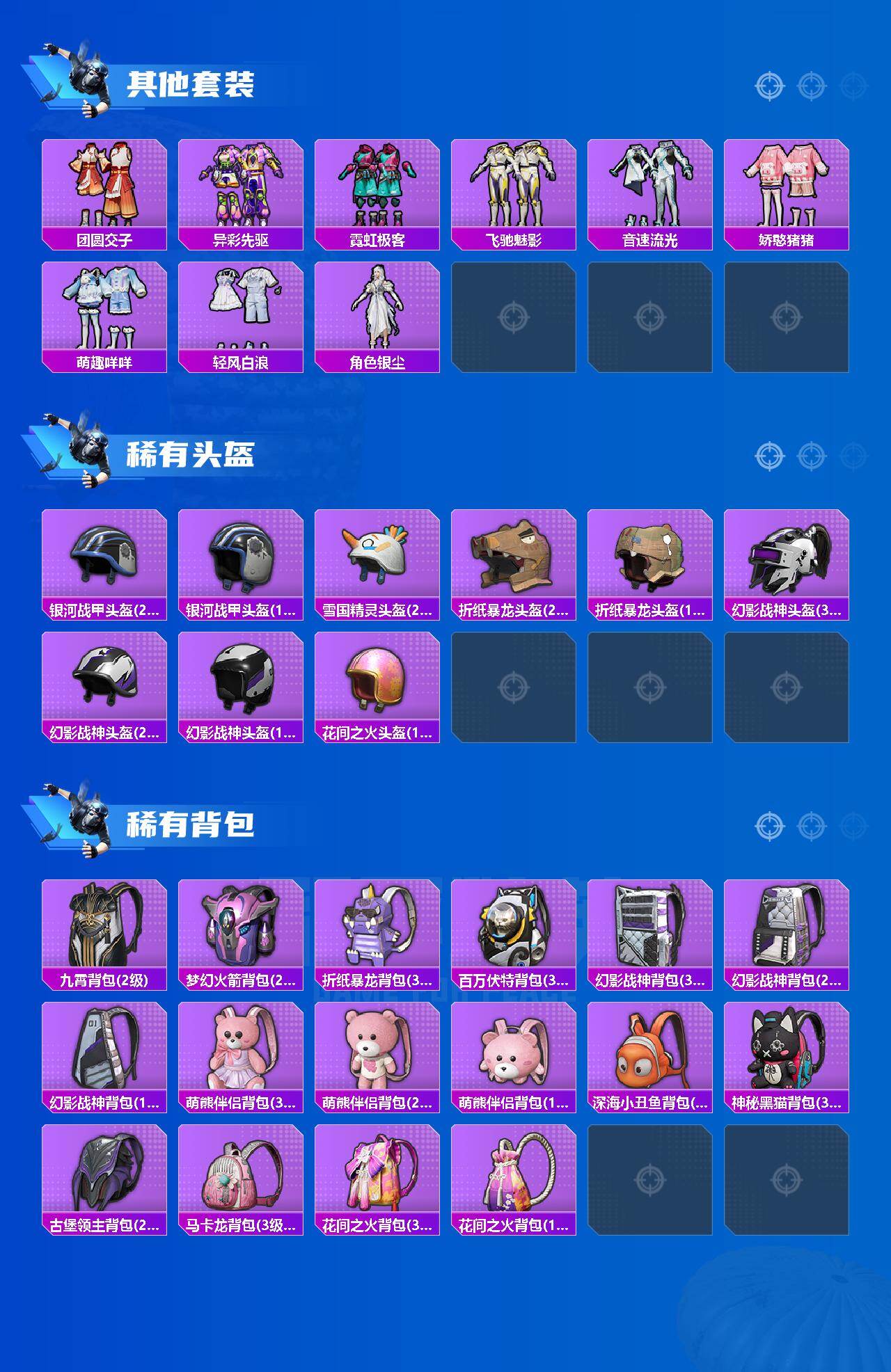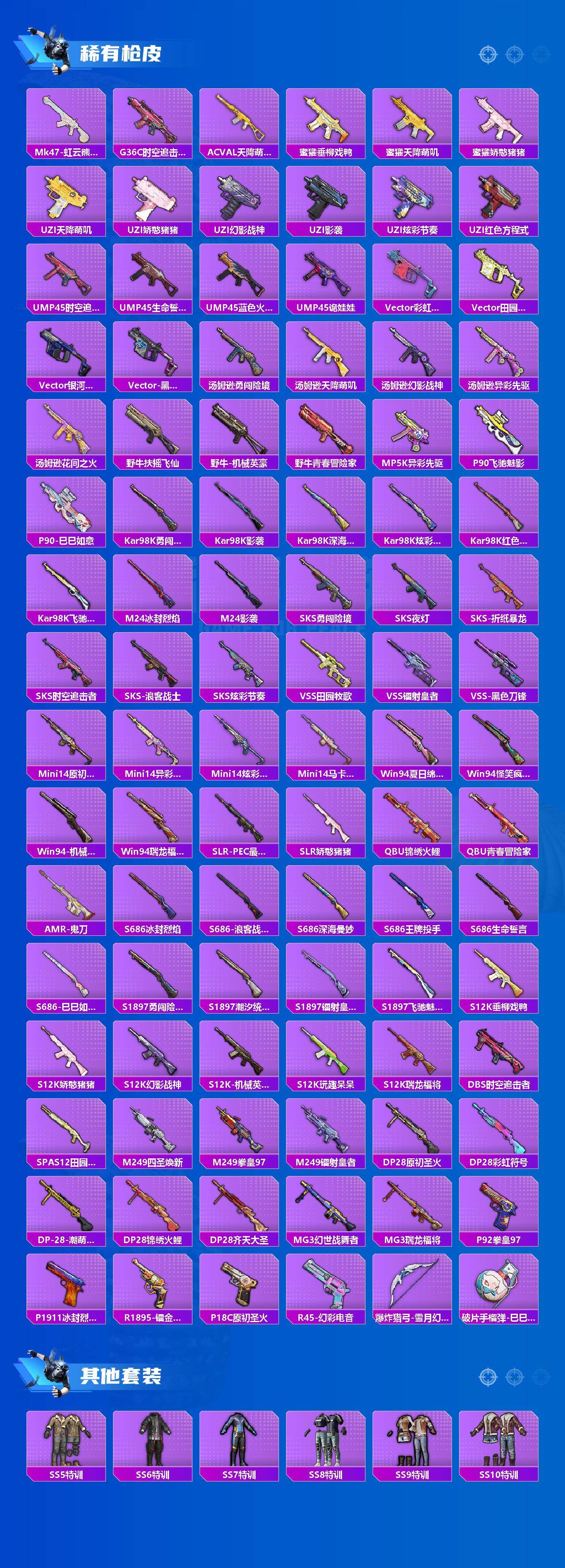 【稀有枪皮】:AUG-冰晶雪宝,AKM-冰凉西瓜,AKM-四圣焕新,AKM-夜灯,AKM-影袭,AKM-玉龙,AKM-破晓战魂,AKM-萌趣颜团子,AKM-霓虹街区,AKM-龙的传人,M16A4-夜灯,M16A4-幻世战舞者,M16A4-机械英豪,SCAR-L-扶摇飞仙,SCAR-L-浪客战士,SCAR-L-玉兔迎春,SCAR-L-红色方程式,M416-仓鼠灰灰,M416-糯团青竹,M416-罗小黑,M416-蓝色火焰,GROZA-异彩先驱,GROZA-彩虹符号,GROZA-影袭,GROZA-田园牧歌,GROZA-银河战甲,GROZA-黑色刀锋,AUG-天降萌叽,AUG-幻影战神,AUG-怪笑疯兔,AUG-耀粉歌者,AUG-青春冒险家,QBZ-原初圣火,QBZ-彩虹符号,QBZ-飞驰魅影,M762-折纸暴龙,M762-拳皇97,M762-牛气冲天,M762-瑞龙福将,M762-绯红前夜,M762-诡娃娃,M762-镭射皇者,Mk47-青春冒险家,Mk47-虹云熊熊,G36C-时空