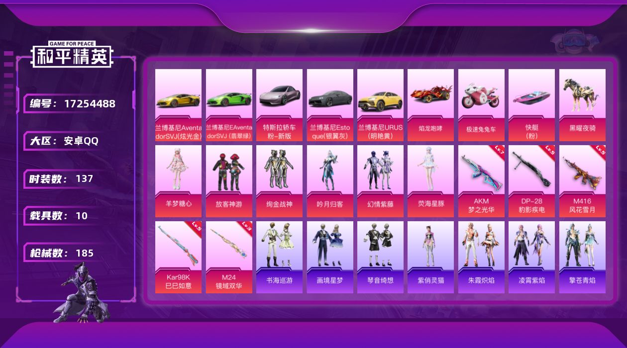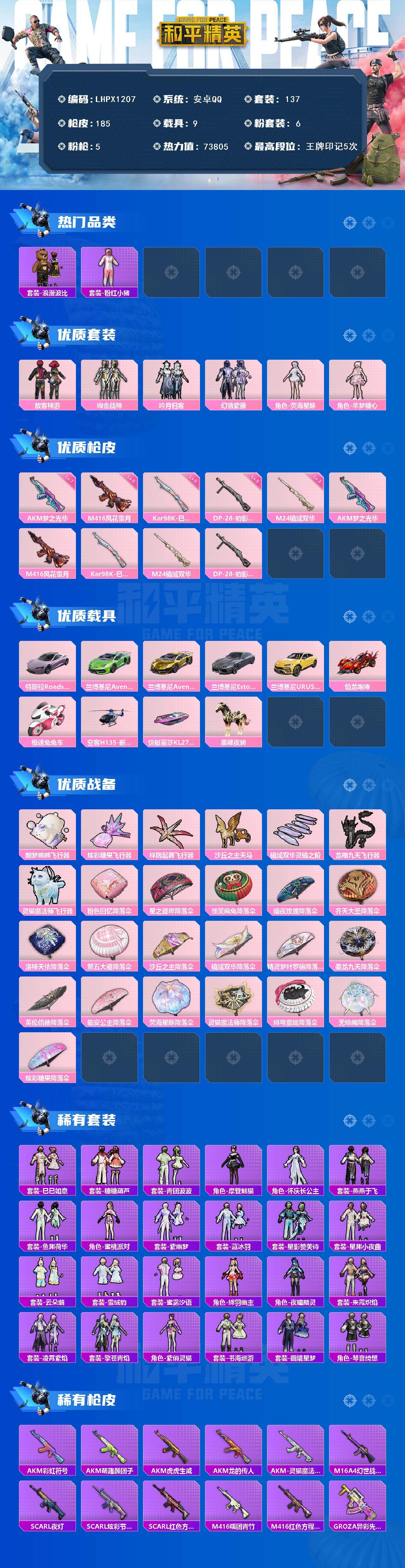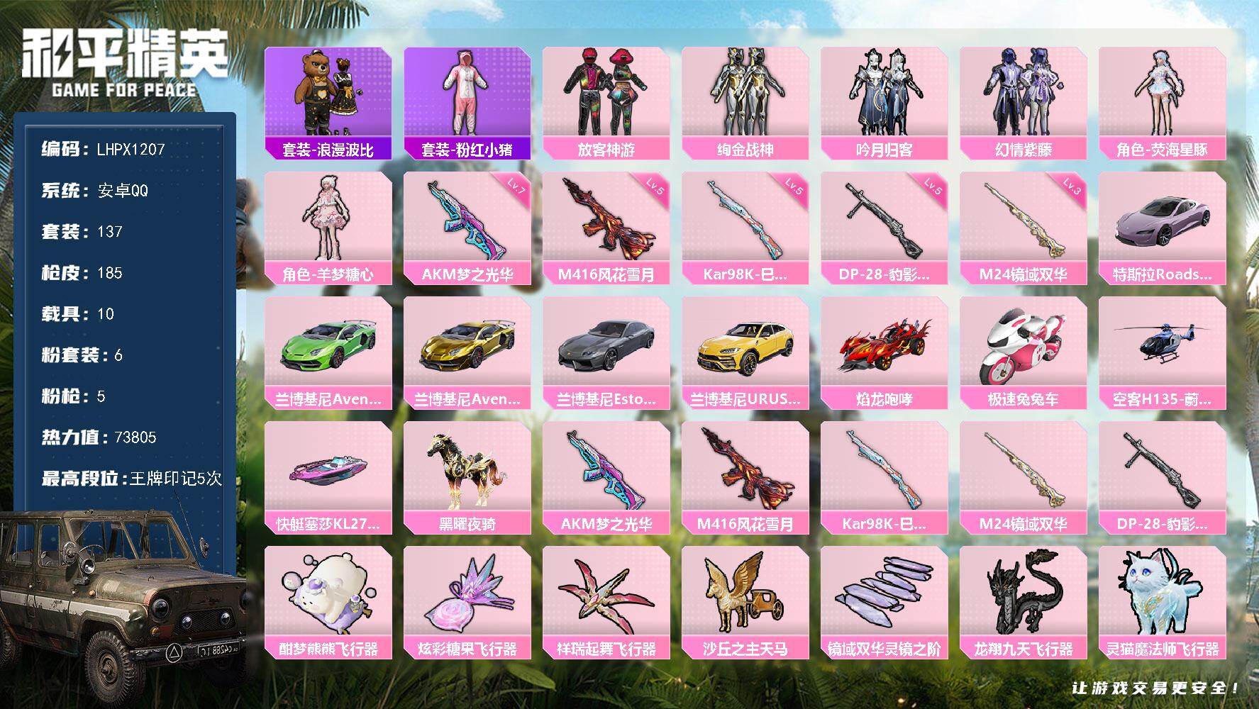 [17254488]可二次【特价出售/店主推荐】安卓 手Q-6粉装-5特效枪-10载具-7粉色飞行器-73805热力值-5王牌印记-137套装-185枪皮
