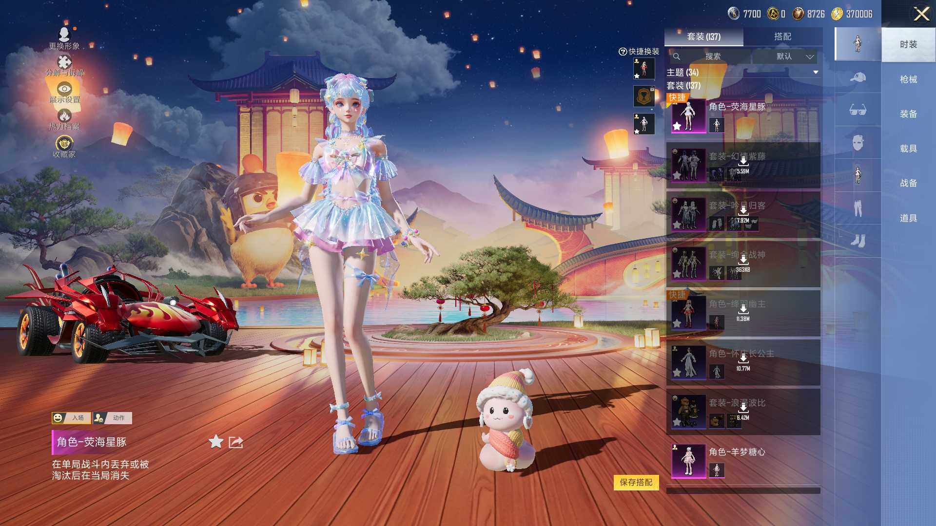 【粉色套装】:粉装-放客神游,粉装-绚金战神,粉装-吟月归客,粉装-幻情紫藤,角色-荧海星豚,角色-羊梦糖心