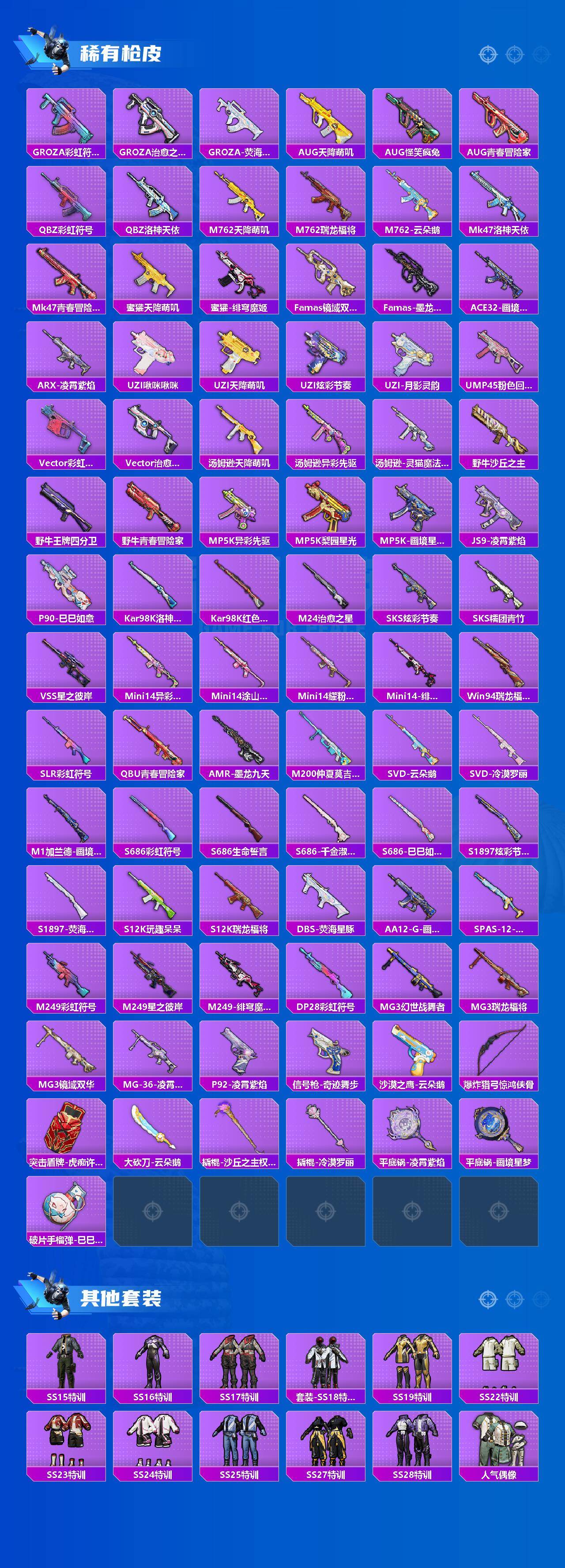 【稀有枪皮】:AUG-冰晶雪宝,AKM-彩虹符号,AKM-萌趣颜团子,AKM-虎虎生威,AKM-龙的传人,AKM-灵猫魔法师,M16A4-幻世战舞者,SCAR-L-夜灯,SCAR-L-炫彩节奏,SCAR-L-红色方程式,M416-糯团青竹,M416-红色方程式,GROZA-异彩先驱,GRO