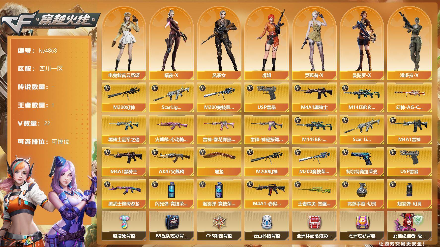 [17254537]四川一区-22V-1王者-0炫金 【热门武器】:M14EBR-玄武,Scar Light-白虎,M200-幻神,M200-竞技荣光,M4A1-黑骑士,USP-雷暴 【皮肤】:幻神-AG-CFPL S24冠军 皮肤,雷神-春花弄影 皮肤,雷神-神秘按键 皮肤,火麒麟-心动糖果,黑骑士-冠军之势 【角色】:电竞教官-云悠悠,暗夜-X,风暴女,虎妞,灵狐者-X,曼陀罗-X,潘多拉-X,游珑儿 【英雄级武器】:AK47-火麒麟,M4A1-雷神,M4A1-黑骑士,Scar Light-白虎,M14EBR-玄武,黑武士-锦绣游龙,M200-幻神,M200-竞技荣光,王者森决-觉醒版,USP-雷暴,柯尔特-竞技荣光,屠龙,高爆手雷-幻灵*2,闪光弹-竞技荣光,烟雾弹-幻灵,烟雾弹-竞技荣光*5,M4A1-赤狱骑士 【道具】:泡泡象背包,BS战队炫彩背包,CFS限定背包,云山科技背包,亚洲杯纪念炫彩背包,虎牙炫彩背包,哔哩哔哩名片,女皇终结者-魔龙之吻,救世主-黑桃战神,绿色巨人,灵魂忍者,迷雾幽灵,夺命之镰,防化服*3,金色流光-枪王排位*2,星辰流光-枪王排位,EP战队名片,EP战队喷图,防弹头盔*5,防弹衣*4,C4工具钳*3,手雷包*3 【特殊枪械】:1白虎,1黑骑士
