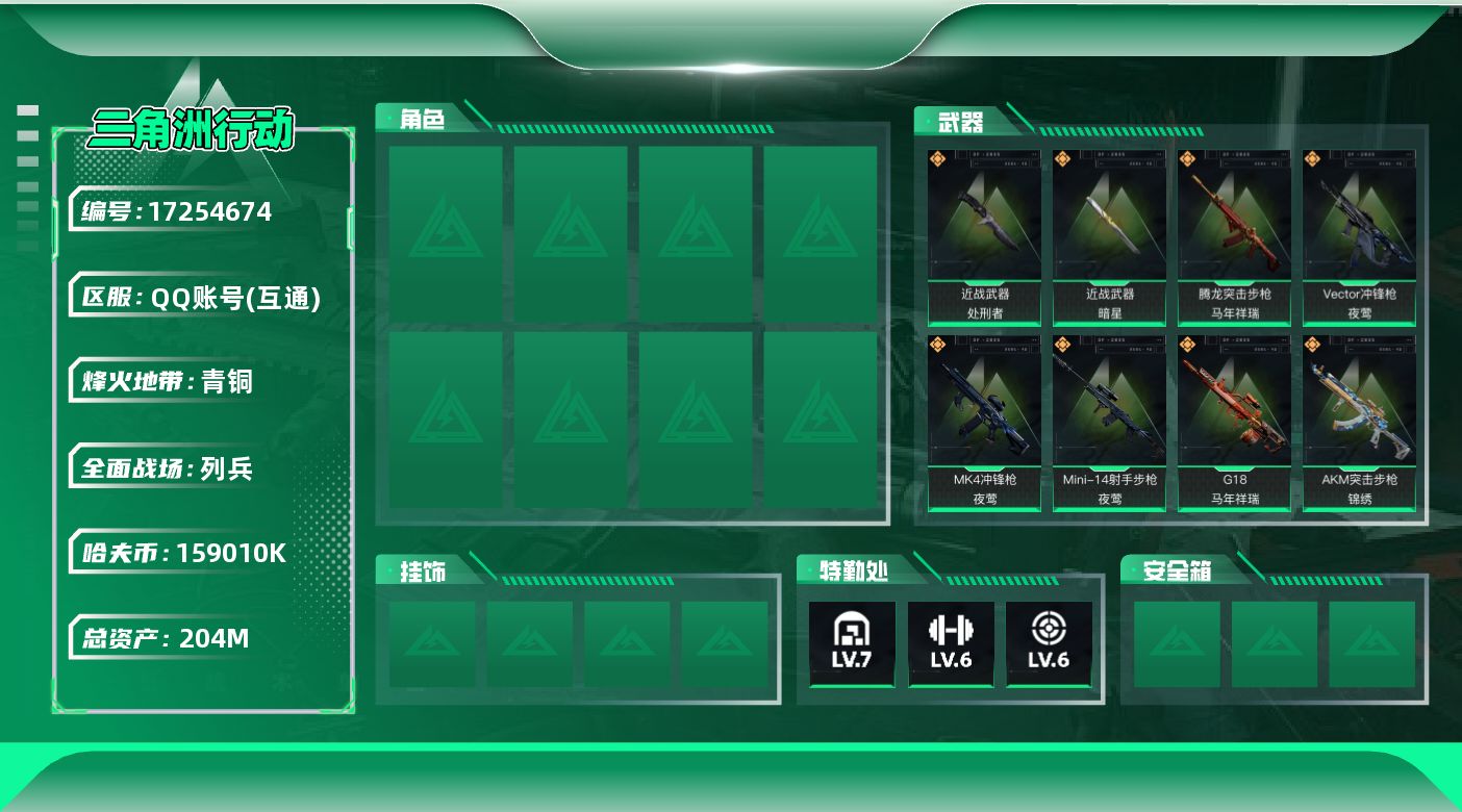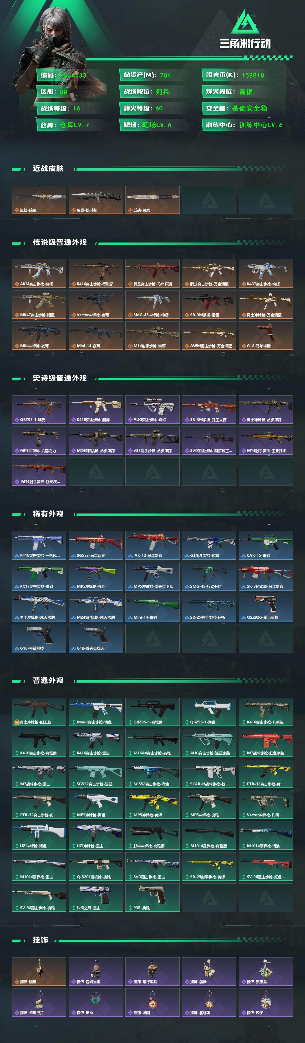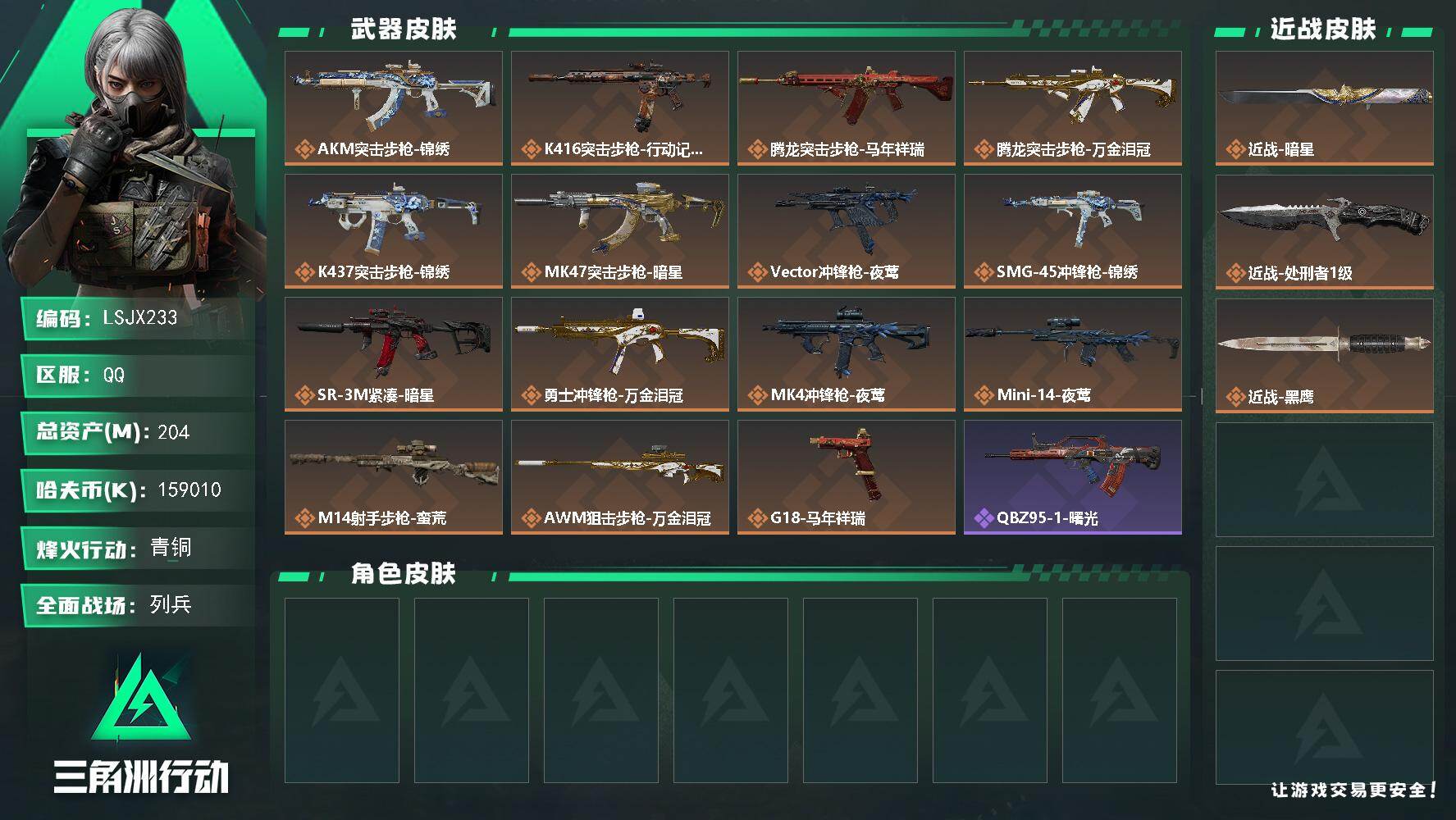 [17254674]【特价出售/店主推荐】204m总资产-159010k哈伏币-60烽火等级-青铜-16战场等级-列兵 【近战皮肤】:近战-暗星,近战-处刑者,近战-黑鹰 【传说外观】:AKM突击步枪-锦绣,K416突击步枪-行动记录,腾龙突击步枪-马年祥瑞,腾龙突击步枪-万金泪冠,K437突击步枪-锦绣,MK47突击步枪-暗星,Vector冲锋枪-夜莺,SMG-45冲锋枪-锦绣,SR-3M紧凑突击步枪-暗星,勇士冲锋枪-万金泪冠,MK4冲锋枪-夜莺,Mini-14射手步枪-夜莺,M14射手步枪-蛮荒,AWM狙击步枪-万金泪冠,G18-马年祥瑞 【史诗外观】:QBZ95-1突击步枪-曙光,K416突击步枪-腊梅,AUG突击步枪-蝮蛇,SR-3M紧凑突击步枪-开工大吉,勇士冲锋枪-丛影谍踪,MP7冲锋枪-六套之力,M249轻机枪-丛影谍踪,VSS射手步枪-丛影谍踪,SVD狙击步枪-阿萨拉工艺,M14射手步枪-工业狂潮, M14射手步枪-航天庆典 【稀有外观】:K416突击步枪-一帆风顺,SG552突击步枪-马年新春, AK-12突击步枪-马年新春,G3战斗步枪-猛禽,CAR-15突击步枪-来财,KC17突击步枪-来财,MP5冲锋枪-弄臣,MP5冲锋枪-哈夫克卫队,SMG-45冲锋枪-行动开启,SR-3M紧凑突击步枪-马年新春,勇士冲锋枪-冰天雪地,M249轻机枪-冰天雪地,Mini-14射手步枪-来财,SR-25射手步枪-开拓,QSZ92G-前沿科技,G18-星链科技,G18-哈夫克航天 【普通外观】:勇士冲锋枪-旧工业,M4A1突击步枪-海色,QBZ95-1突击步枪-高雅黑,QBZ95-1突击步枪-海色,K416突击步枪-几何迷彩,K416突击步枪-高雅黑,K416突击步枪-重击,M16A4突击步枪-高雅黑,AUG突击步枪-浅蓝涂装,M7战斗步枪-红色涂装,M7战斗步枪-重击,SG552突击步枪-浅蓝涂装,SG552突击步枪-海浪,SCAR-H战斗步枪-数码迷彩,PTR-32突击步枪-黄蜂,PTR-32突击步枪-典雅,MP5冲锋枪-海色,MP5冲锋枪-黄蜂,MP5冲锋枪-典雅,Vector冲锋枪-几何迷彩,UZI冲锋枪-海色,UZI冲锋枪-重击,野牛冲锋枪-高雅黑,M1014霰弹枪-高雅黑,M1014霰弹枪-海浪,M1014霰弹枪-重击,QJB201轻机枪-典雅,SVD狙击步枪-重击