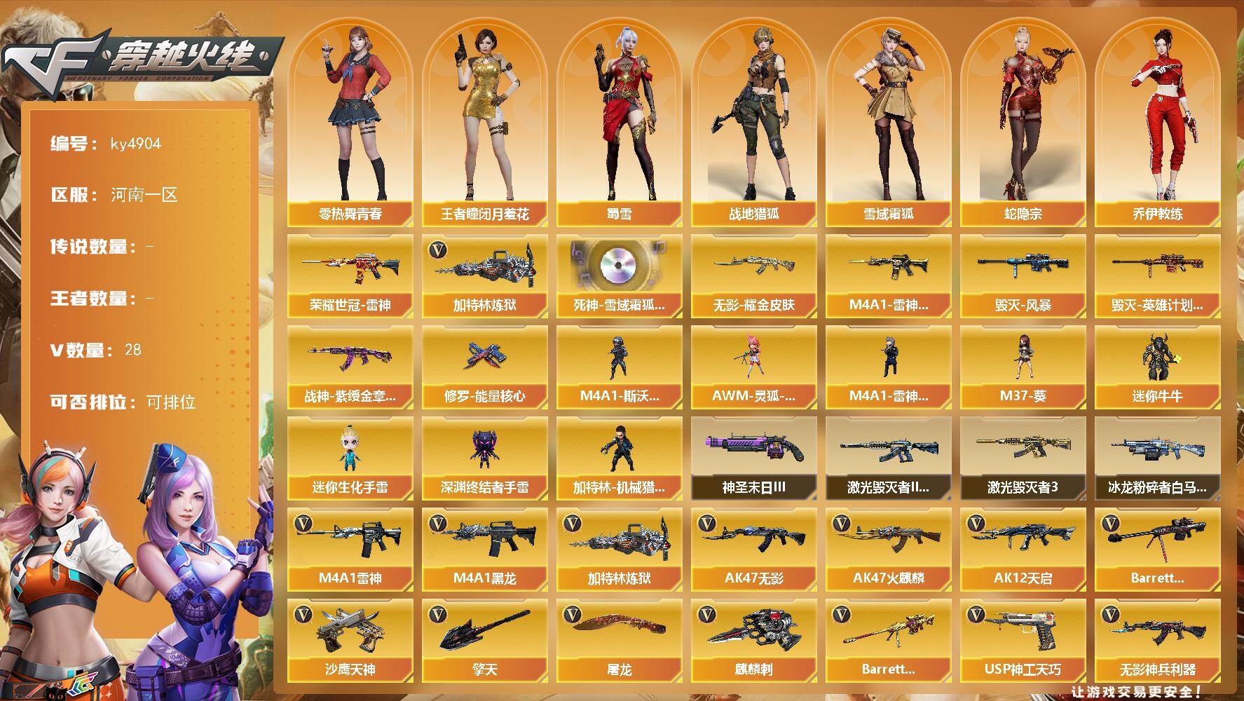 [17254684]河南一区-28V-0王者-0炫金 【热门武器】:荣耀世冠-雷神,加特林-炼狱 【音效卡】:死神-雪域霜狐-怀旧音效卡 【皮肤】:M4A1-雷神-CFS 2019,毁灭-风暴,毁灭-英雄计划 皮肤,无影耀金皮肤,战神-紫绶金章皮肤,修罗-能量核心 【角色】:战地猎狐,王者-瞳-闭月羞花,雪域霜狐,蛇隐宗,乔伊教练,芳心审判者,风暴女,嘉年华灵狐,兰妹妹,零-热舞青春,麻雀,曼陀罗-X,潘多拉-X,潘多拉-甜心教官,蛇姬,斯沃特-X,蜀雪,新娜塔莎 【人偶武器】:M4A1-雷神-精英刀锋,加特林-机械猎手,AWM-灵狐-15周年嘉年华,M37-葵,迷你牛牛*2,迷你生化手雷,深渊终结者手雷*2,M4A1-斯沃特 【挑战大师】:冰龙粉碎者-白马银枪,激光毁灭者III-白马银枪,激光毁灭者III,神圣爆裂者-末日III 【英雄级武器】:AK47-火麒麟,M4A1-黑龙,M4A1-雷神,AK47-无影,AK12-天启,无影-神兵利器,黑武士-锦绣游龙,烈火-动感闪耀,AK47-B-战神,荣耀世冠-雷神,Barrett-毁灭,Barrett-朱雀,加特林-炼狱,沙鹰-天神,USP-神工天巧,天神-动感闪耀,屠龙,擎天,麒麟刺,屠龙-动感闪耀,高爆手雷-神工天巧,手雷-动感闪耀,闪光弹-神工天巧,烟雾弹-神工天巧,烟雾弹-古蛇迷踪,M4A1-赤狱骑士,M4A1-苍鸣雷神,AWM-昌龙 【道具】:BS战队炫彩背包,云山科技背包,亚洲杯纪念炫彩背包,全能枪王背包,背包-洛丽塔,雪域霜狐炫彩背包,哔哩哔哩名片,女皇终结者-魔龙之吻,救世主-黑桃战神,黄金生化钩,绿色巨人,灵魂忍者,迷雾幽灵,夺命之镰,防化服*3,金色流光-枪王排位*2,流光-再燃火线,枪王排位29赛季金色流光,语音特效-怀旧,雪域霜狐表情,电玩兔兔表情,动感闪耀表情,防弹头盔*6,防弹衣*6,C4工具钳*6,手雷包*6 【特殊枪械】:1炼狱