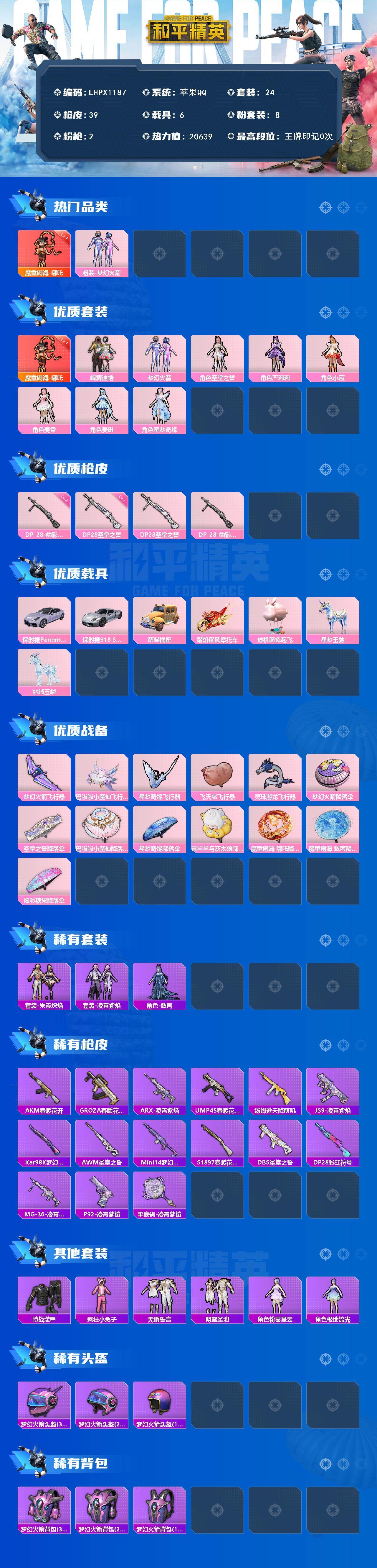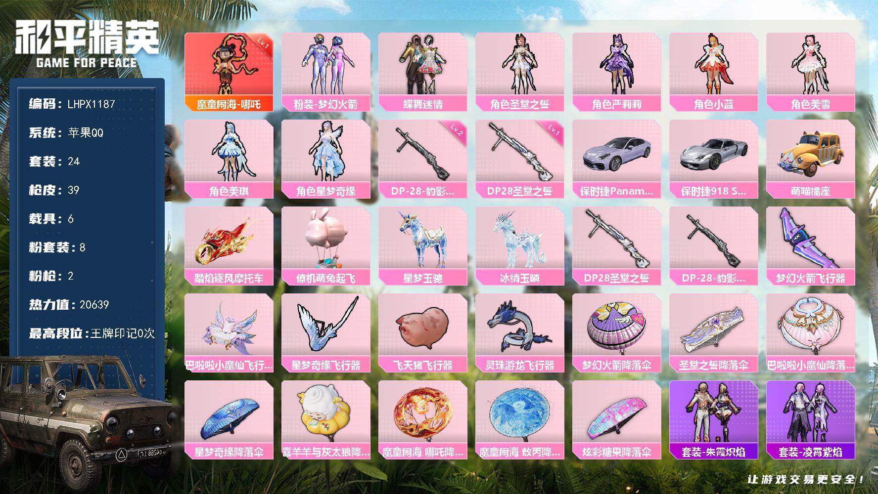 [17254784]可二次【特价出售/店主推荐】苹果 手Q-1神装-8粉装-2特效枪-6载具-5粉色飞行器-20639热力值-1王牌印记-24套装-39枪皮 【红色神装等级】:魔童闹海-哪吒(一级) 【红色角色神装】:魔童闹海-哪吒 【热门品类】:粉装-梦幻火箭 【粉色套装】:粉装-蝶舞迷情,粉装-梦幻火箭,角色-圣堂之誓,角色-严莉莉,角色-小蓝,角色-美雪,角色-美琪,角色-星梦奇缘 【粉色枪皮等级】:DP-28-圣堂之誓(一级),DP-28-豹影疾电(二级) 【粉色载具】:保时捷Panamera(星辰紫),保时捷918 Spyder(液态银),萌喵橘座,踏焰逐风摩托车,僚机-萌兔起飞,星梦玉骢,冰绡玉鳞 【粉色枪皮】:DP-28-圣堂之誓,DP-28-豹影疾电 【粉色飞行器】:梦幻火箭飞行器,巴啦啦小魔仙飞行器,星梦奇缘飞行器,飞天猪飞行器,灵珠游龙飞行器 【粉色降落伞】:梦幻火箭降落伞,圣堂之誓降落伞,巴啦啦小魔仙降落伞,星梦奇缘降落伞,喜羊羊与灰太狼降落伞,魔童闹海 哪吒降落伞,魔童闹海 敖丙降落伞,炫彩糖果降落伞 【稀有套装】:套装-朱霞炽焰,套装-凌霄紫焰,角色-敖闰 【稀有枪皮】:AKM-春暖花开,GROZA-春暖花开,ARX-凌霄紫焰,UMP45-春暖花开,汤姆逊-天降萌叽,JS9-凌霄紫焰,Kar98K-梦幻火箭,AWM-圣堂之誓,Mini14-梦幻火箭,S1897-春暖花开,DBS-圣堂之誓,DP-28-彩虹符号,MG-36-凌霄紫焰,P92-凌霄紫焰,平底锅-凌霄紫焰 【其他套装】:套装-特战装甲,套装-疯狂小兔子,套装-无暇誓言,套装-明鸳圣池,角色-粉雾星云,角色-极地流光 【稀有头盔】:梦幻火箭头盔(3级),梦幻火箭头盔(2级),梦幻火箭头盔(1级) 【稀有背包】:梦幻火箭背包(3级),梦幻火箭背包(2级),梦幻火箭背包(1级) 【营地ID】:1026843059