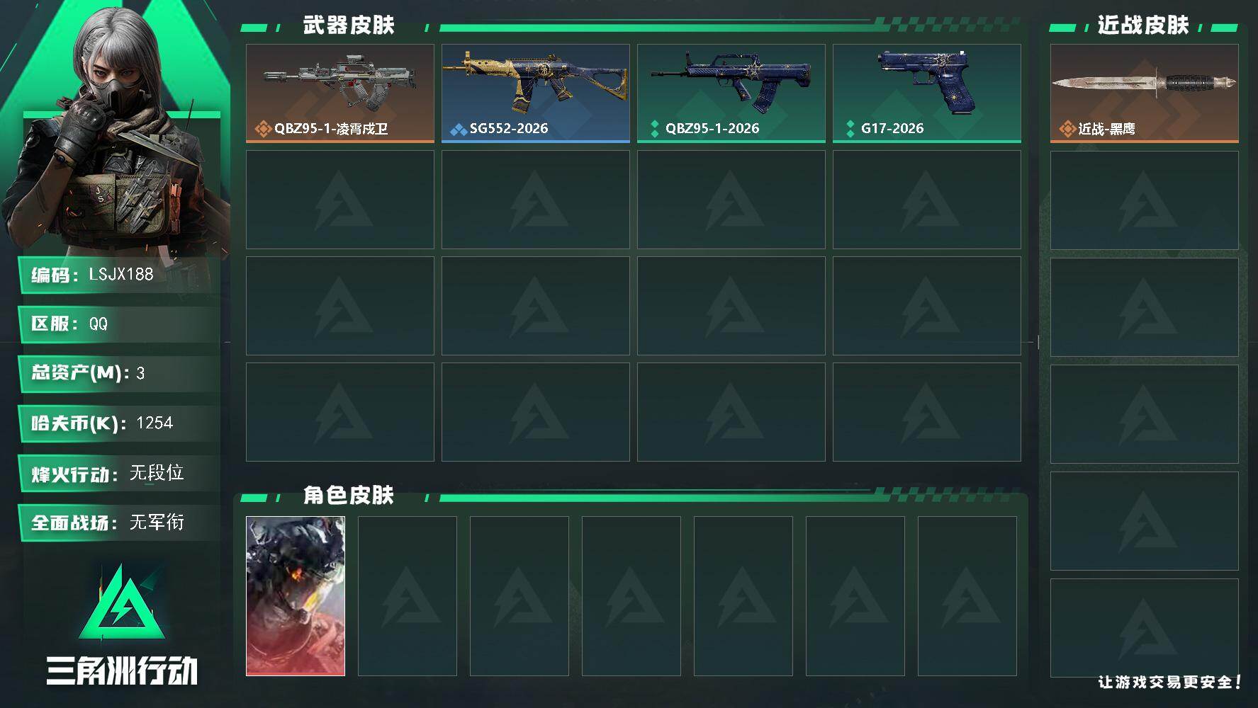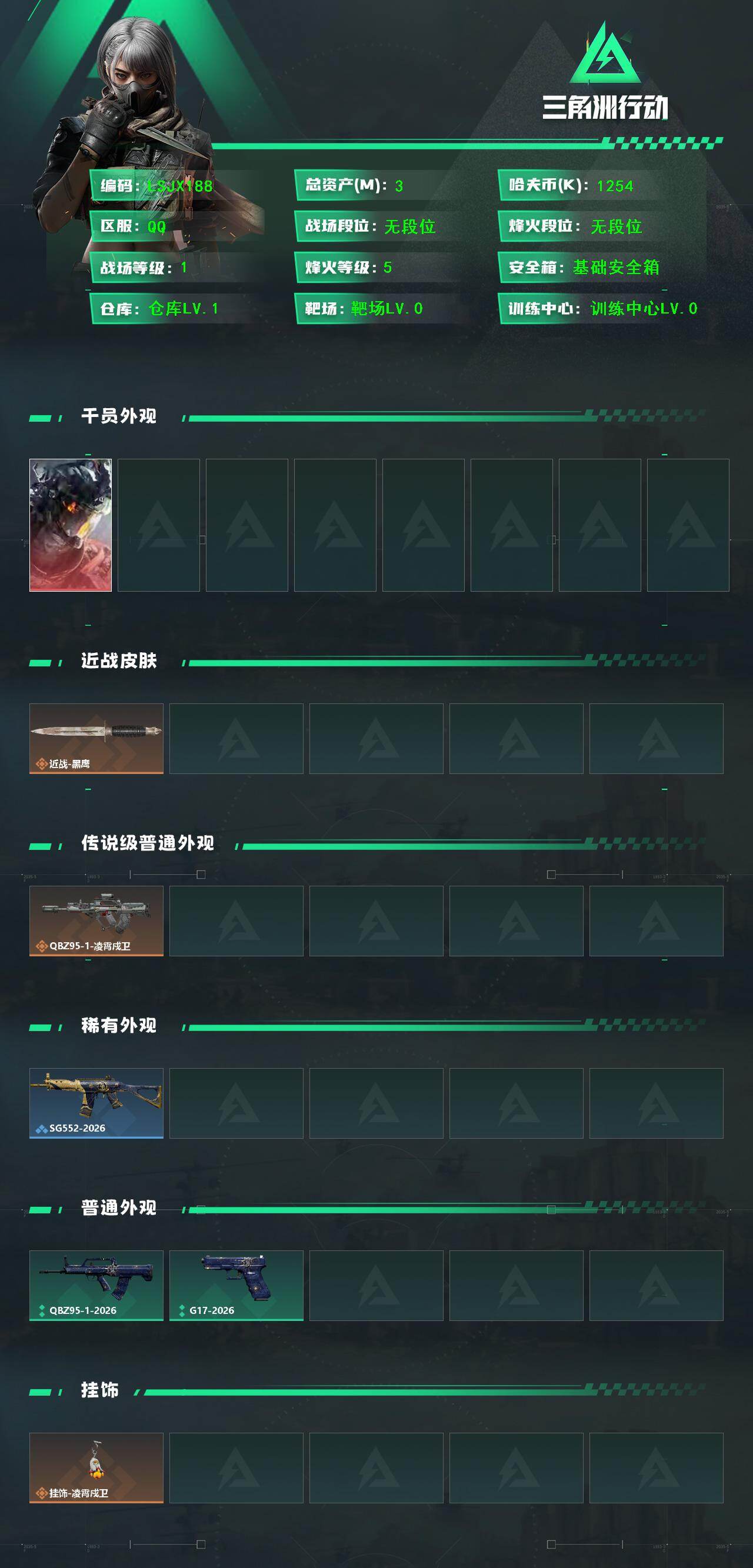 [17254999]3m总资产-1254k哈伏币-5烽火等级-无段位-1战场等级-无军衔 【干员外观】:威龙-凌霄戍卫 【近战皮肤】:近战-黑鹰 【传说外观】:QBZ95-1突击步枪-凌霄戍卫 【稀有外观】:SG552突击步枪-2026 【普通外观】:QBZ95-1突击步枪-2026,G17-2026 【挂饰】:挂饰-凌霄戍卫