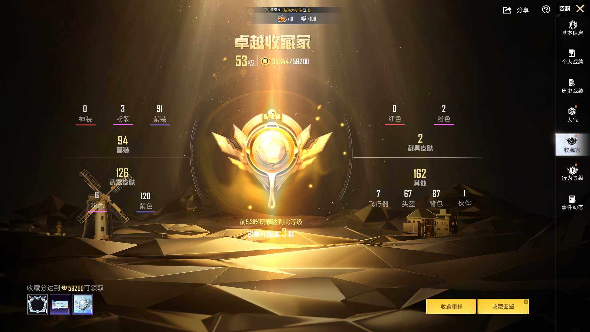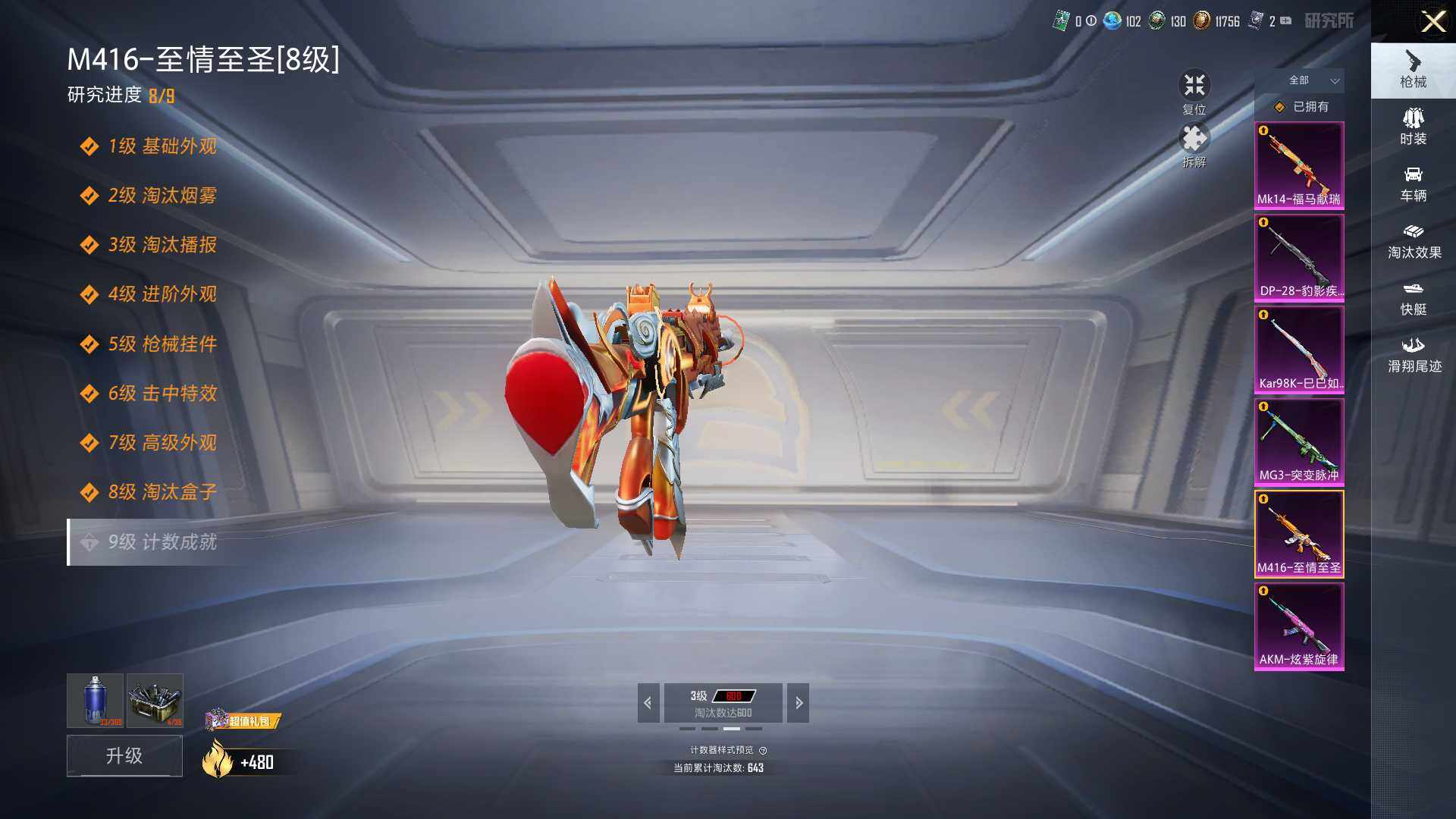 【粉色枪皮等级】:AKM-炫紫旋律(七级),M416-至情至圣(八级),Kar98K-巳巳如意(五级),Mk14-福马献瑞(一级),DP-28-豹影疾电(五级),MG3-突变脉冲(七级)