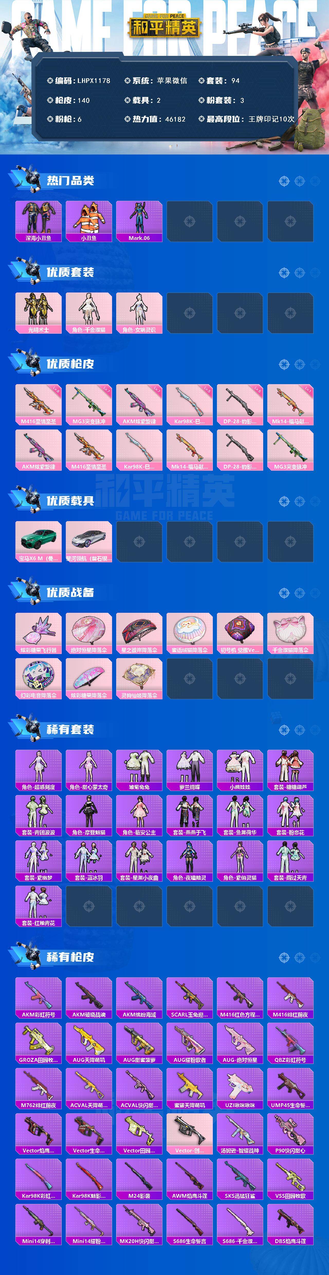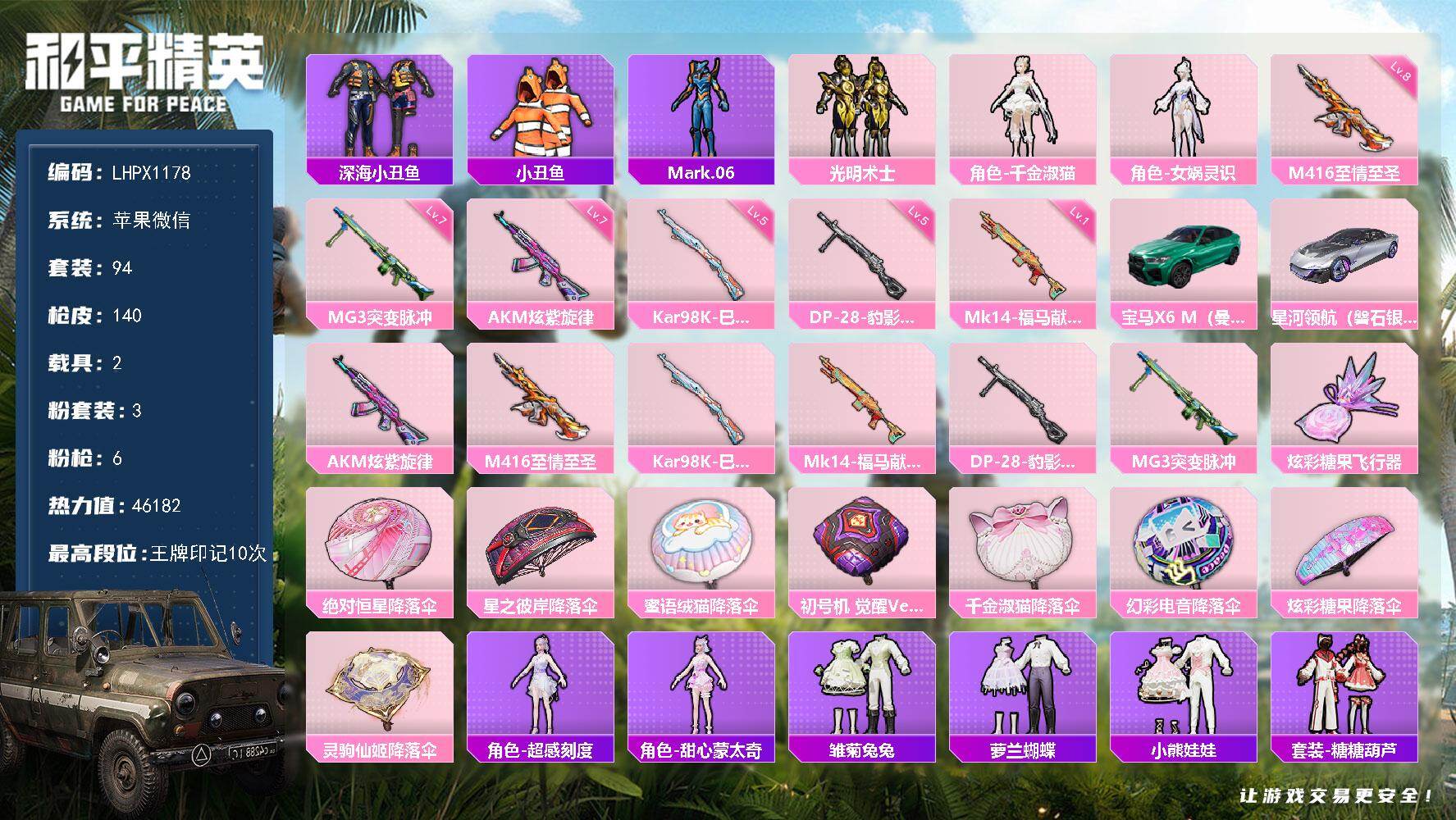 [17254941]【特价出售/店主推荐】苹果 微信-3粉装-6特效枪-2载具-1粉色飞行器-46182热力值-10王牌印记-94套装-140枪皮 【热门品类】:套装-深海小丑鱼,套装-小丑鱼,角色-Mark.06 【粉色套装】:粉装-光明术士,角色-千金淑猫,角色-女娲灵识 【粉色枪皮等级】:AKM-炫紫旋律(七级),M416-至情至圣(八级),Kar98K-巳巳如意(五级),Mk14-福马献瑞(一级),DP-28-豹影疾电(五级),MG3-突变脉冲(七级) 【粉色载具】:宝马X6 M(曼岛绿),星河领航(磐石银) 【粉色枪皮】:AKM-炫紫旋律,M416-至情至圣,Kar98K-巳巳如意,Mk14-福马献瑞,DP-28-豹影疾电,MG3-突变脉冲 【粉色飞行器】:炫彩糖果飞行器 【粉色降落伞】:绝对恒星降落伞,星之彼岸降落伞,蜜语绒猫降落伞,初号机 觉醒Ver.降落伞,千金淑猫降落伞,幻彩电音降落伞,炫彩糖果降落伞,灵驹仙姬降落伞 【稀有套装】:角色-超感刻度,角色-甜心蒙太奇,套装-雪国风尚,套装-炫彩糖果,套装-雏菊兔兔,套装-萝兰蝴蝶,套装-小熊娃娃,套装-糖糖葫芦,套装-青团波波,角色-摩登魅猫,角色-临安公主,套装-燕燕于飞,套装-鱼渊荷华,套装-粉恋花,套装-紫幽梦,套装-蓝冰羽,套装-星渊小夜曲,角色-夜瞳黯灵,角色-紫俏灵猫,套装-雨过天青,套装-红釉青花 【稀有枪皮】:AKM-彩虹符号,AKM-破晓战魂,AKM-缤纷海域,SCAR-L-玉兔迎春,M416-红色方程式,M416-绯红前夜,GROZA-田园牧歌,AUG-天降萌叽,AUG-甜蜜菠萝,AUG-耀粉歌者,AUG-绝对恒星,QBZ-彩虹符号,M762-绯红前夜,AC-VAL-天降萌叽,AC-VAL-快闪甜心,蜜獾-天降萌叽,UZI-啾咪啾咪,UMP45-生命誓言,Vector-焰鹰斗篷,Vector-生命誓言,Vector-田园牧歌,Vector-创世·救赎,汤姆逊-智耀战神,P90-快闪甜心,Kar98K-彩虹符号,Kar98K-魅影蝠王,M24-影袭,AWM-焰鹰斗篷,SKS-迅猛狂鲨,VSS-田园牧歌,Mini14-穿刺龙虾,Mini14-耀粉歌者,MK20-H-快闪甜心,S686-生命誓言,S686-千金淑猫,DBS-焰鹰斗篷,DBS-彩虹符号,SPAS-12-田园牧歌,M249-破晓战魂,DP-2