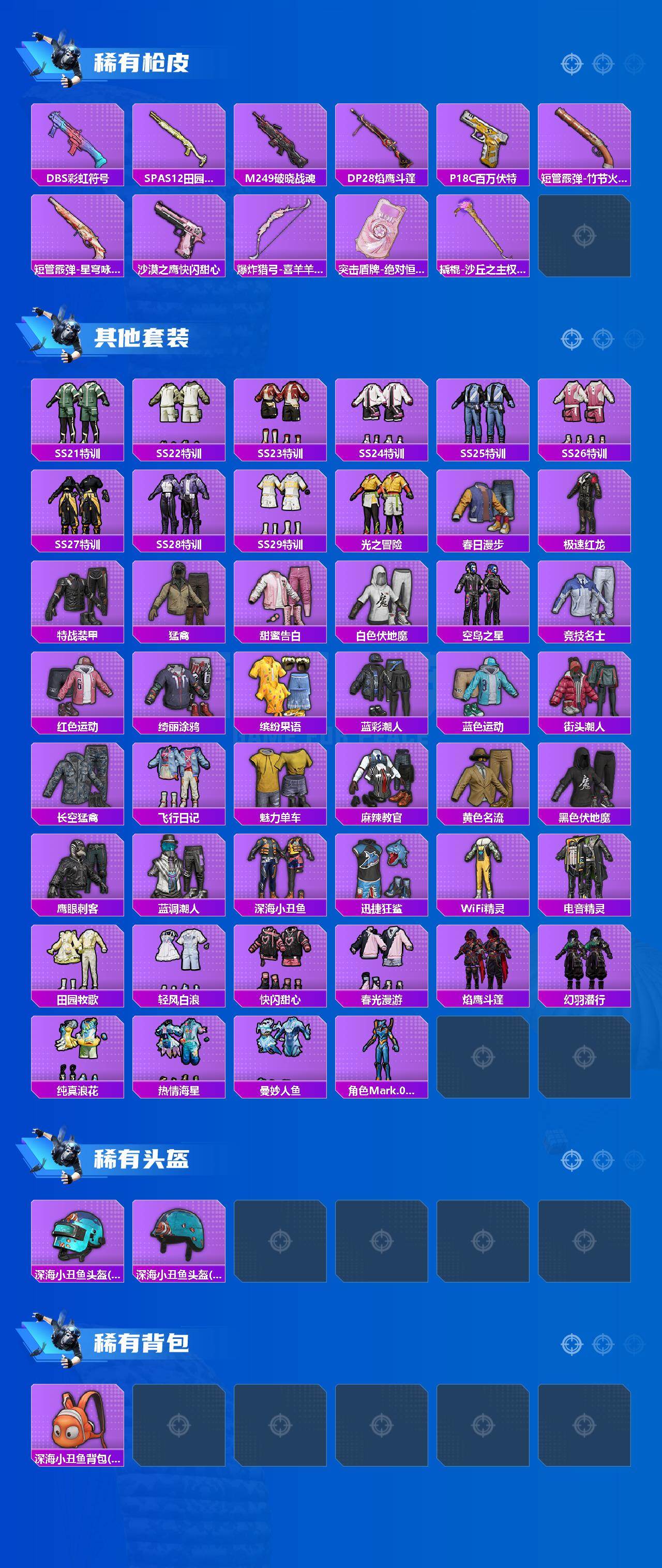 【稀有枪皮】:AKM-彩虹符号,AKM-破晓战魂,AKM-缤纷海域,SCAR-L-玉兔迎春,M416-红色方程式,M416-绯红前夜,GROZA-田园牧歌,AUG-天降萌叽,AUG-甜蜜菠萝,AUG-耀粉歌者,AUG-绝对恒星,QBZ-彩虹符号,M762-绯红前夜,AC-VAL-天降萌叽,AC-VAL-快闪甜心,蜜獾-天降萌叽,UZI-啾咪啾咪,UMP45-生命誓言,Vector-焰鹰斗篷,Vector-生命誓言,Vector-田园牧歌,Vector-创世·救赎,汤姆逊-智耀战神,P90-快闪甜心,Kar98K-彩虹符号,Kar98K-魅影蝠王,M24-影袭,AWM-焰鹰斗篷,SKS-迅猛狂鲨,VSS-田园牧歌,Mini14-穿刺龙虾,Mini14-耀粉歌者,MK20-H-快闪甜心,S686-生命誓言,S686-千金淑猫,DBS-焰鹰斗篷,DBS-彩虹符号,SPAS-12-田园牧歌,M249-破晓战魂,DP-2
