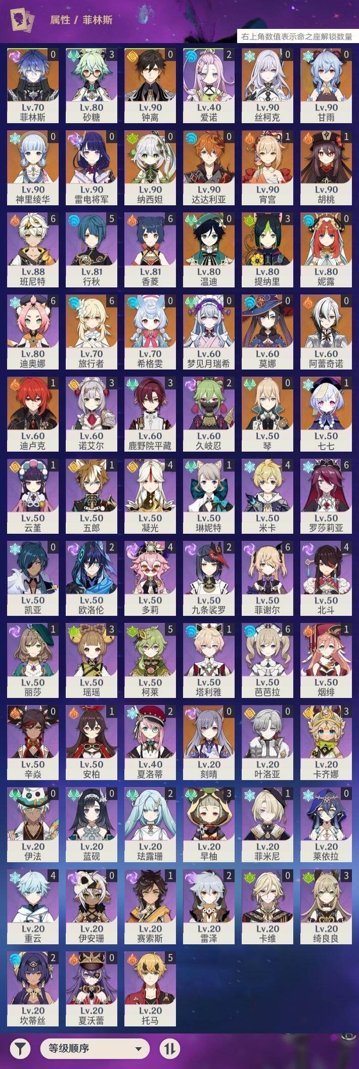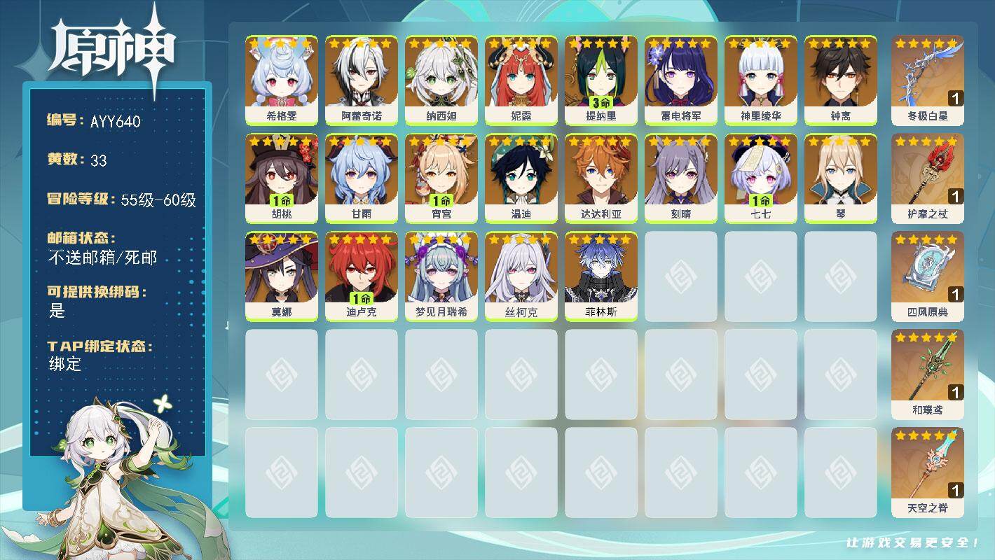 [17255144]58级/33黄/女主/21个五星角色/5个五星武器 0命希格雯,0命阿蕾奇诺,0命纳西妲,0命妮露,3命提纳里,0命雷电将军,0命神里绫华,0命钟离,1命胡桃,0命甘雨,1命宵宫,0命温迪,0命达达利亚,0命刻晴,1命七七,0命琴,0命莫娜,1命迪卢克,0命梦见月瑞希,0命丝柯克,0命菲林斯,精1冬极白星,精1护摩之杖,精1四风原典,精1和璞鸢,精1天空之脊