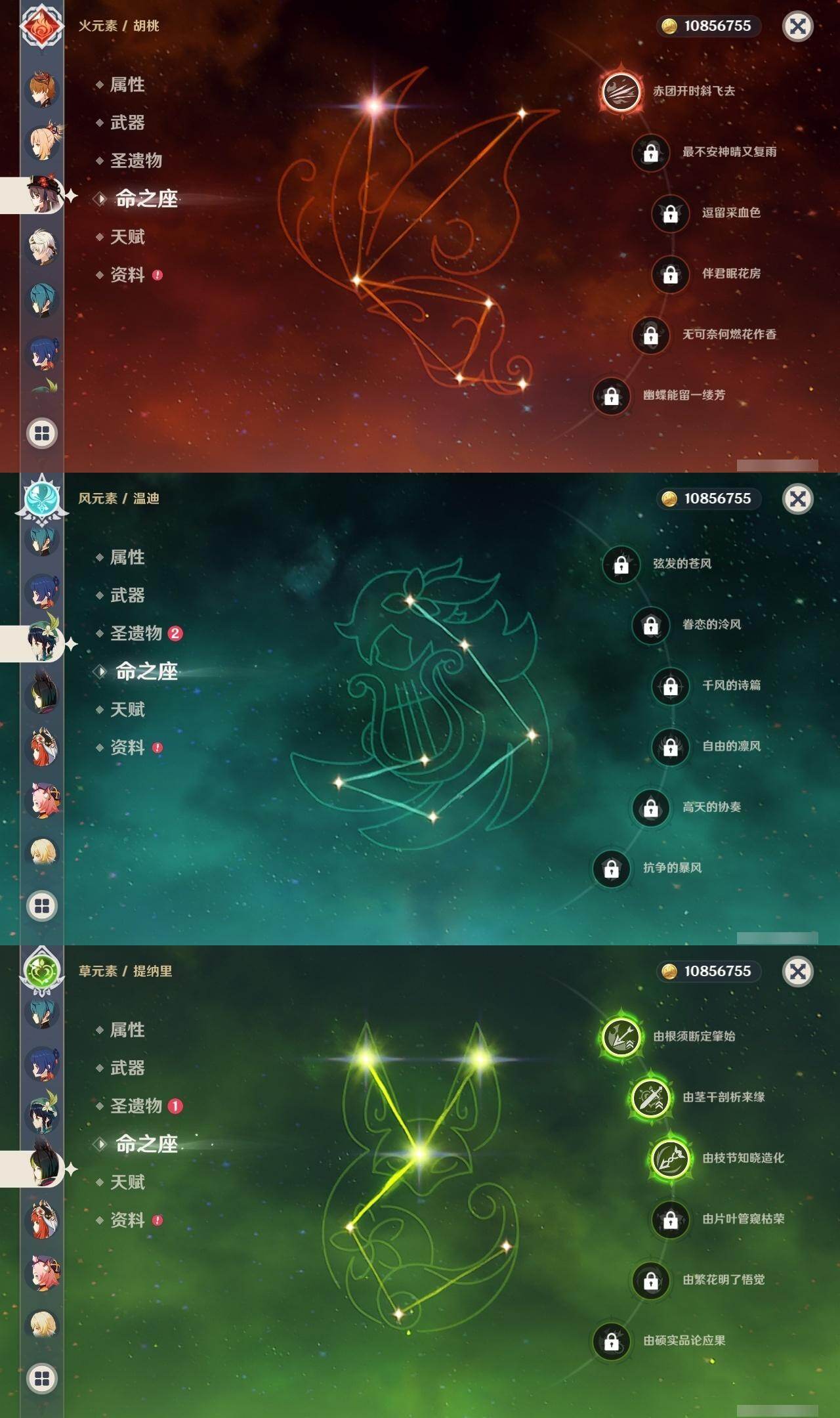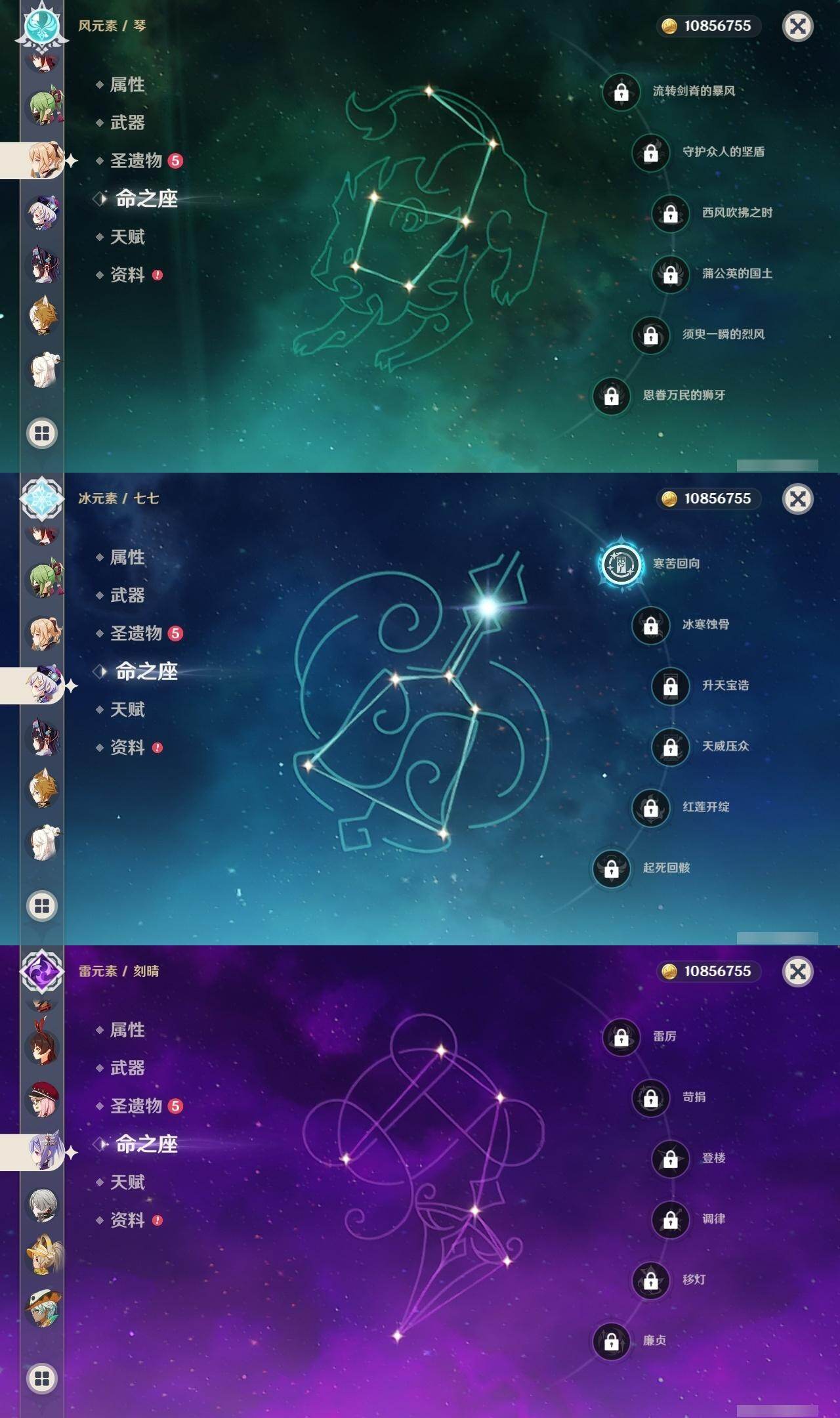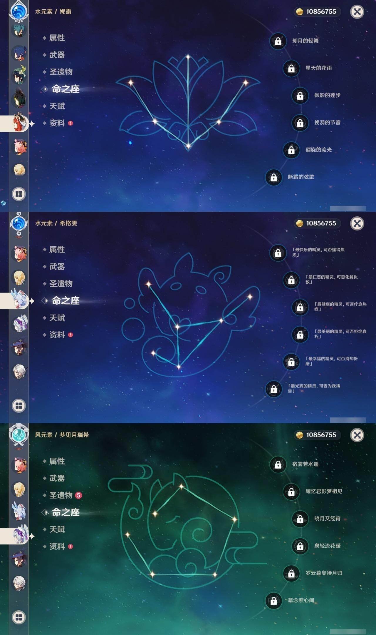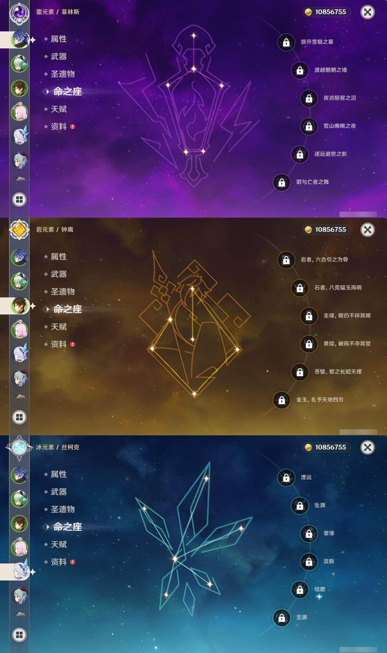 0命希格雯,0命阿蕾奇诺,0命纳西妲,0命妮露,3命提纳里,0命雷电将军,0命神里绫华,0命钟离,1命胡桃,0命甘雨,1命宵宫,0命温迪,0命达达利亚,0命刻晴,1命七七,0命琴,0命莫娜,1命迪卢克,0命梦见月瑞希,0命丝柯克,0命菲林斯,精1冬极白星,精1护摩之杖,精1四风原典,精1和璞鸢,精1天空之脊