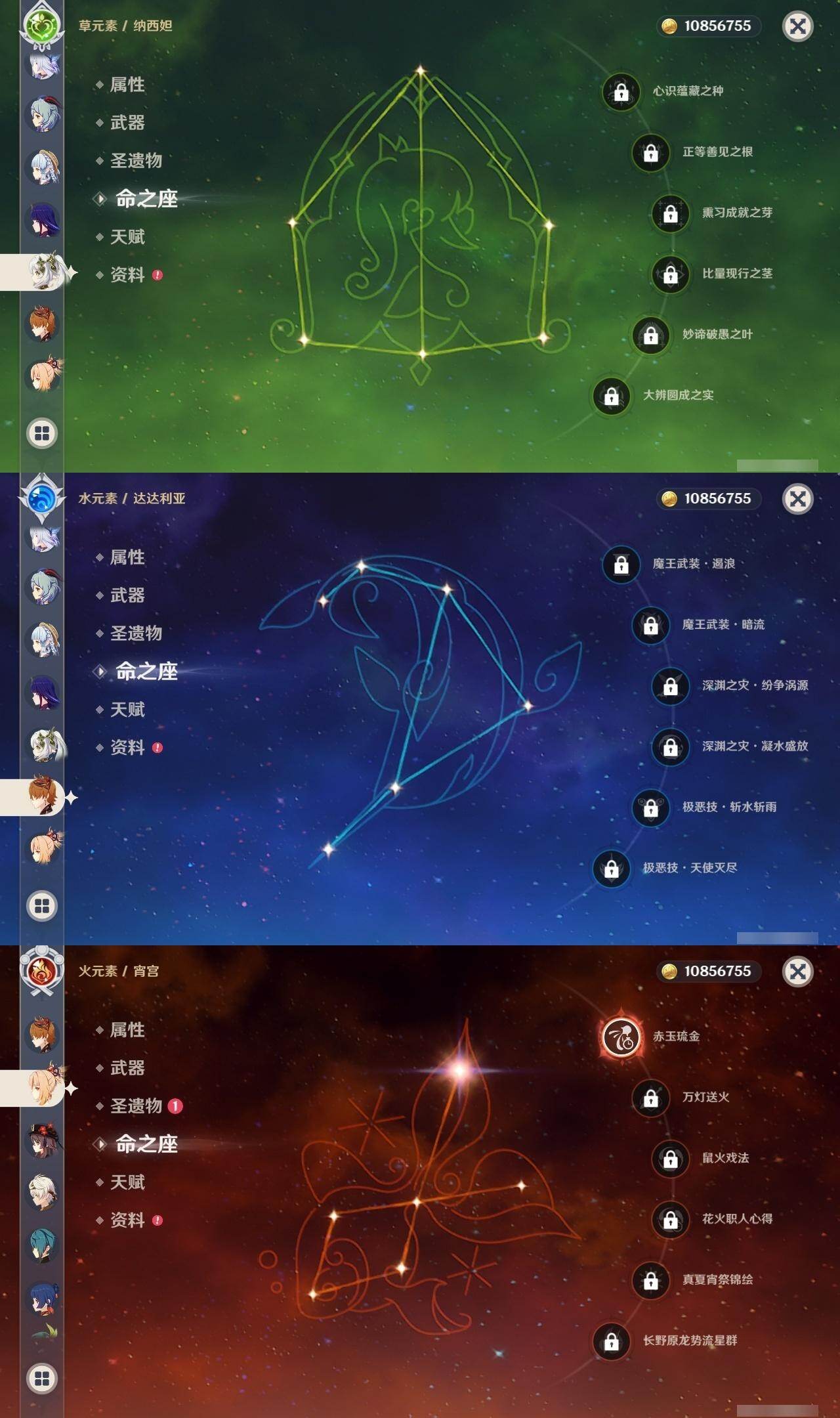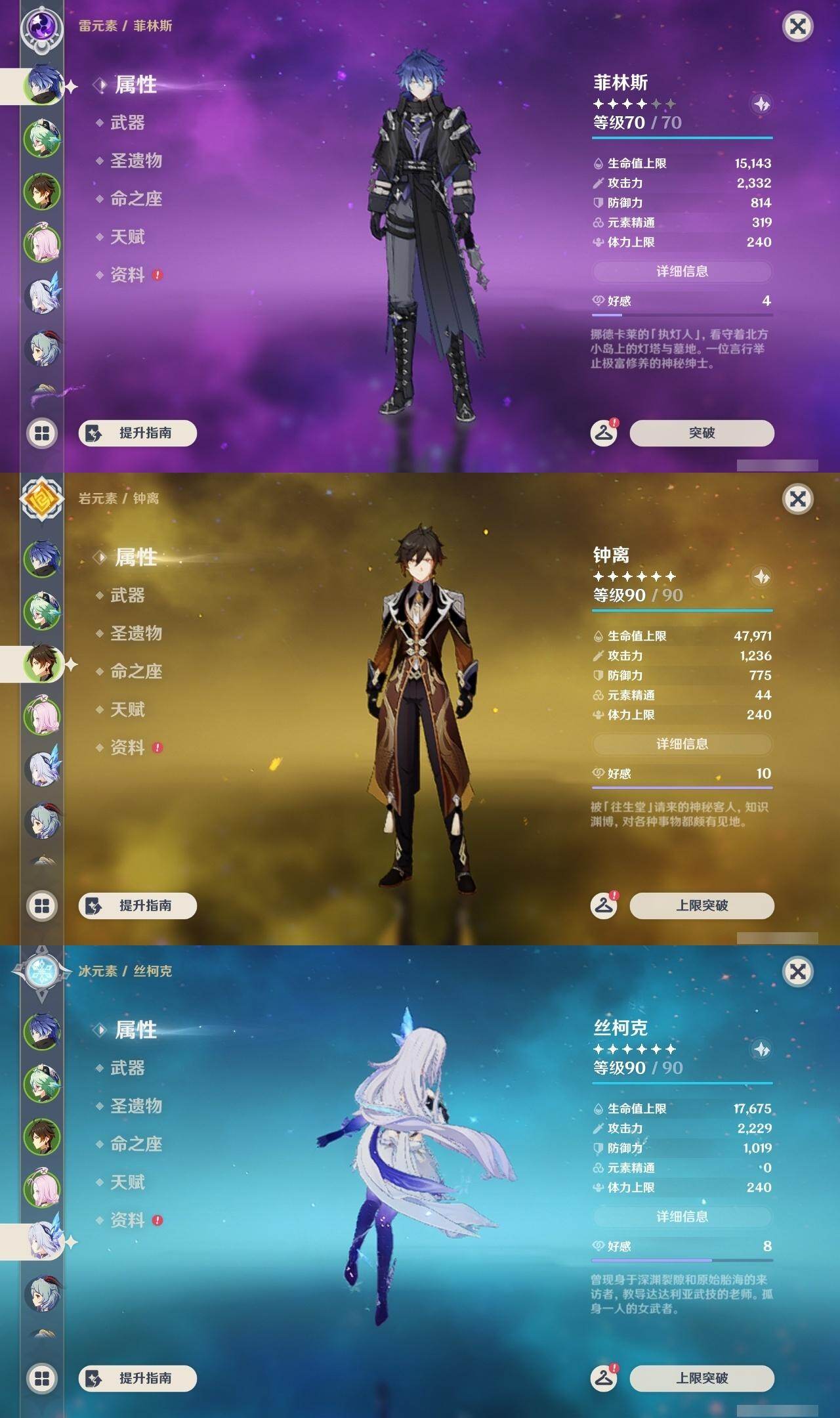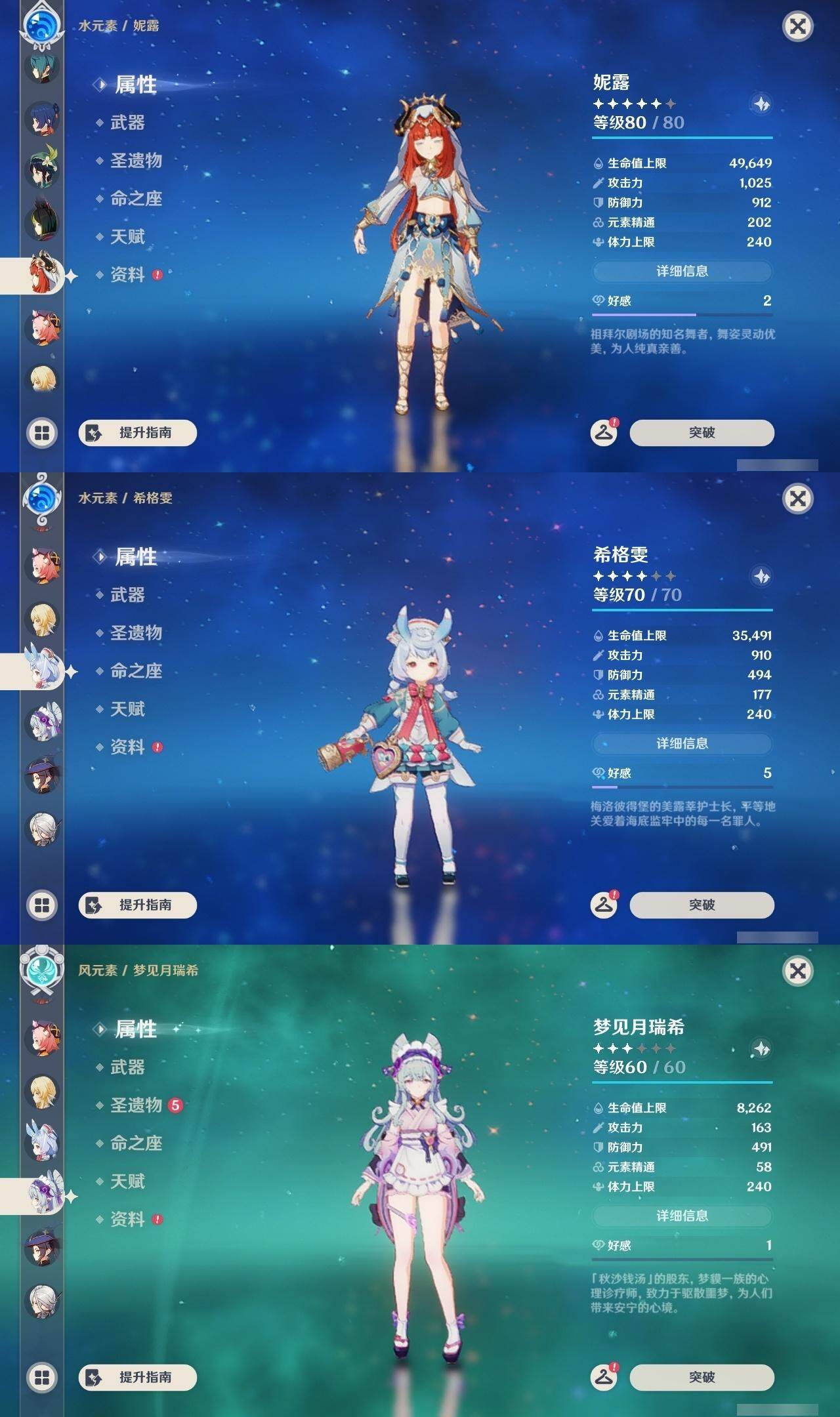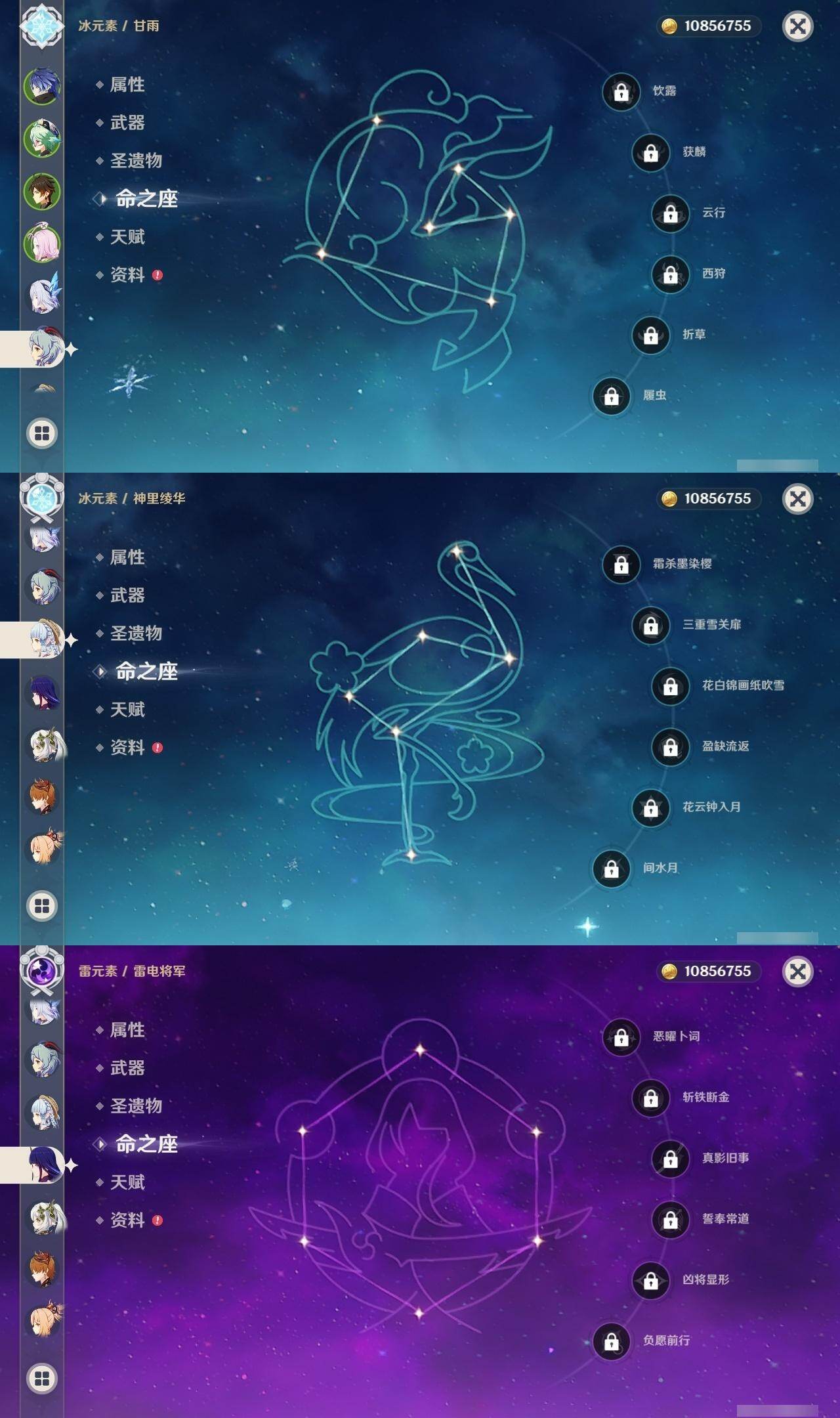 0命希格雯,0命阿蕾奇诺,0命纳西妲,0命妮露,3命提纳里,0命雷电将军,0命神里绫华,0命钟离,1命胡桃,0命甘雨,1命宵宫,0命温迪,0命达达利亚,0命刻晴,1命七七,0命琴,0命莫娜,1命迪卢克,0命梦见月瑞希,0命丝柯克,0命菲林斯,精1冬极白星,精1护摩之杖,精1四风原典,精1和璞鸢,精1天空之脊