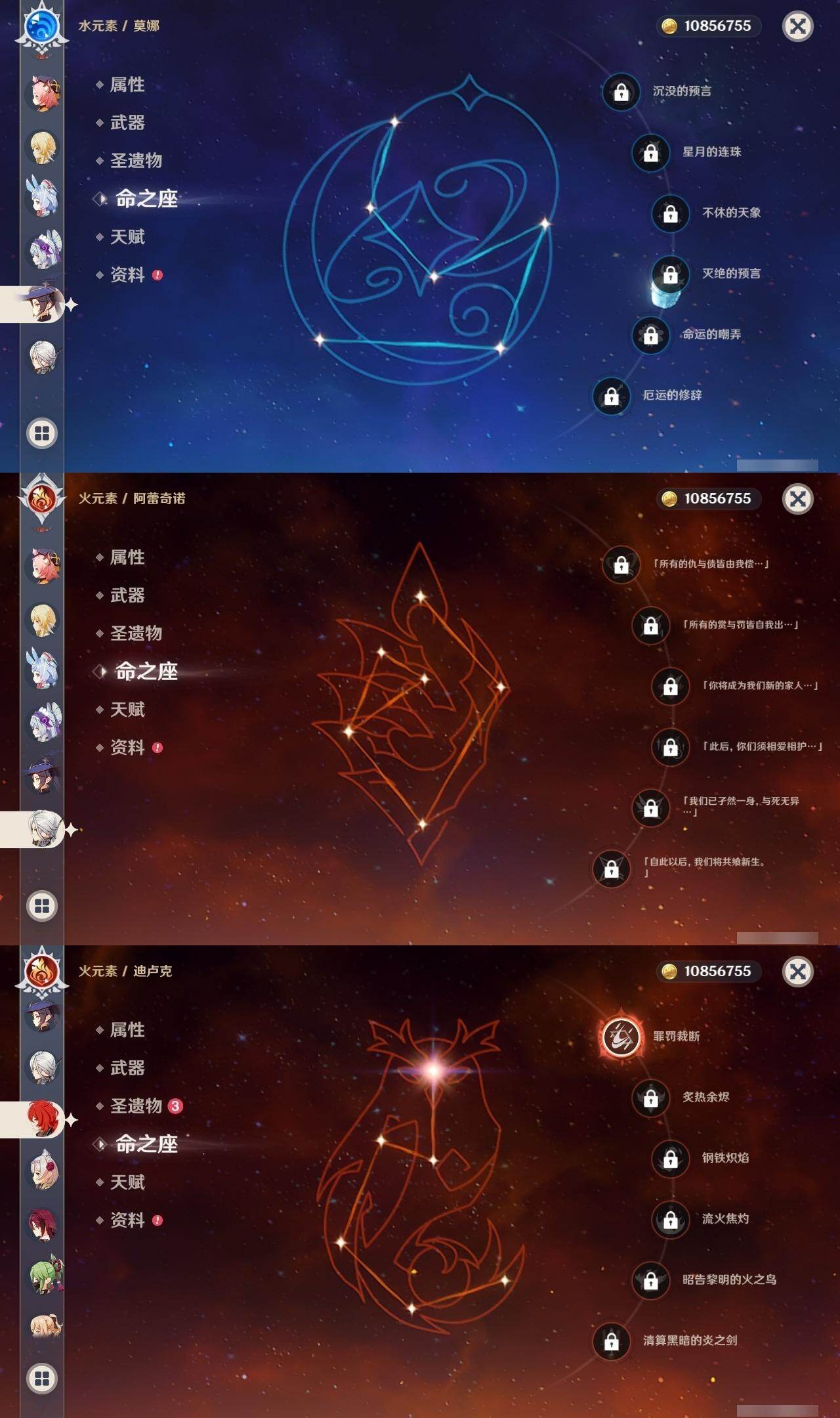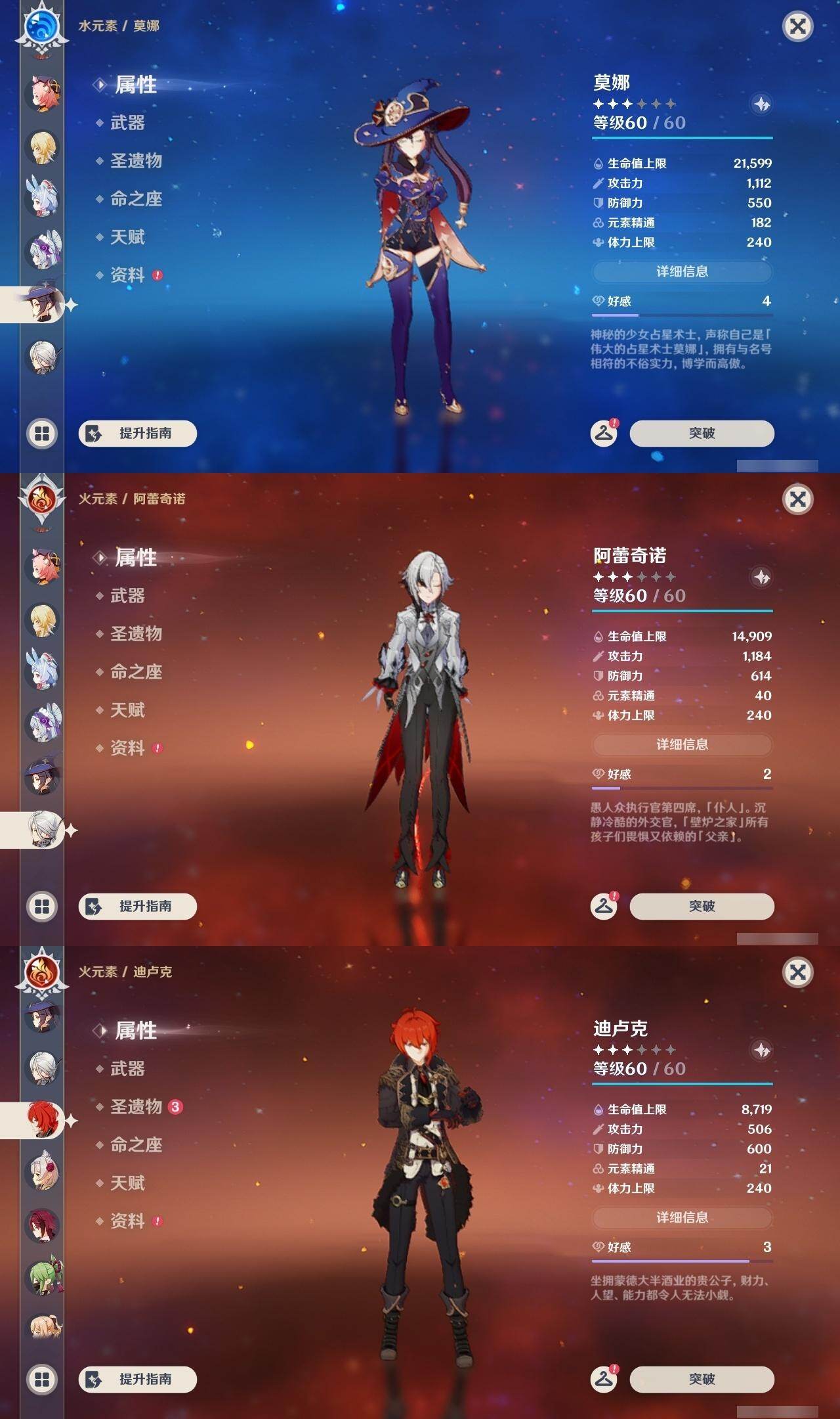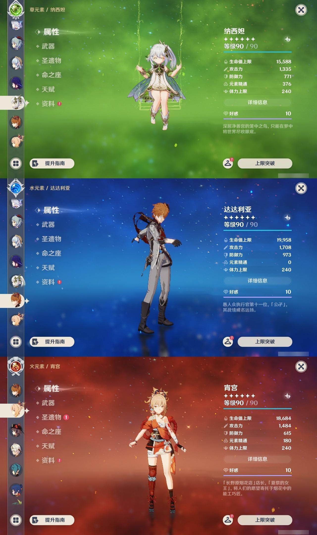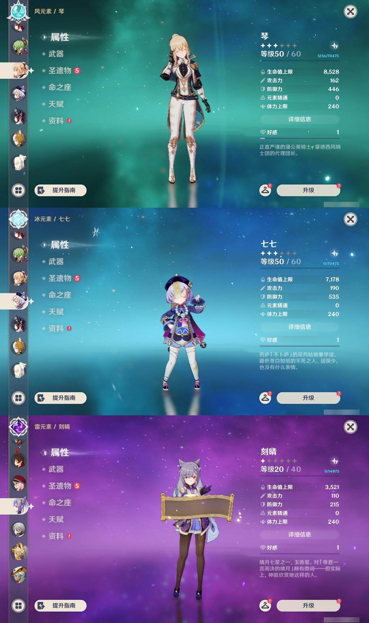 0命希格雯,0命阿蕾奇诺,0命纳西妲,0命妮露,3命提纳里,0命雷电将军,0命神里绫华,0命钟离,1命胡桃,0命甘雨,1命宵宫,0命温迪,0命达达利亚,0命刻晴,1命七七,0命琴,0命莫娜,1命迪卢克,0命梦见月瑞希,0命丝柯克,0命菲林斯,精1冬极白星,精1护摩之杖,精1四风原典,精1和璞鸢,精1天空之脊