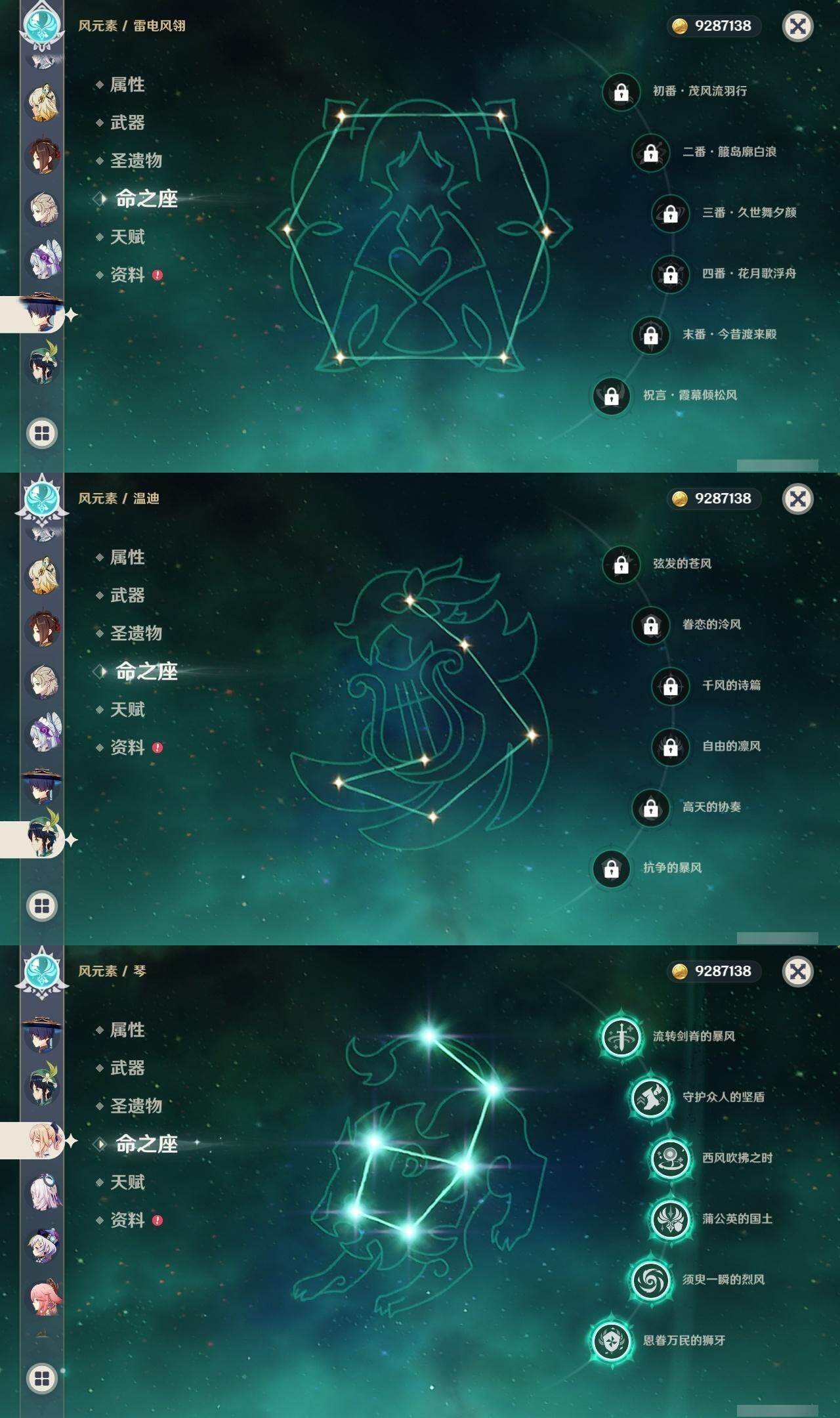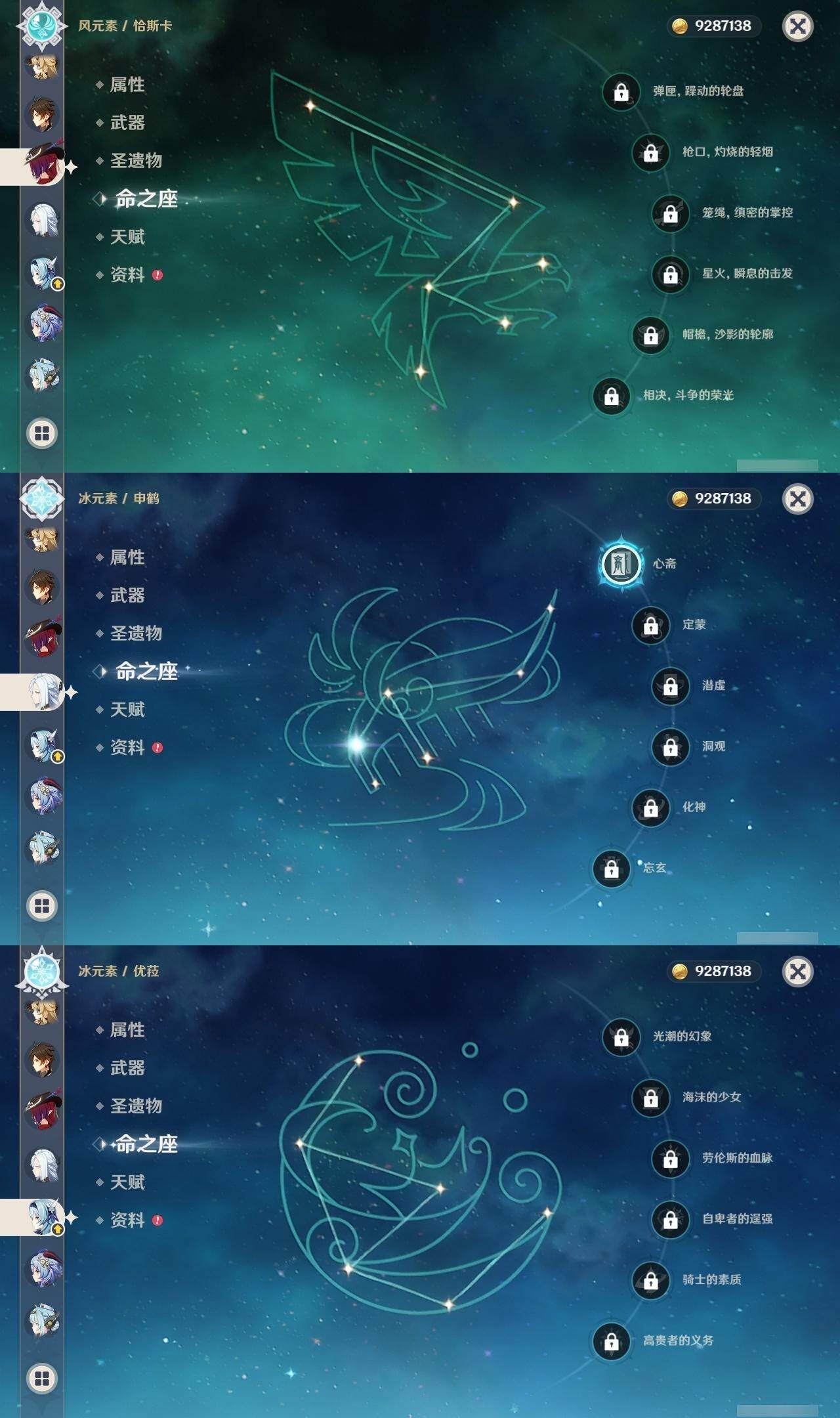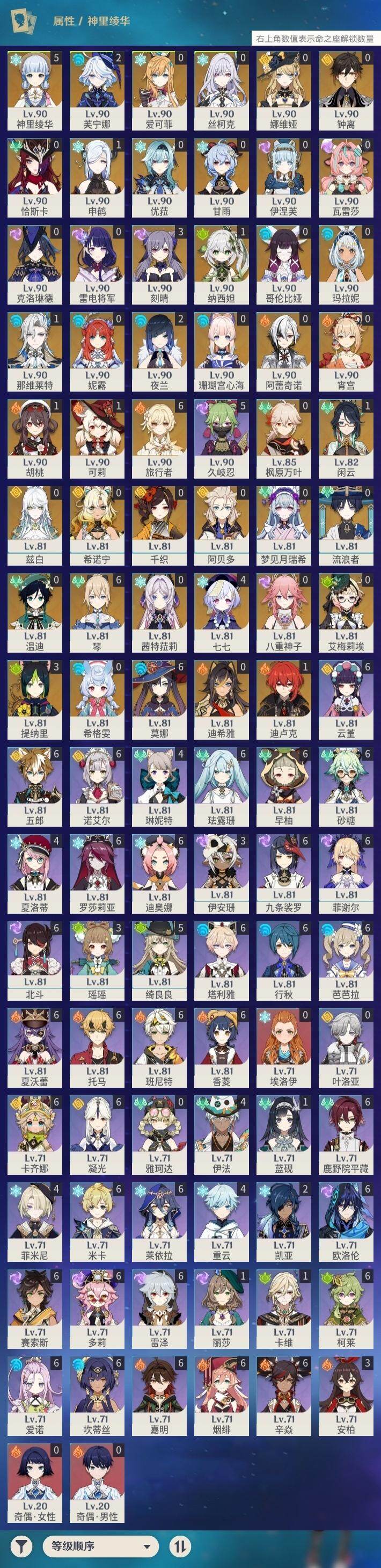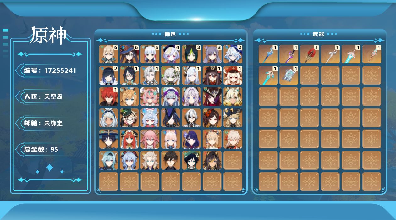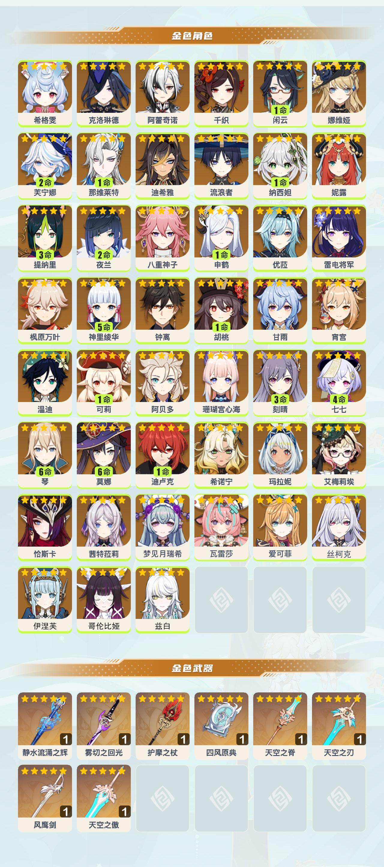 0命希格雯,0命克洛琳德,0命阿蕾奇诺,0命千织,1命闲云,0命娜维娅,2命芙宁娜,1命那维莱特,0命迪希雅,0命流浪者,1命纳西妲,0命妮露,3命提纳里,2命夜兰,0命八重神子,1命申鹤,0命优菈,0命雷电将军,0命枫原万叶,5命神里绫华,0命钟离,1命胡桃,0命甘雨,0命宵宫,0命温迪,1命可莉,0命阿贝多,0命珊瑚宫心海,3命刻晴,4命七七,满命琴,满命莫娜,1命迪卢克,0命希诺宁,0命玛拉妮,0命艾梅莉埃,0命恰斯卡,0命茜特菈莉,0命梦见月瑞希,0命瓦雷莎,0命爱可菲,0命丝柯克,0命伊涅芙,0命哥伦比娅,0命兹白,精1静水流涌之辉,精1雾切之回光,精1护摩之杖,精1四风原典,精1天空之脊,精1天空之刃,精1风鹰剑,精1天空之傲