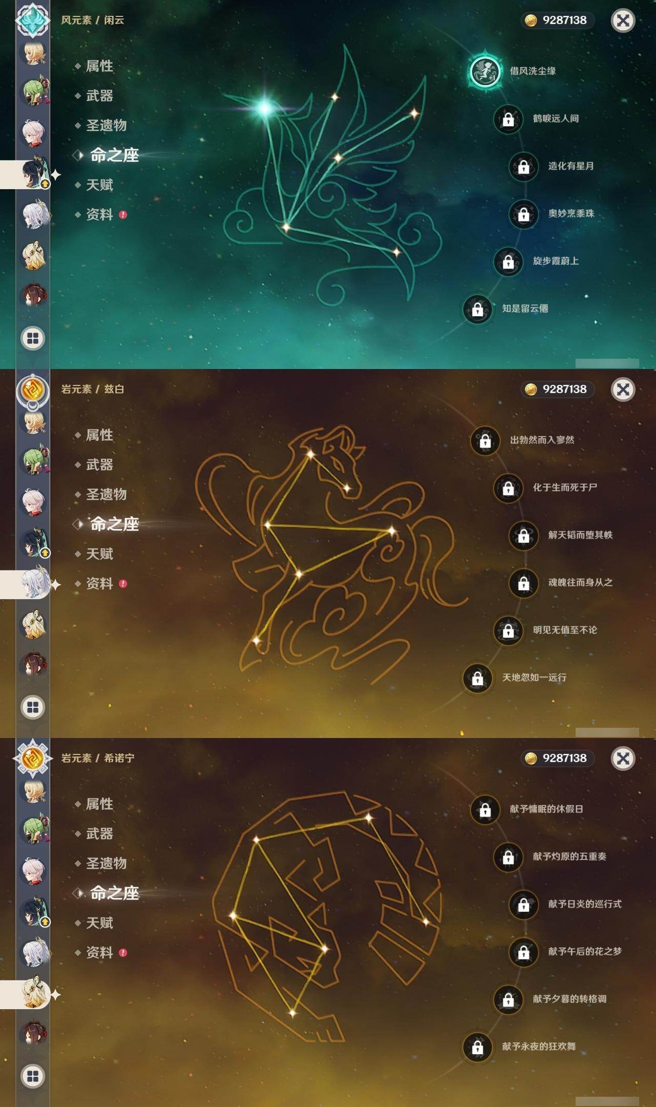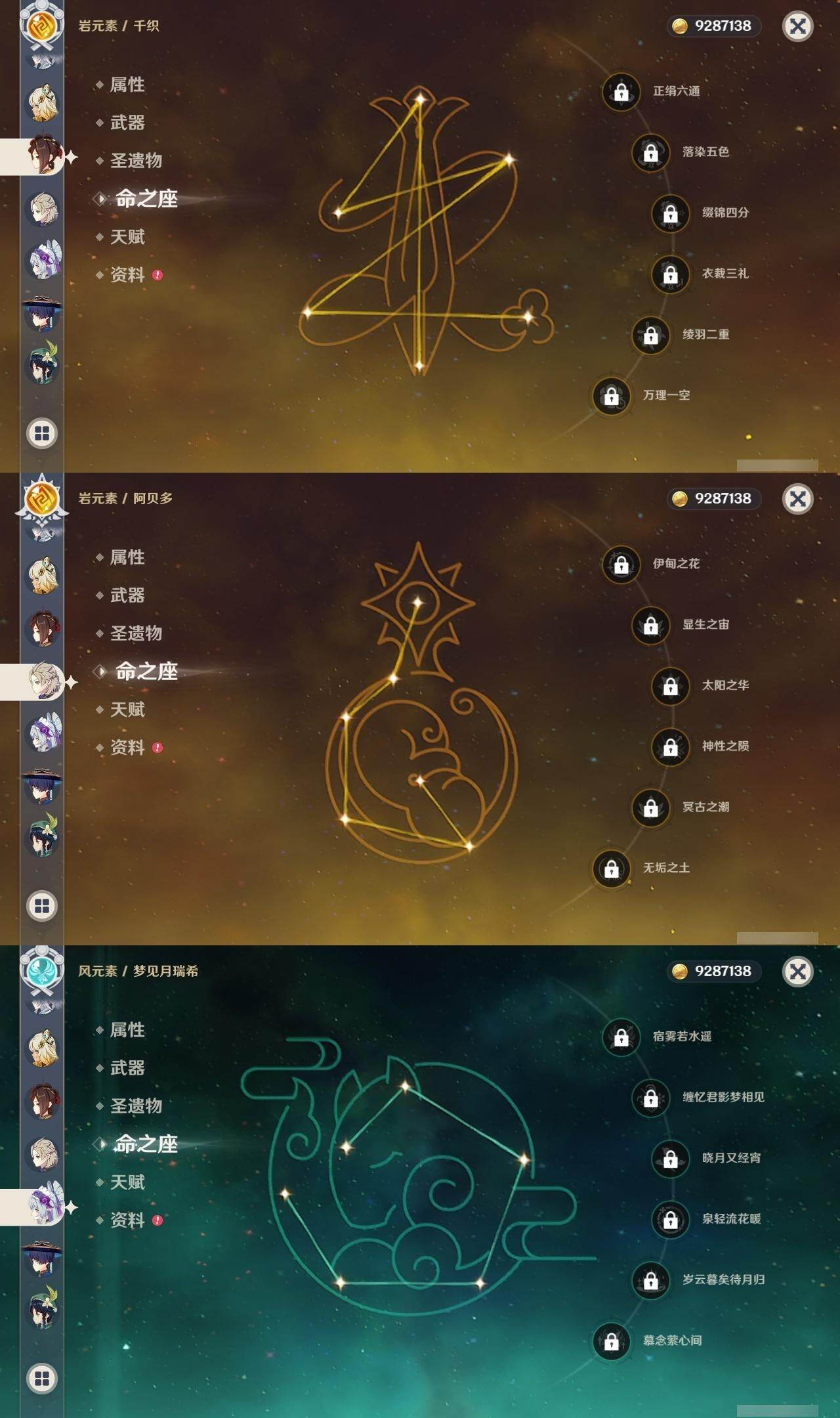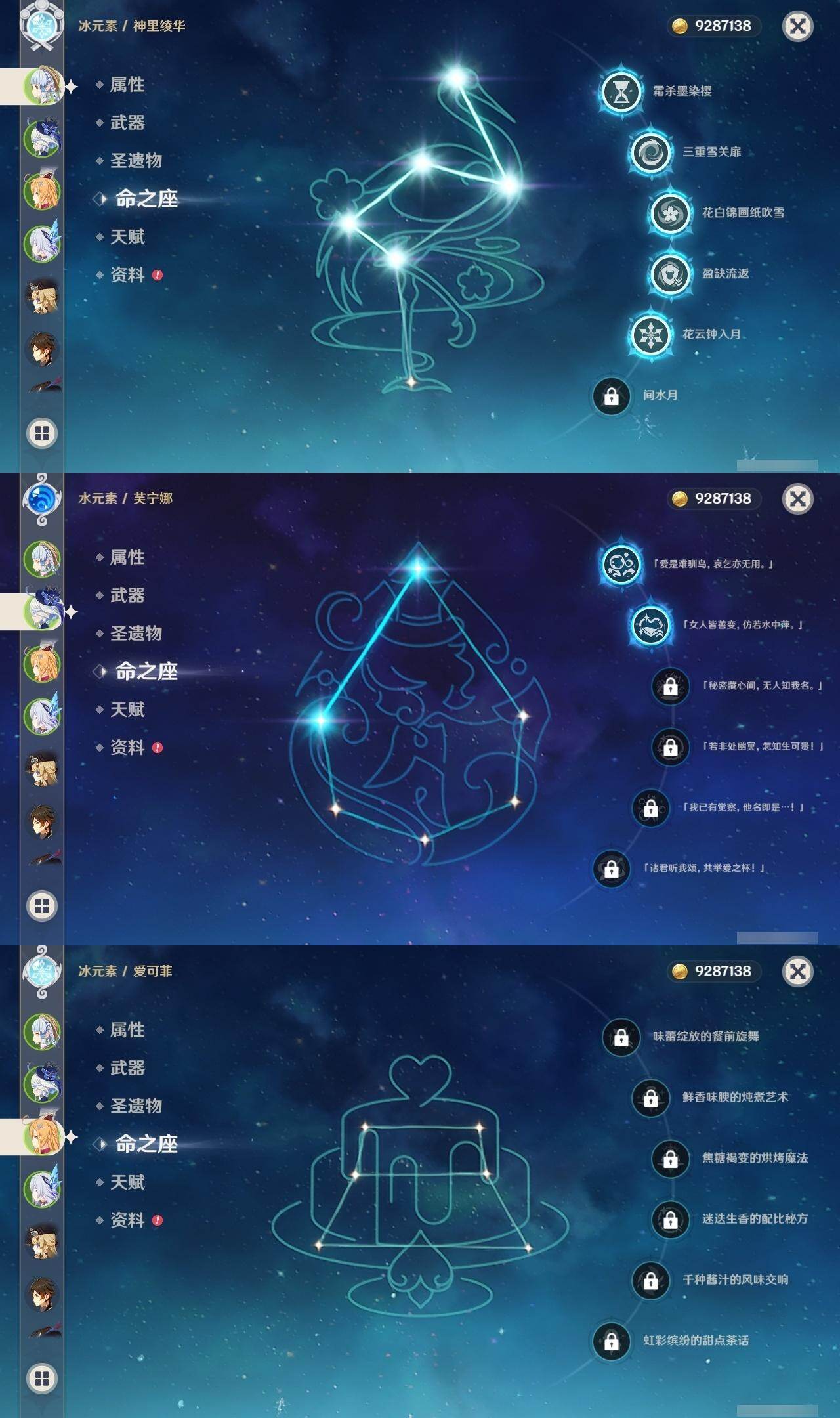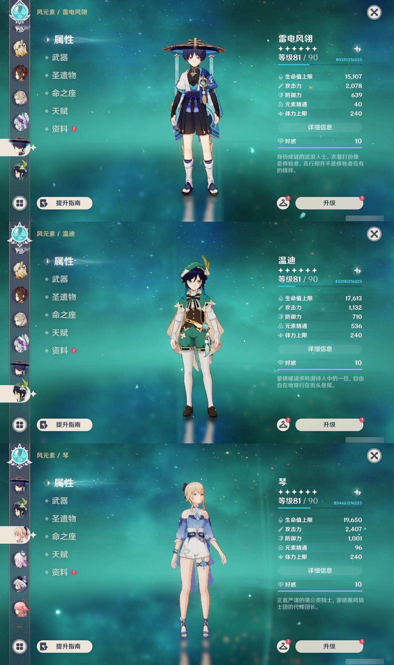 0命希格雯,0命克洛琳德,0命阿蕾奇诺,0命千织,1命闲云,0命娜维娅,2命芙宁娜,1命那维莱特,0命迪希雅,0命流浪者,1命纳西妲,0命妮露,3命提纳里,2命夜兰,0命八重神子,1命申鹤,0命优菈,0命雷电将军,0命枫原万叶,5命神里绫华,0命钟离,1命胡桃,0命甘雨,0命宵宫,0命温迪,1命可莉,0命阿贝多,0命珊瑚宫心海,3命刻晴,4命七七,满命琴,满命莫娜,1命迪卢克,0命希诺宁,0命玛拉妮,0命艾梅莉埃,0命恰斯卡,0命茜特菈莉,0命梦见月瑞希,0命瓦雷莎,0命爱可菲,0命丝柯克,0命伊涅芙,0命哥伦比娅,0命兹白,精1静水流涌之辉,精1雾切之回光,精1护摩之杖,精1四风原典,精1天空之脊,精1天空之刃,精1风鹰剑,精1天空之傲