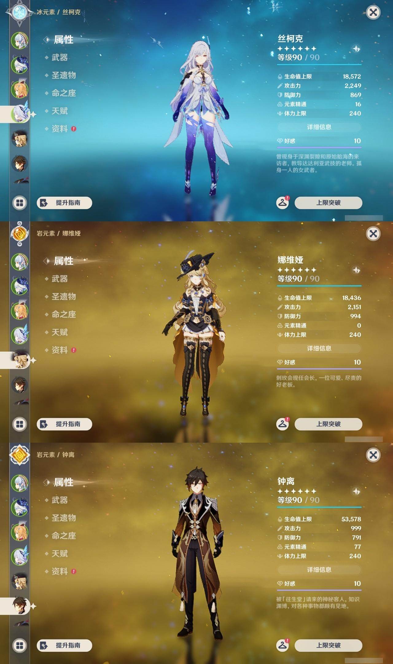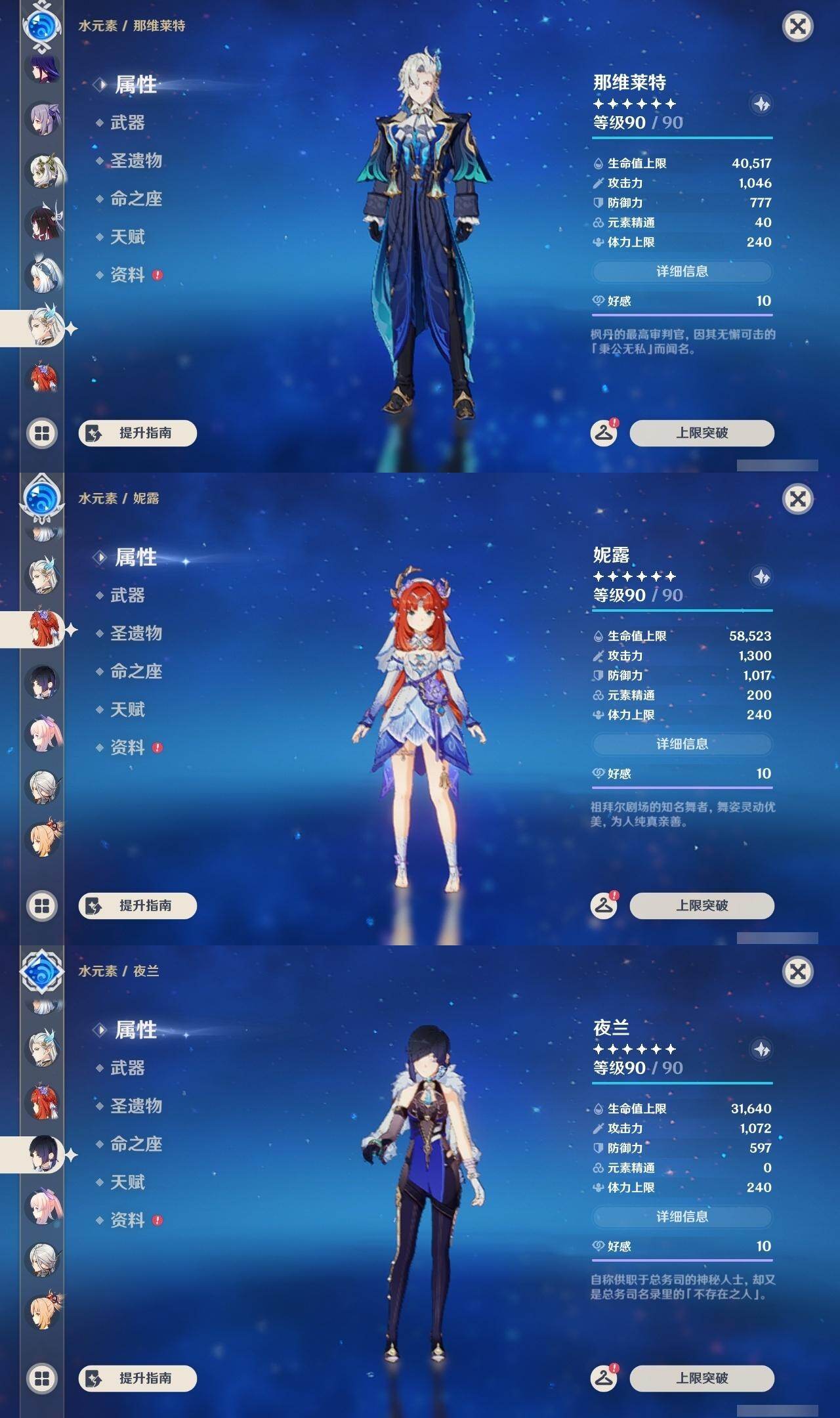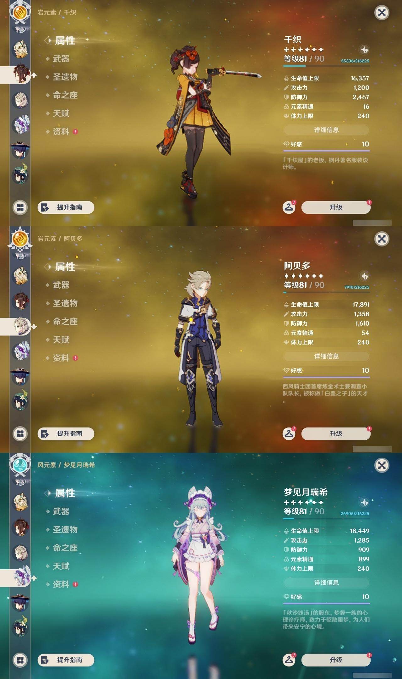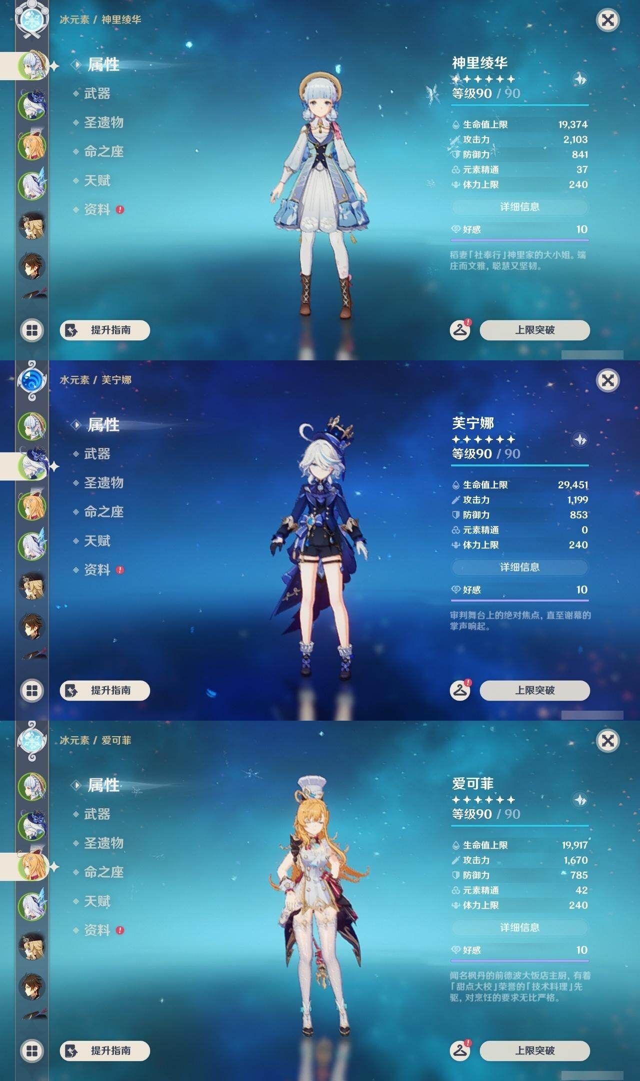 0命希格雯,0命克洛琳德,0命阿蕾奇诺,0命千织,1命闲云,0命娜维娅,2命芙宁娜,1命那维莱特,0命迪希雅,0命流浪者,1命纳西妲,0命妮露,3命提纳里,2命夜兰,0命八重神子,1命申鹤,0命优菈,0命雷电将军,0命枫原万叶,5命神里绫华,0命钟离,1命胡桃,0命甘雨,0命宵宫,0命温迪,1命可莉,0命阿贝多,0命珊瑚宫心海,3命刻晴,4命七七,满命琴,满命莫娜,1命迪卢克,0命希诺宁,0命玛拉妮,0命艾梅莉埃,0命恰斯卡,0命茜特菈莉,0命梦见月瑞希,0命瓦雷莎,0命爱可菲,0命丝柯克,0命伊涅芙,0命哥伦比娅,0命兹白,精1静水流涌之辉,精1雾切之回光,精1护摩之杖,精1四风原典,精1天空之脊,精1天空之刃,精1风鹰剑,精1天空之傲