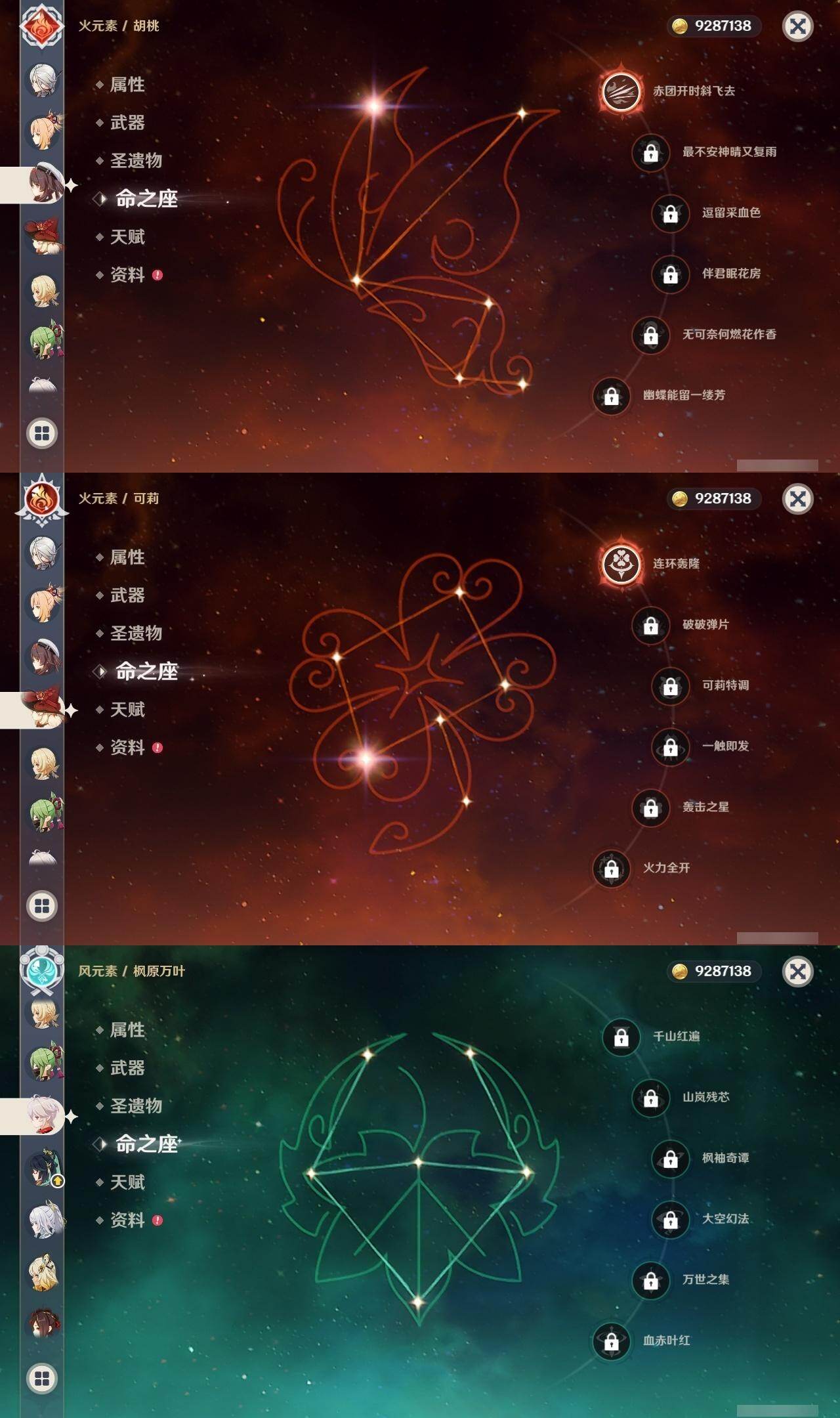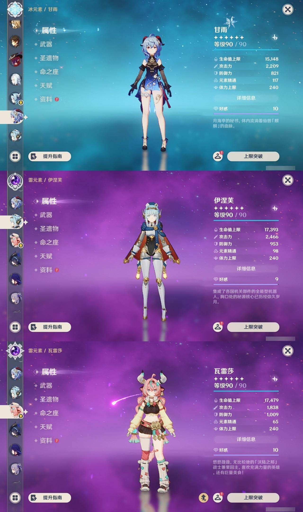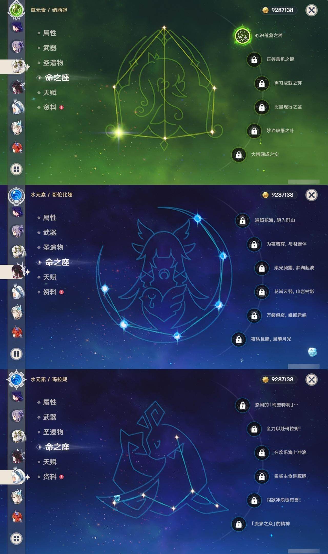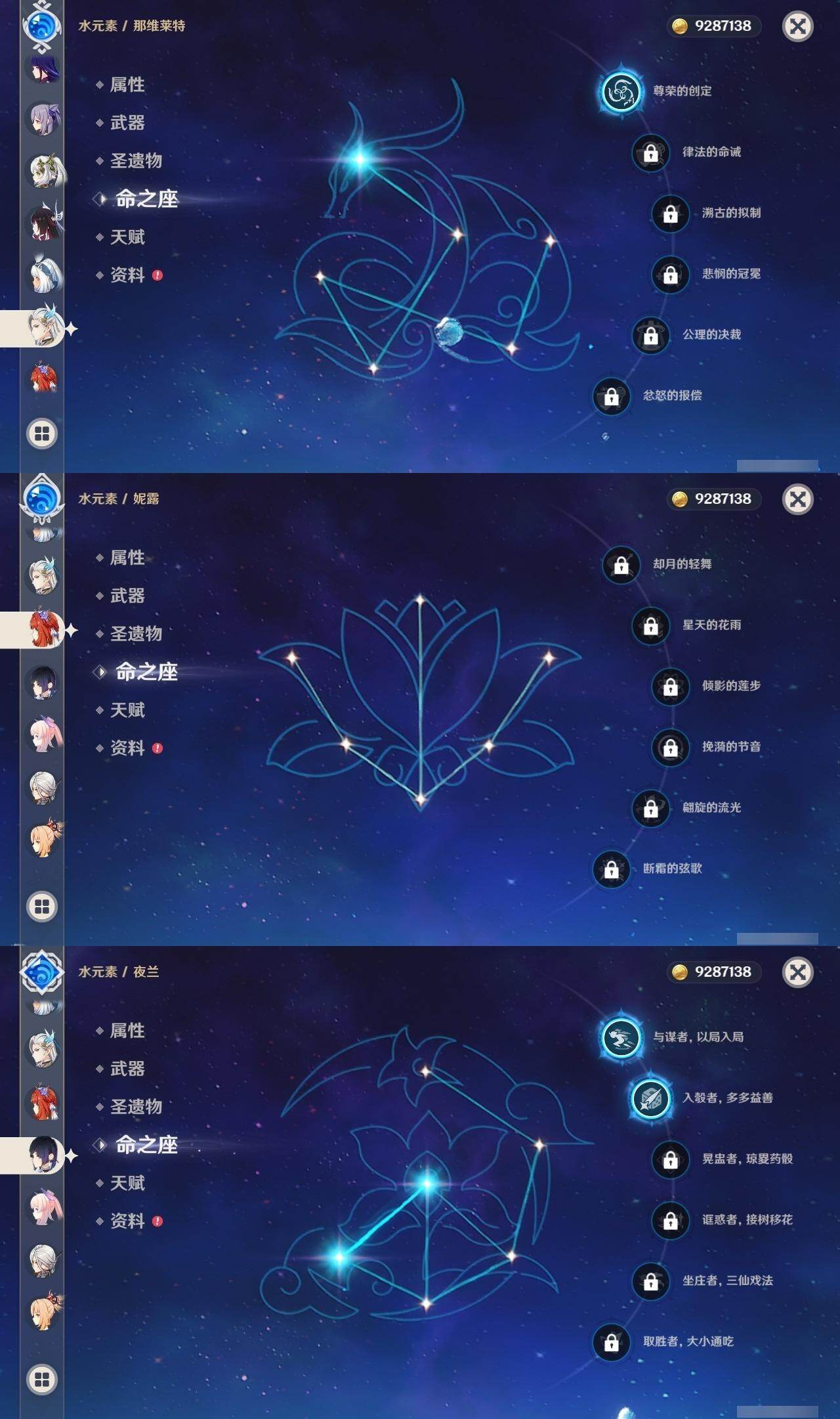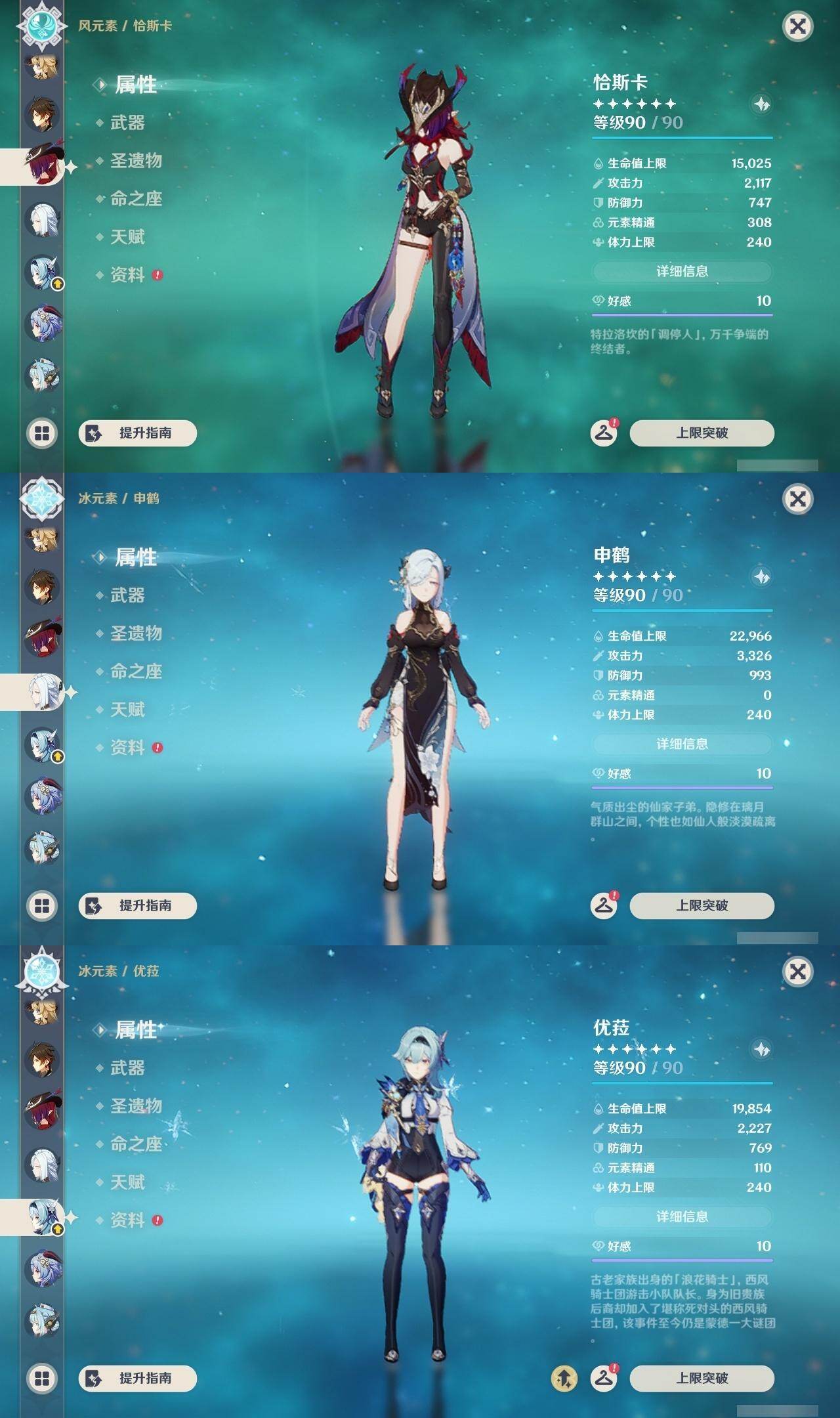 0命希格雯,0命克洛琳德,0命阿蕾奇诺,0命千织,1命闲云,0命娜维娅,2命芙宁娜,1命那维莱特,0命迪希雅,0命流浪者,1命纳西妲,0命妮露,3命提纳里,2命夜兰,0命八重神子,1命申鹤,0命优菈,0命雷电将军,0命枫原万叶,5命神里绫华,0命钟离,1命胡桃,0命甘雨,0命宵宫,0命温迪,1命可莉,0命阿贝多,0命珊瑚宫心海,3命刻晴,4命七七,满命琴,满命莫娜,1命迪卢克,0命希诺宁,0命玛拉妮,0命艾梅莉埃,0命恰斯卡,0命茜特菈莉,0命梦见月瑞希,0命瓦雷莎,0命爱可菲,0命丝柯克,0命伊涅芙,0命哥伦比娅,0命兹白,精1静水流涌之辉,精1雾切之回光,精1护摩之杖,精1四风原典,精1天空之脊,精1天空之刃,精1风鹰剑,精1天空之傲