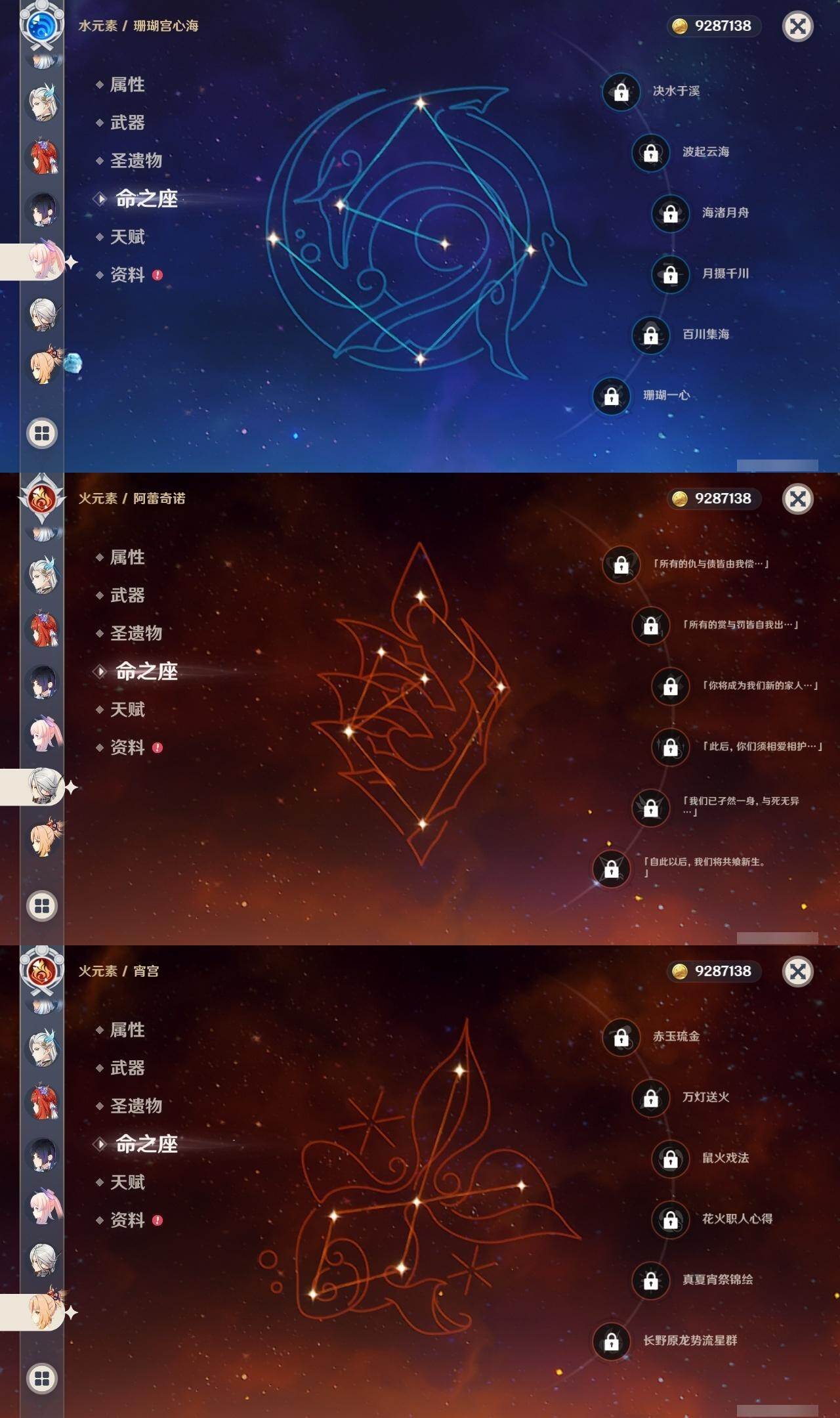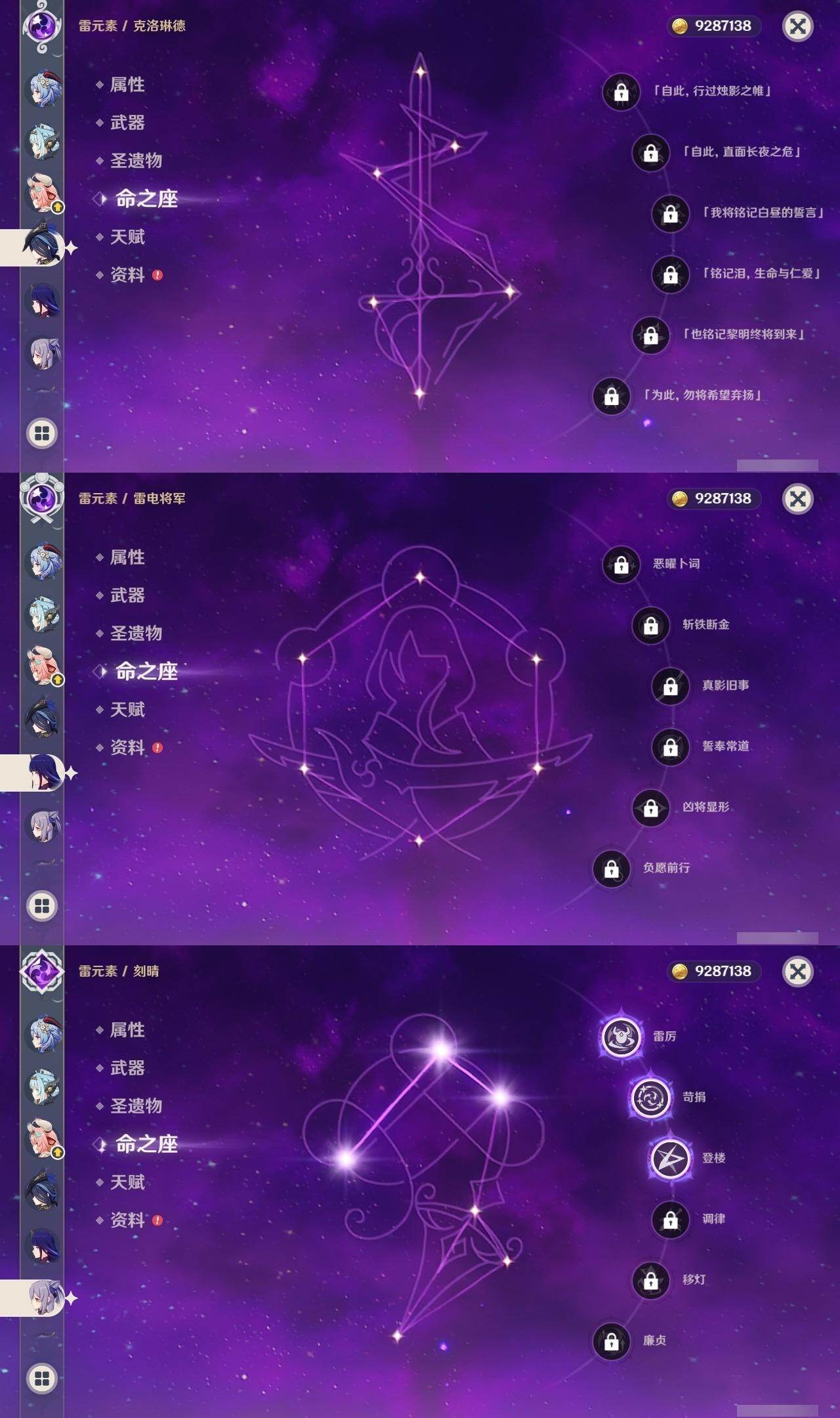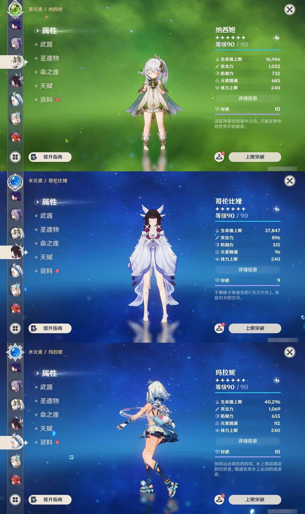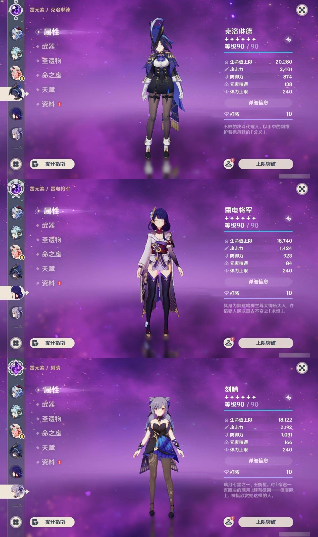 0命希格雯,0命克洛琳德,0命阿蕾奇诺,0命千织,1命闲云,0命娜维娅,2命芙宁娜,1命那维莱特,0命迪希雅,0命流浪者,1命纳西妲,0命妮露,3命提纳里,2命夜兰,0命八重神子,1命申鹤,0命优菈,0命雷电将军,0命枫原万叶,5命神里绫华,0命钟离,1命胡桃,0命甘雨,0命宵宫,0命温迪,1命可莉,0命阿贝多,0命珊瑚宫心海,3命刻晴,4命七七,满命琴,满命莫娜,1命迪卢克,0命希诺宁,0命玛拉妮,0命艾梅莉埃,0命恰斯卡,0命茜特菈莉,0命梦见月瑞希,0命瓦雷莎,0命爱可菲,0命丝柯克,0命伊涅芙,0命哥伦比娅,0命兹白,精1静水流涌之辉,精1雾切之回光,精1护摩之杖,精1四风原典,精1天空之脊,精1天空之刃,精1风鹰剑,精1天空之傲