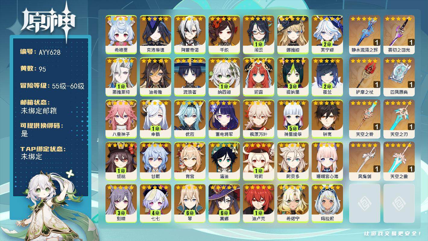 [17255241]60级/95黄/女主/45个五星角色/12个五星武器 0命希格雯,0命克洛琳德,0命阿蕾奇诺,0命千织,1命闲云,0命娜维娅,2命芙宁娜,1命那维莱特,0命迪希雅,0命流浪者,1命纳西妲,0命妮露,3命提纳里,2命夜兰,0命八重神子,1命申鹤,0命优菈,0命雷电将军,0命枫原万叶,5命神里绫华,0命钟离,1命胡桃,0命甘雨,0命宵宫,0命温迪,1命可莉,0命阿贝多,0命珊瑚宫心海,3命刻晴,4命七七,满命琴,满命莫娜,1命迪卢克,0命希诺宁,0命玛拉妮,0命艾梅莉埃,0命恰斯卡,0命茜特菈莉,0命梦见月瑞希,0命瓦雷莎,0命爱可菲,0命丝柯克,0命伊涅芙,0命哥伦比娅,0命兹白,精1静水流涌之辉,精1雾切之回光,精1护摩之杖,精1四风原典,精1天空之脊,精1天空之刃,精1风鹰剑,精1天空之傲