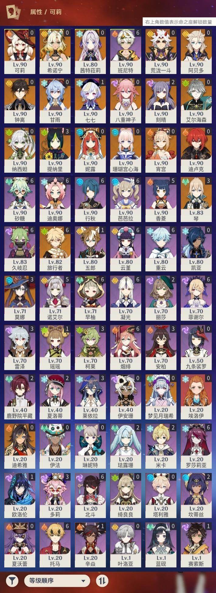 - [15485637]60级/39黄/女主/23个五星角色/9个五星武器 0命阿蕾奇诺,0命闲云,0命那维莱特,0命迪希雅,0命艾尔海森,0命纳西妲,0命神里绫人,0命雷电将军,0命枫原万叶,0命神里绫华,0命钟离,0命胡桃,0命魈,0命可莉,0命达达利亚,0命珊瑚宫心海,3命刻晴,2命七七,2命琴,0命莫娜,0命迪卢克,0命希诺宁,0命玛拉妮,精1鹤鸣余音,精1万世流涌大典,精1千夜浮梦,精1波乱月白经津,精1和璞鸢,精1天空之脊,精1天空之翼,精1天空之卷