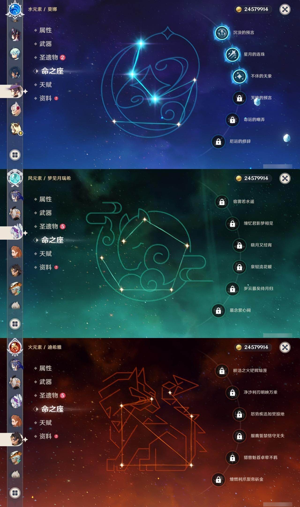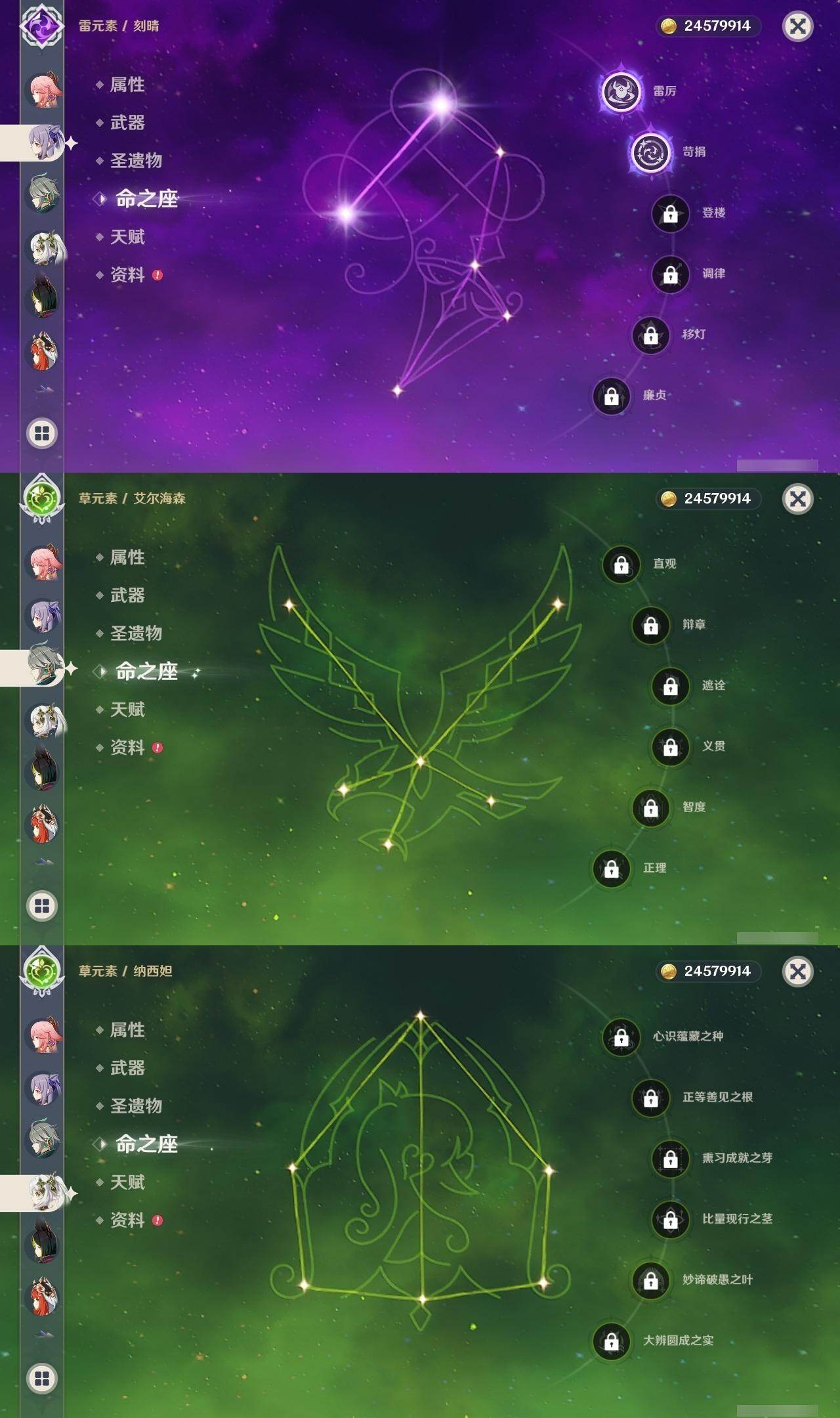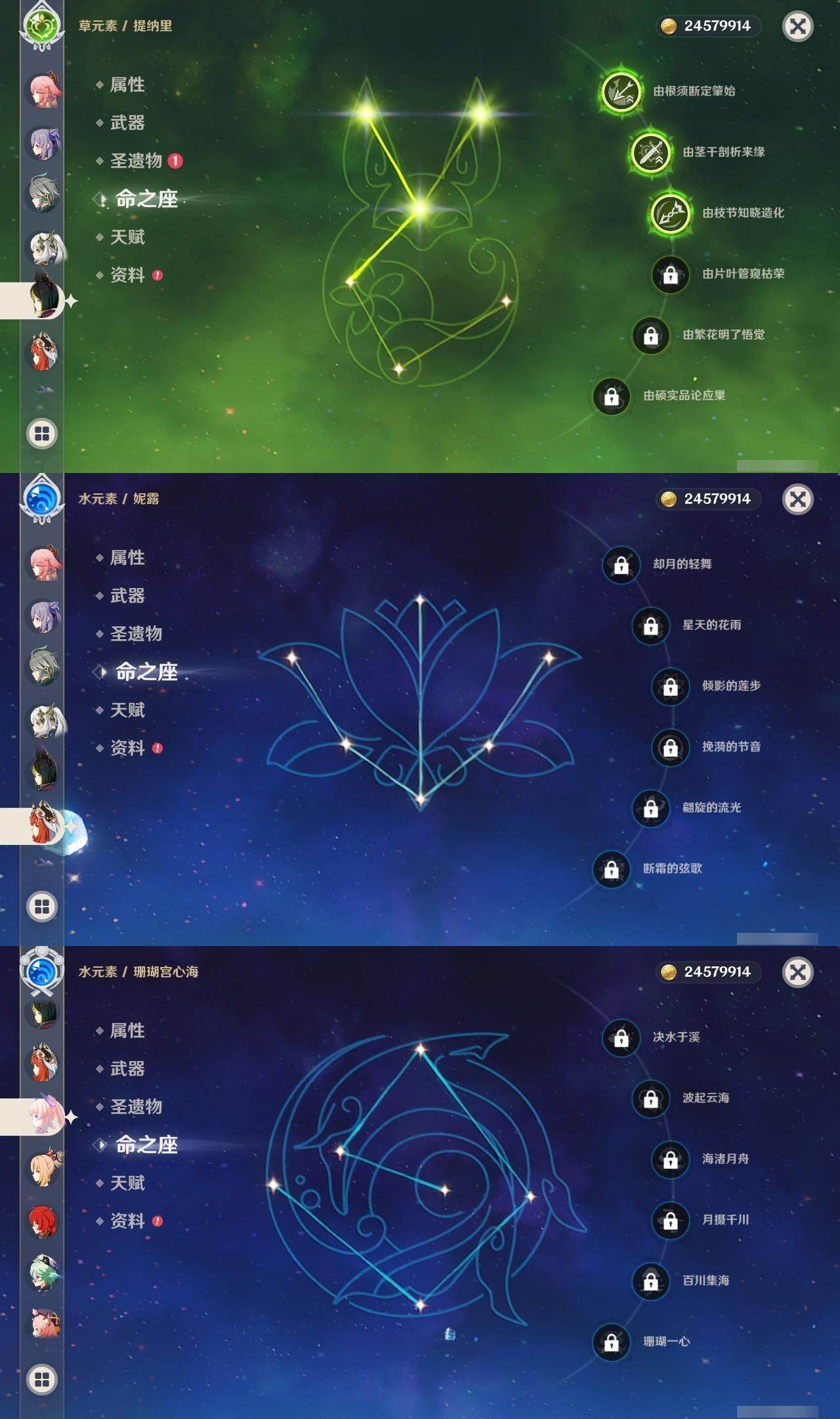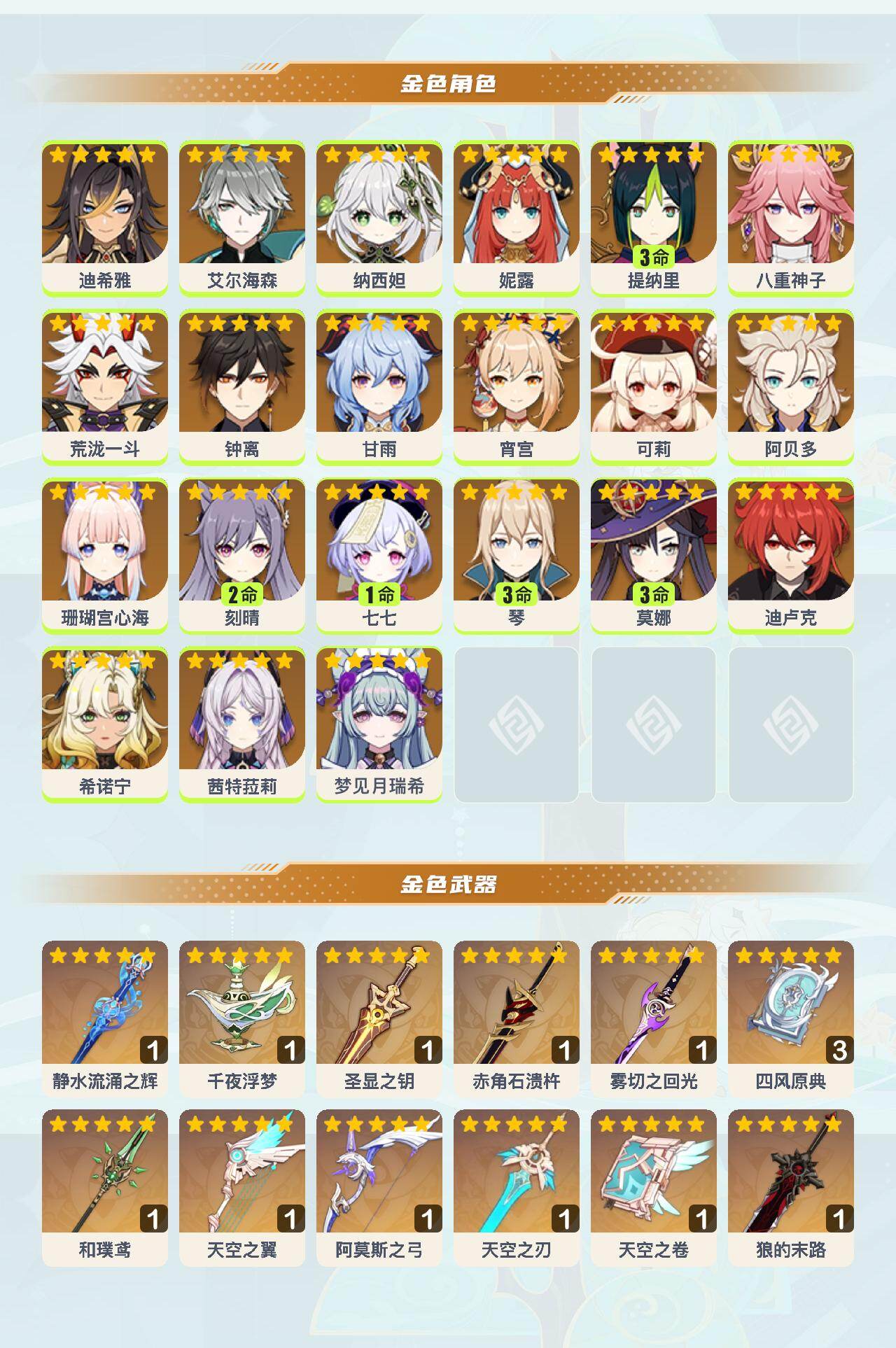 0命迪希雅,0命艾尔海森,0命纳西妲,0命妮露,3命提纳里,0命八重神子,0命荒泷一斗,0命钟离,0命甘雨,0命宵宫,0命可莉,0命阿贝多,0命珊瑚宫心海,2命刻晴,1命七七,3命琴,3命莫娜,0命迪卢克,0命希诺宁,0命茜特菈莉,0命梦见月瑞希,精1静水流涌之辉,精1千夜浮梦,精1圣显之钥,精1赤角石溃杵,精1雾切之回光,精3四风原典,精1和璞鸢,精1天空之翼,精1阿莫斯之弓,精1天空之刃,精1天空之卷,精1狼的末路