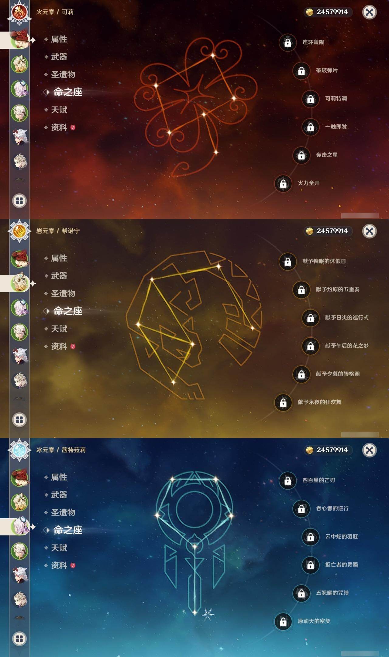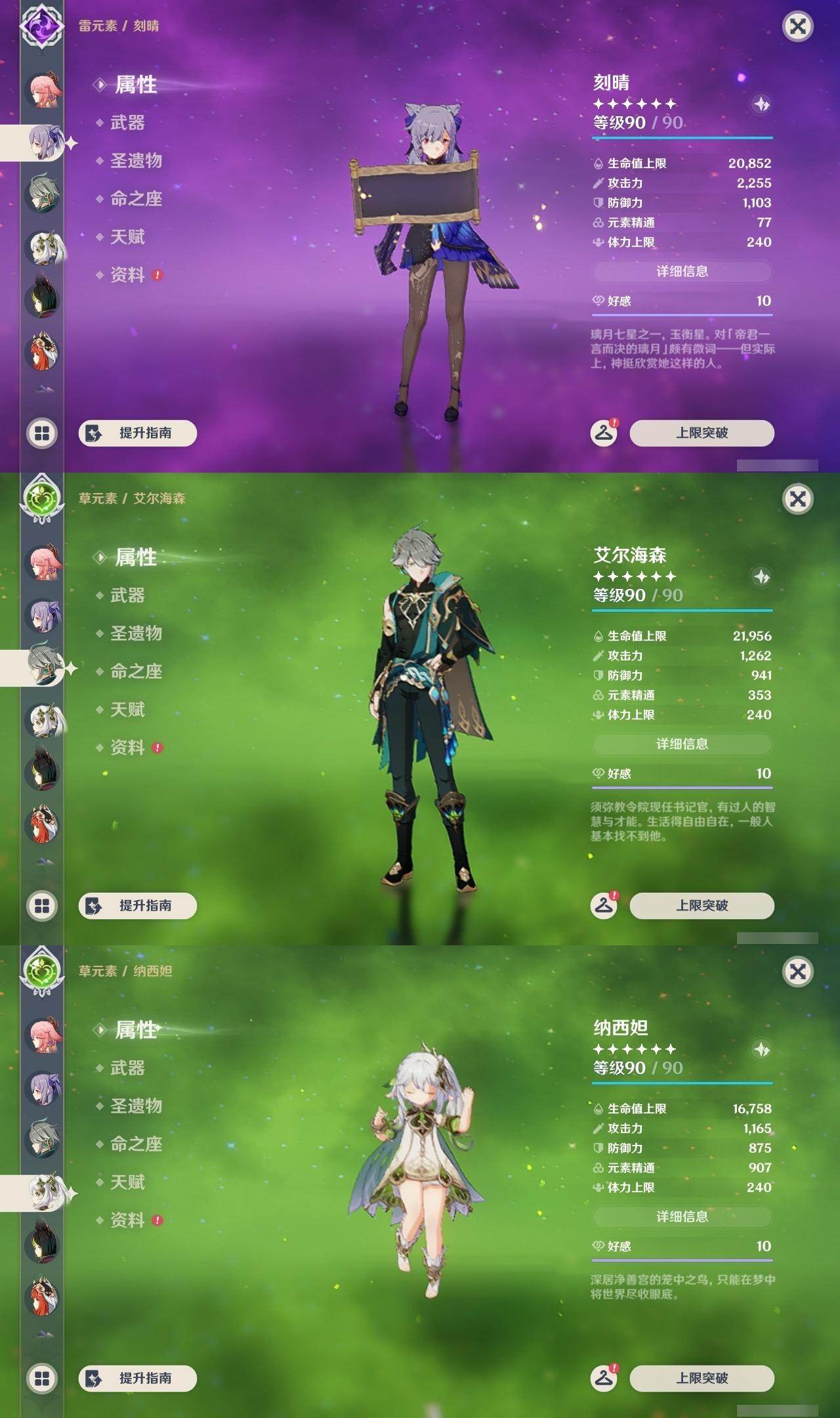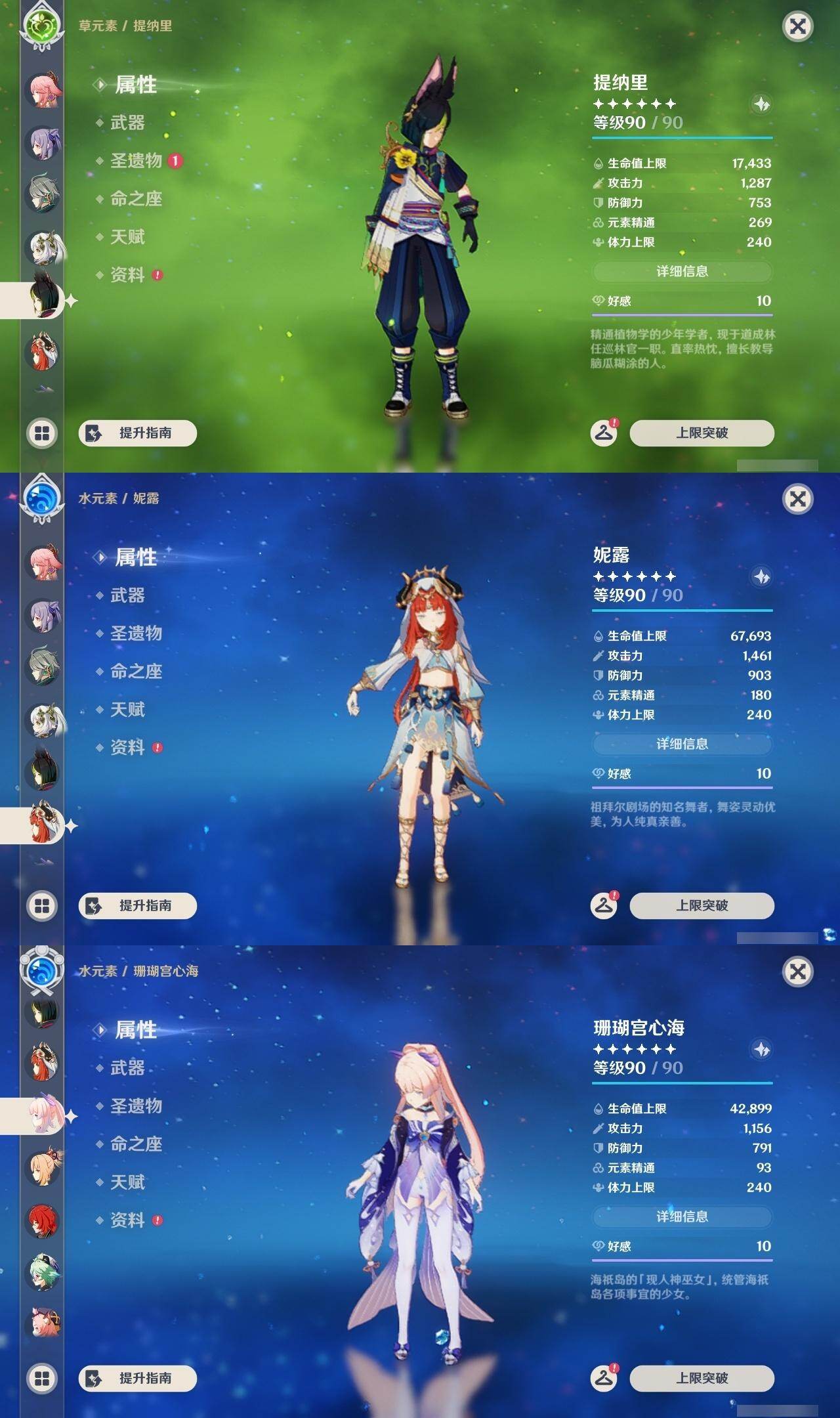 0命迪希雅,0命艾尔海森,0命纳西妲,0命妮露,3命提纳里,0命八重神子,0命荒泷一斗,0命钟离,0命甘雨,0命宵宫,0命可莉,0命阿贝多,0命珊瑚宫心海,2命刻晴,1命七七,3命琴,3命莫娜,0命迪卢克,0命希诺宁,0命茜特菈莉,0命梦见月瑞希,精1静水流涌之辉,精1千夜浮梦,精1圣显之钥,精1赤角石溃杵,精1雾切之回光,精3四风原典,精1和璞鸢,精1天空之翼,精1阿莫斯之弓,精1天空之刃,精1天空之卷,精1狼的末路