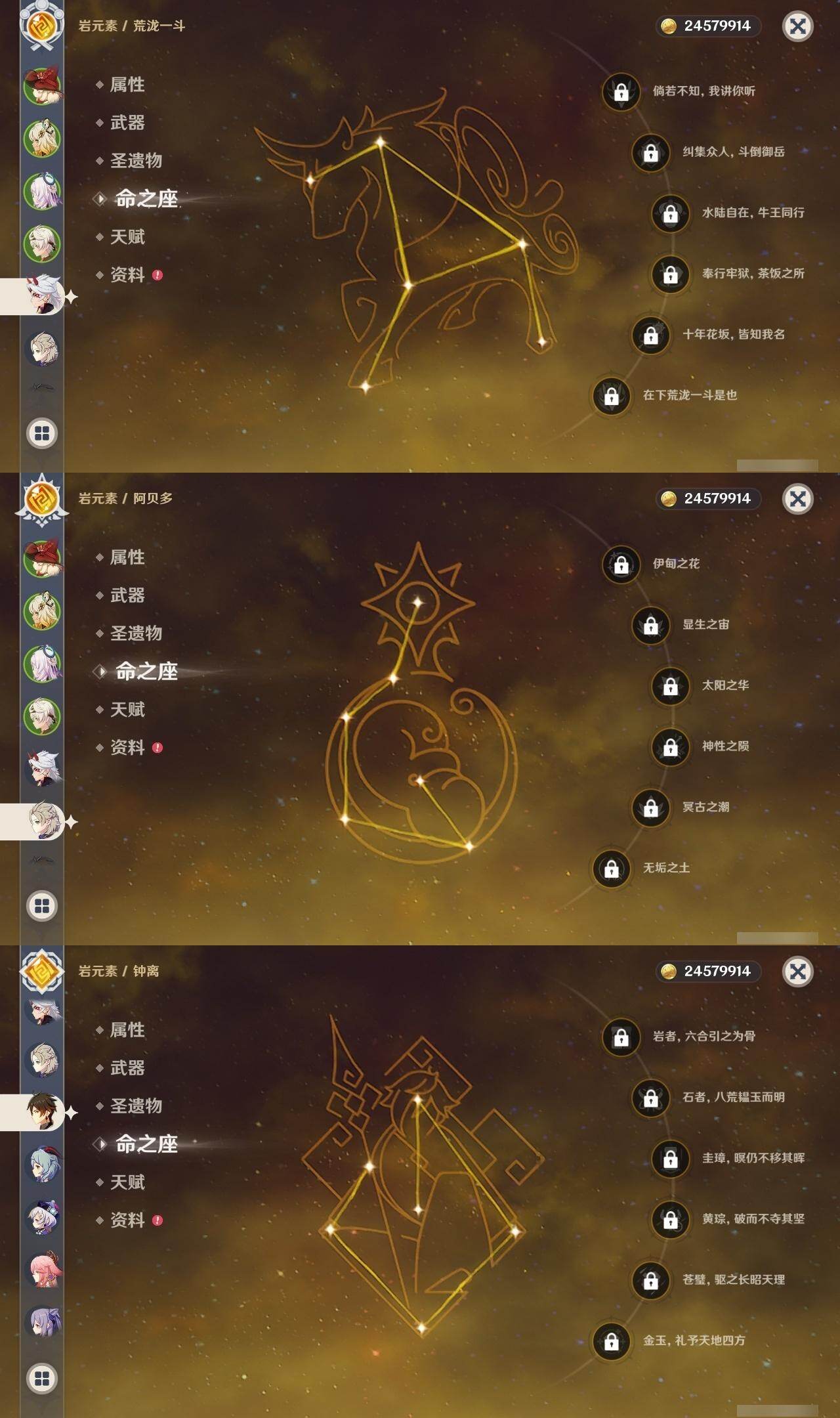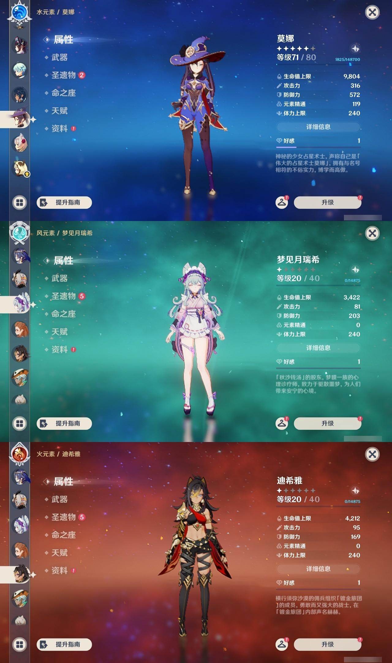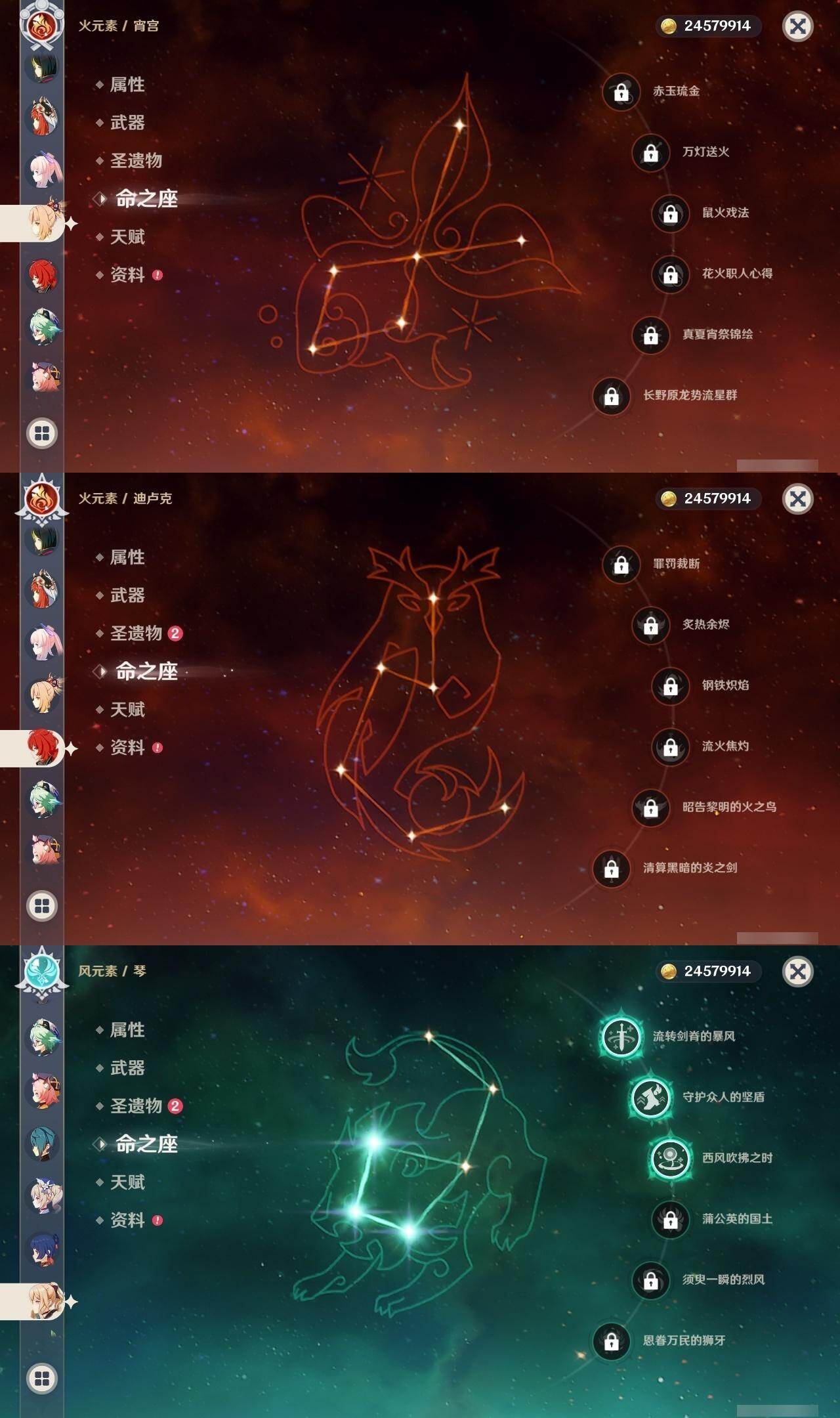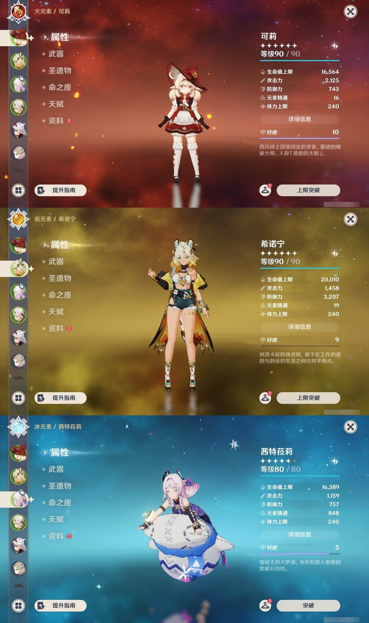 0命迪希雅,0命艾尔海森,0命纳西妲,0命妮露,3命提纳里,0命八重神子,0命荒泷一斗,0命钟离,0命甘雨,0命宵宫,0命可莉,0命阿贝多,0命珊瑚宫心海,2命刻晴,1命七七,3命琴,3命莫娜,0命迪卢克,0命希诺宁,0命茜特菈莉,0命梦见月瑞希,精1静水流涌之辉,精1千夜浮梦,精1圣显之钥,精1赤角石溃杵,精1雾切之回光,精3四风原典,精1和璞鸢,精1天空之翼,精1阿莫斯之弓,精1天空之刃,精1天空之卷,精1狼的末路
