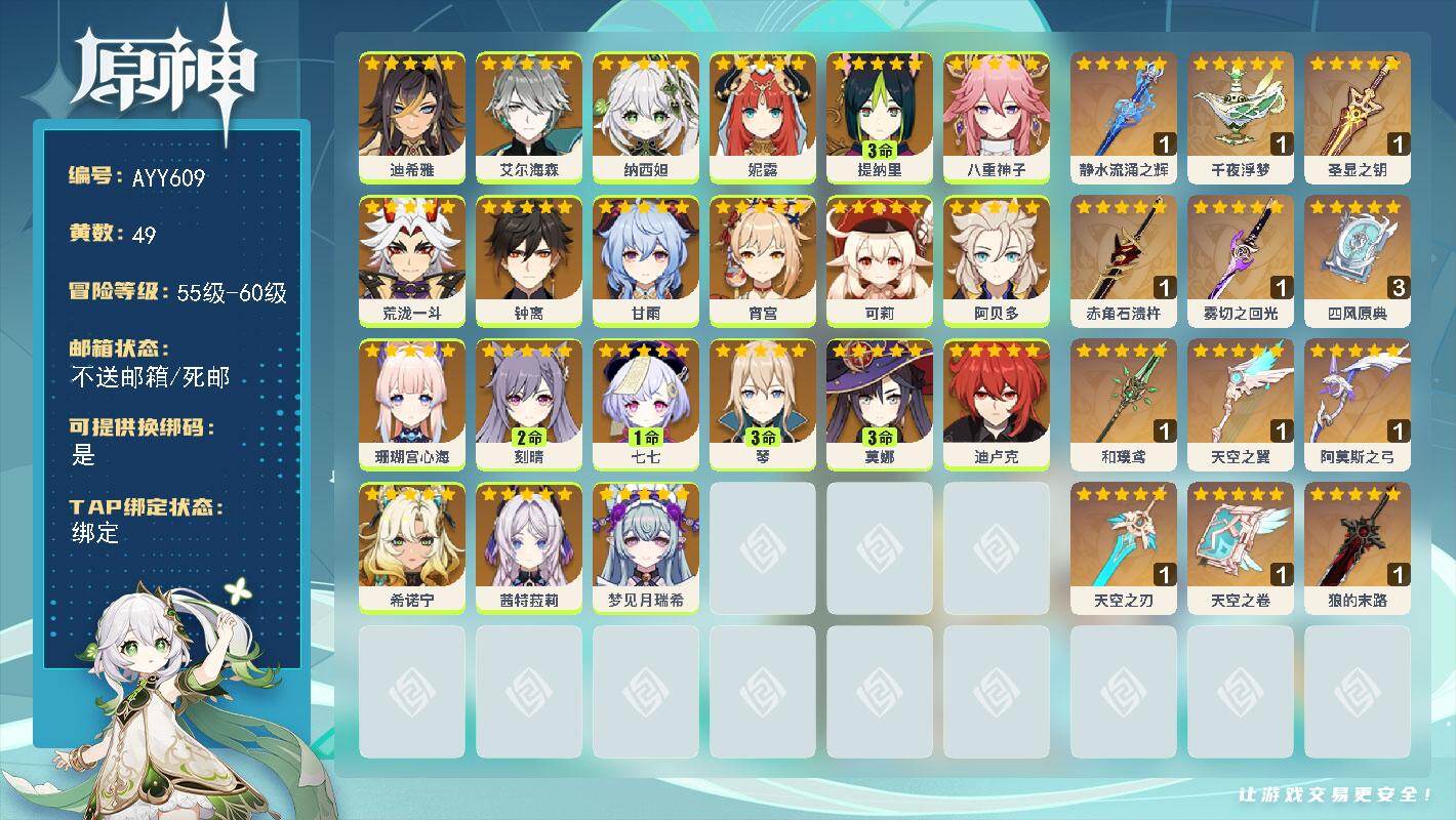 [17255310]60级/49黄/男主/21个五星角色/14个五星武器 0命迪希雅,0命艾尔海森,0命纳西妲,0命妮露,3命提纳里,0命八重神子,0命荒泷一斗,0命钟离,0命甘雨,0命宵宫,0命可莉,0命阿贝多,0命珊瑚宫心海,2命刻晴,1命七七,3命琴,3命莫娜,0命迪卢克,0命希诺宁,0命茜特菈莉,0命梦见月瑞希,精1静水流涌之辉,精1千夜浮梦,精1圣显之钥,精1赤角石溃杵,精1雾切之回光,精3四风原典,精1和璞鸢,精1天空之翼,精1阿莫斯之弓,精1天空之刃,精1天空之卷,精1狼的末路