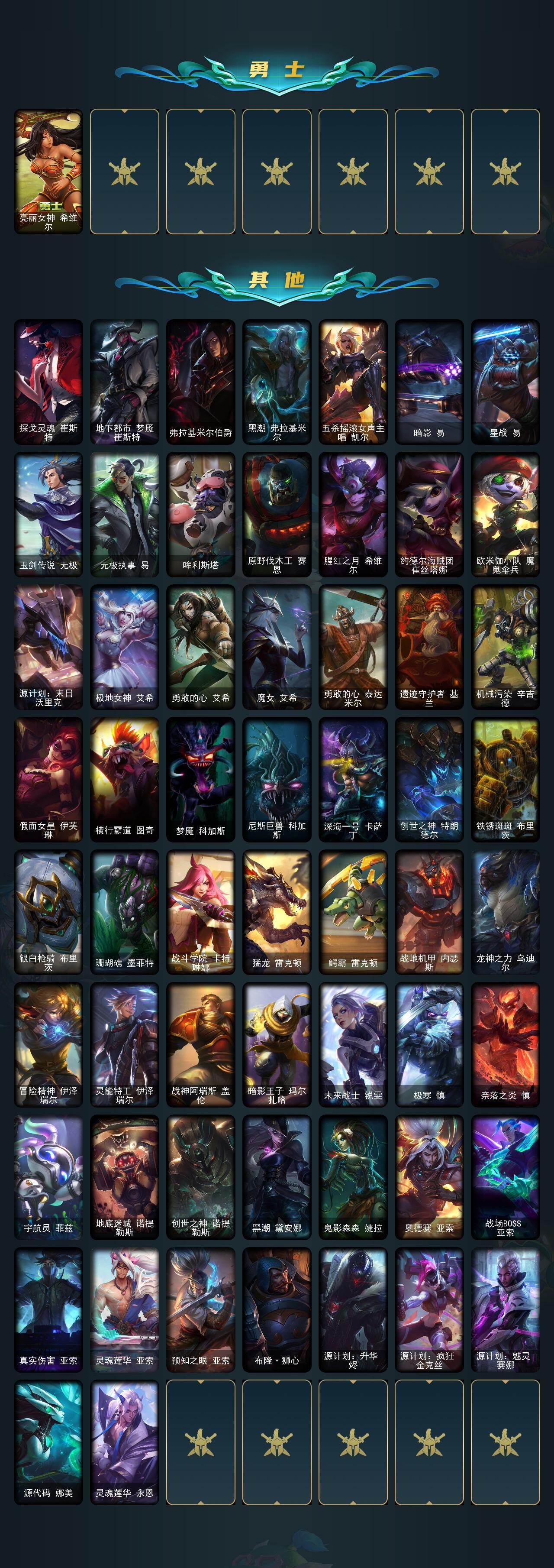 【其他皮肤1】:探戈灵魂崔斯特,地下都市梦魇崔斯特,弗拉基米尔伯爵,黑潮弗拉基米尔,五杀摇滚女声主唱凯尔,暗影易,星战易,玉剑传说无极,无极执事易,哞利斯塔,原野伐木工赛恩,腥红之月希维尔,约德尔海贼团崔丝塔娜,欧米伽小队魔鬼伞兵,源计划末日沃里克,极地女神艾希,勇敢的心艾希,魔女艾希,勇敢的心泰达米尔,遗迹守护者基兰,机械污染辛吉德,假面女皇伊芙琳,横行霸道图奇,梦魇科加斯,尼斯巨兽科加斯,深海一号卡萨丁,创世之神特朗德尔,铁锈斑斑布里茨,银白枪骑布里茨,珊瑚礁墨菲特,战斗学院卡特琳娜,猛龙雷克顿,鳄霸雷克顿,战地机甲内瑟斯,龙神之力乌迪尔,冒险精神伊泽瑞尔,灵能特工伊泽瑞尔,战神阿瑞斯盖伦,暗影王子玛尔扎哈,未来战士锐雯,极寒慎,奈落之炎慎,宇航员菲兹,地底迷城诺提勒斯,创世之神诺提勒斯,黑潮黛安娜,鬼影森森婕拉,奥德赛亚索,战场BOSS亚索,真实伤