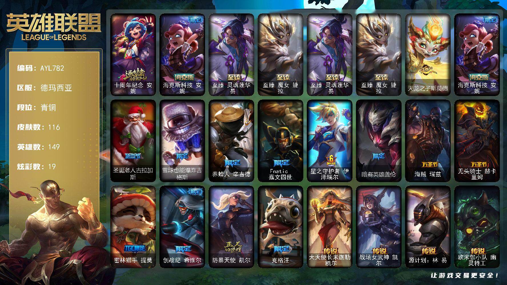 [17255323]青铜段位-149英雄-116皮肤-19炫彩-0终极-4神话-13限定-15传说-23史诗 【神话皮肤】:十周年纪念安妮,海克斯科技安妮,至臻灵魂莲华易,至臻魔女婕拉 【至臻皮肤】:至臻灵魂莲华易,至臻魔女婕拉 【臻彩皮肤】:魔女阿卡丽虚荣 【年限皮肤】:天龙之子斯莫德 【海克斯皮肤】:海克斯科技安妮 【冰雪限定】:圣诞老人古拉加斯,雪球也能爆炸吉格斯 【限定皮肤】:养蜂人辛吉德,Fnatic嘉文四世,星之守护者伊泽瑞尔,暗裔英雄盖伦,海贼瑞兹,无头骑士赫卡里姆,密林猎手提莫,创战纪希维尔,防暴天使凯尔,克格汪 【传说皮肤】:大天使长米迦勒凯尔,战场女武神凯尔,源计划林易,欧米伽小队幽灵特工,烈焰雄心崔丝塔娜,女皇艾希,西部天使艾希,最终BOSS维迦,第三类接触黑默丁格,炼狱魔犬内瑟斯,屠龙勇士潘森,钢铁军团盖伦,星之守护者拉克丝,暗星女王拉克丝,黑夜使者亚索 【史诗皮肤】:摄魂男爵弗拉基米尔,铁血剑豪易,黑帮狂花厄运小姐,紫晶射手艾希,恐惧新星普朗克,抵抗军天使凯特琳,铁血狙击手凯特琳,海贼魅影卡特琳娜,暗星嘉文四世,防弹武僧李青,苍穹之光薇恩,法老王朝内瑟斯,冰川勇者伊泽瑞尔,铁甲雄心盖伦,孤高游侠盖伦,帝王斑蝶克格莫,腥红之月鬼武者慎,钢之逆鳞希瓦娜,银河魔装机神希瓦娜,银河魔装机神菲兹,源计划风亚索,腥红之月亚索,上古战魂雷克塞 【王者皮肤】:五杀摇滚鼓手奥拉夫,星空之门内瑟斯 【勇士皮肤】:亮丽女神希维尔 【其他皮肤1】:探戈灵魂崔斯特,地下都市梦魇崔斯特,弗拉基米尔伯爵,黑潮弗拉基米尔,五杀摇滚女声主唱凯尔,暗影易,星战易,玉剑传说无极,无极执事易,哞利斯塔,原野伐木工赛恩,腥红之月希维尔,约德尔海贼团崔丝塔娜,欧米伽小队魔鬼伞兵,源计划末日沃里克,极地女神艾希,勇敢的心艾希,魔女艾希,勇敢的心泰达米尔,遗迹守护者基兰,机械污染辛吉德,假面女皇伊芙琳,横行霸道图奇,梦魇科加斯,尼斯巨兽科加斯,深海一号卡萨丁,创世之神特朗德尔,铁锈斑斑布里茨,银白枪骑布里茨,珊瑚礁墨菲特,战斗学院卡特琳娜,猛龙雷克顿,鳄霸雷克顿,战地机甲内瑟斯,龙神之力乌迪尔,冒险精神伊泽瑞尔,灵能特工伊泽瑞尔,战神阿瑞斯盖伦,暗影王子玛尔扎哈,未来战士锐雯,极寒慎,奈落之炎慎,宇航员菲兹,地底迷城诺提勒斯,创世之神诺提勒斯,黑潮黛安娜,鬼影森森婕拉,奥德赛亚索,战场BOSS亚索,真实伤