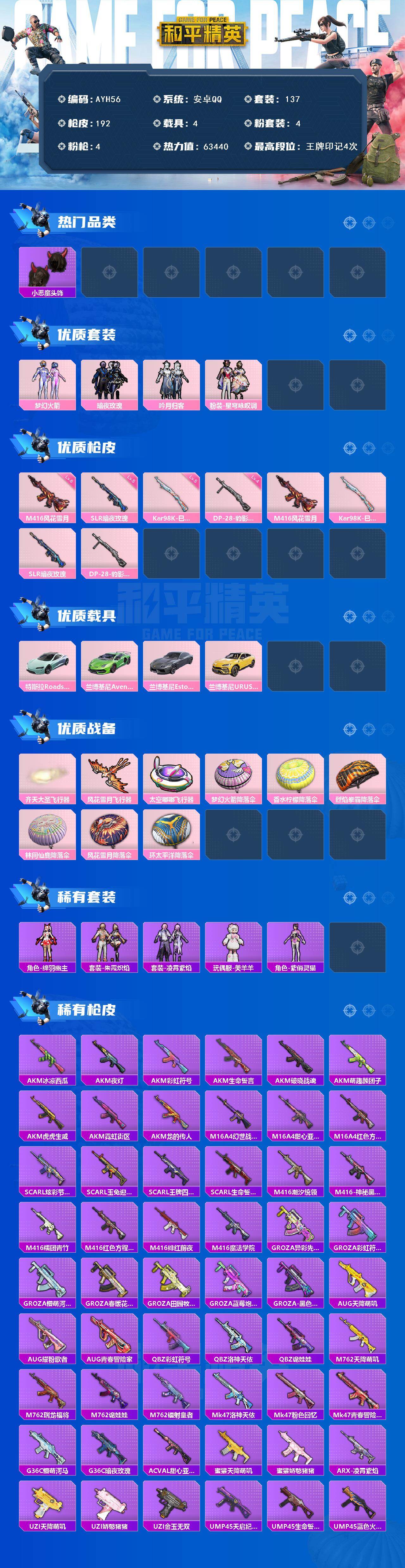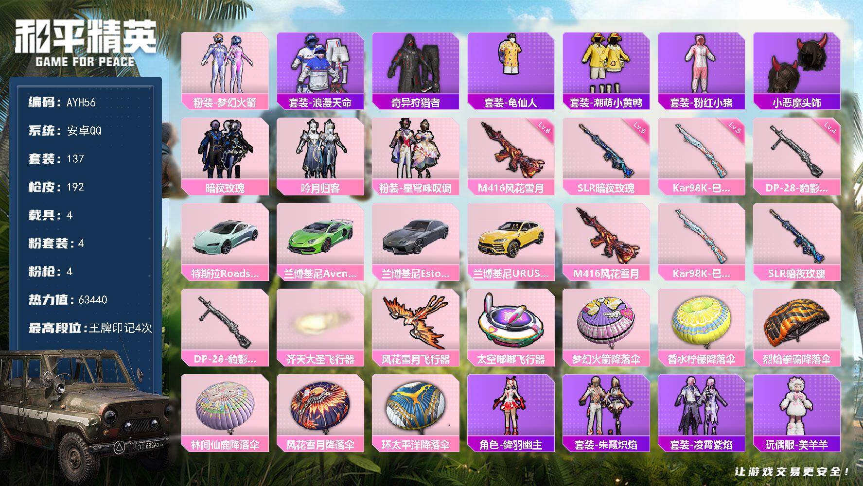 [17255414]【店主推荐捡漏号!可直接换绑】地铁满天赋安卓 手Q-4粉装-4特效枪-4载具-3粉色飞行器-63440热力值-4王牌印记-137套装-192枪皮热门品类】:粉装-梦幻火箭,套装-浪漫天命,套装-奇异狩猎者,套装-龟仙人,套装-潮萌小黄鸭,套装-粉红小猪,小恶魔头饰【粉色载具】:特斯拉Roadster(水滴蓝),兰博基尼Aventador SVJ(翡翠绿),兰博基尼Estoque(银翼灰),兰博基尼URUS(明艳黄)【粉色套装】:粉装-梦幻火箭,粉装-暗夜玫瑰,粉装-吟月归客,粉装-星穹咏叹调【粉色枪皮等级】:M416-风花雪月(六级),Kar98K-巳巳如意(五级),SLR-暗夜玫瑰(五级),DP-28-豹影疾电(四级)【粉色枪皮】:M416-风花雪月,Kar98K-巳巳如意,SLR-暗夜玫瑰,DP-28-豹影疾电【粉色飞行器】:齐天大圣飞行器,风花雪月飞行器,太空嘟嘟飞行器