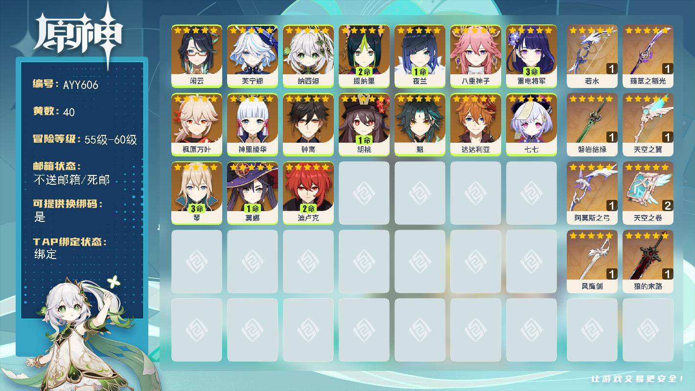 [17255342]57级/40黄/男主/17个五星角色/9个五星武器 0命闲云,0命芙宁娜,0命纳西妲,2命提纳里,1命夜兰,0命八重神子,3命雷电将军,0命枫原万叶,0命神里绫华,0命钟离,1命胡桃,0命魈,0命达达利亚,0命七七,3命琴,1命莫娜,2命迪卢克,精1若水,精1薙草之稻光,精1磐岩结绿,精1天空之翼,精1阿莫斯之弓,精2天空之卷,精1风鹰剑,精1狼的末路
