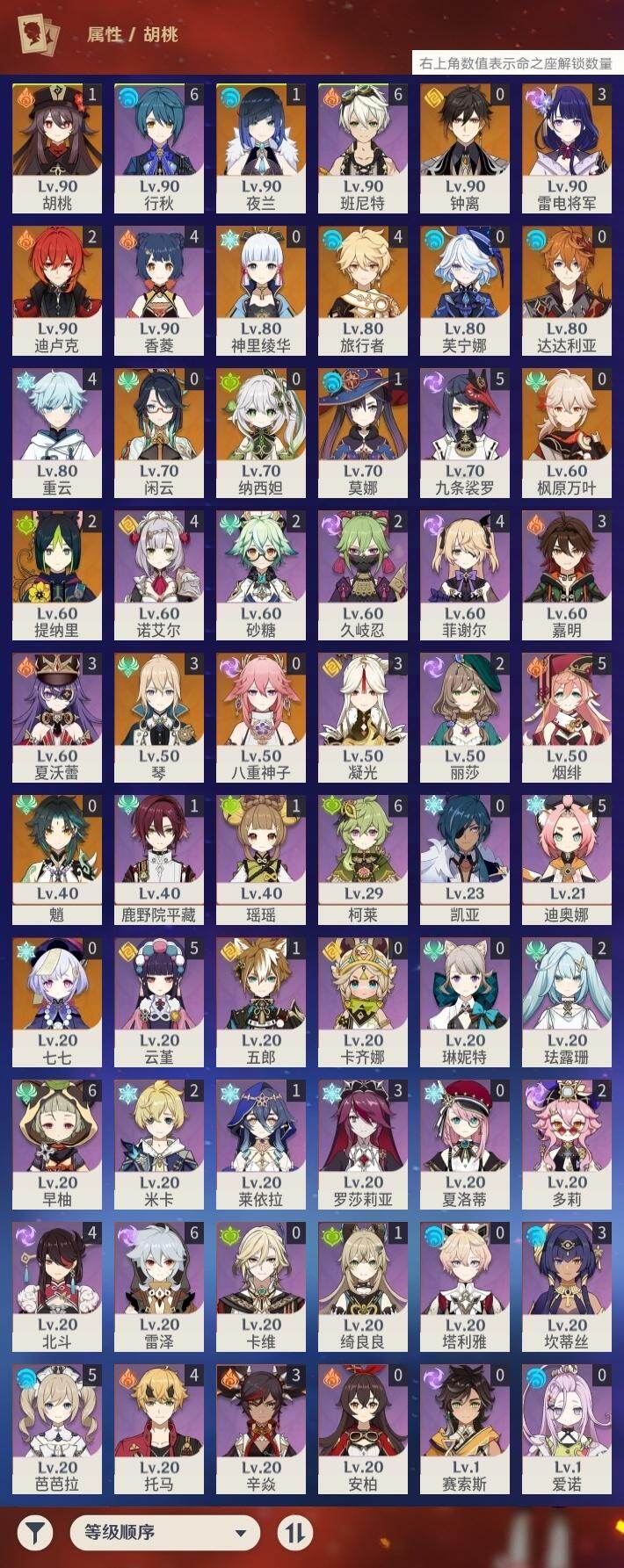 - [15244477]60级/50黄/男主/23个五星角色/14个五星武器 0命娜维娅,0命芙宁娜,1命那维莱特,0命迪希雅,0命艾尔海森,0命纳西妲,0命妮露,2命提纳里,1命夜兰,0命申鹤,0命荒泷一斗,0命雷电将军,0命枫原万叶,0命神里绫华,0命钟离,0命胡桃,0命魈,0命珊瑚宫心海,2命刻晴,0命七七,满命琴,0命菈乌玛,0命菲林斯,精1静水流涌之辉,精1裁叶萃光,精1千夜浮梦,精1若水,精1薙草之稻光,精1雾切之回光,精1护摩之杖,精1四风原典,精1和璞鸢,精1阿莫斯之弓,精1风鹰剑,精2狼的末路