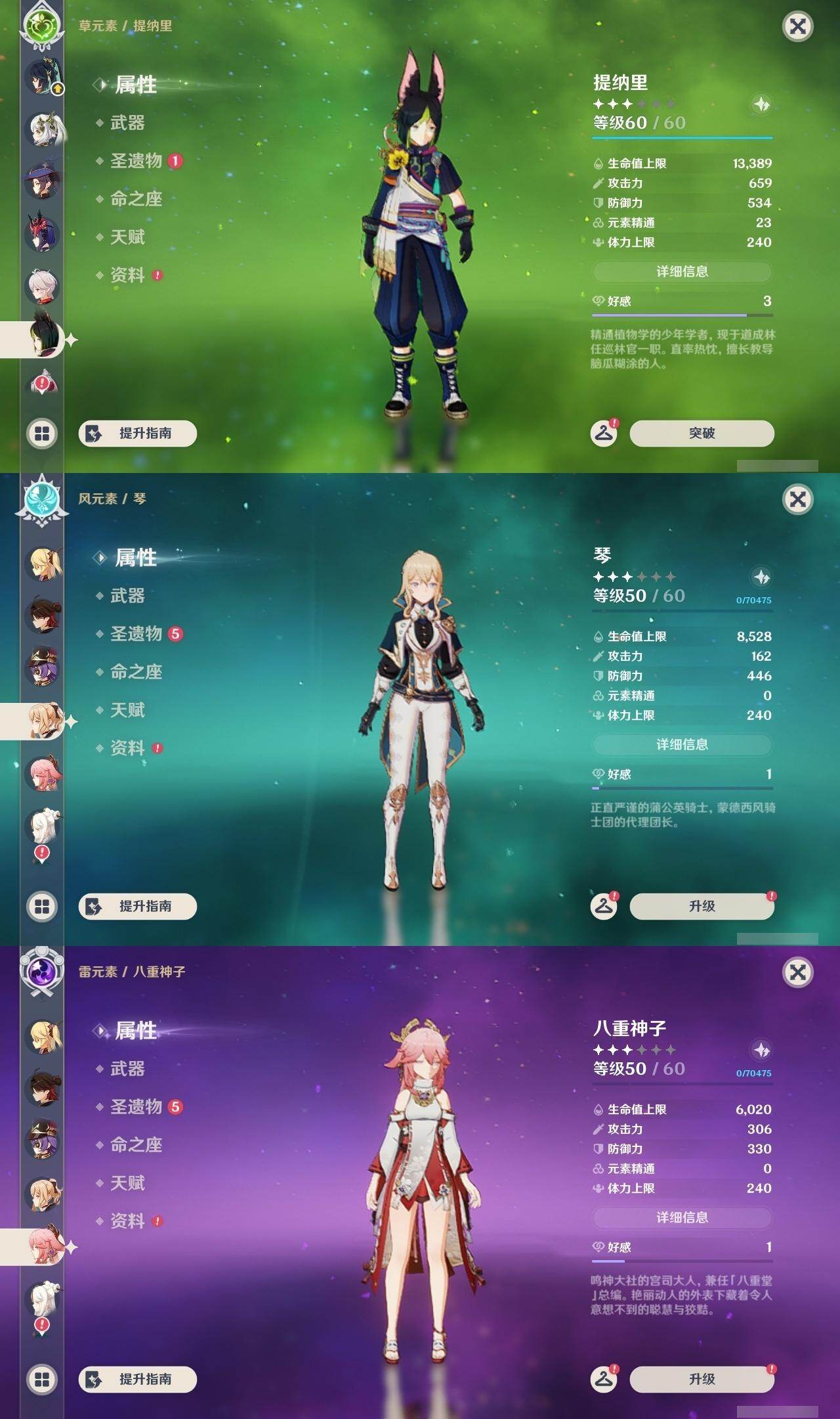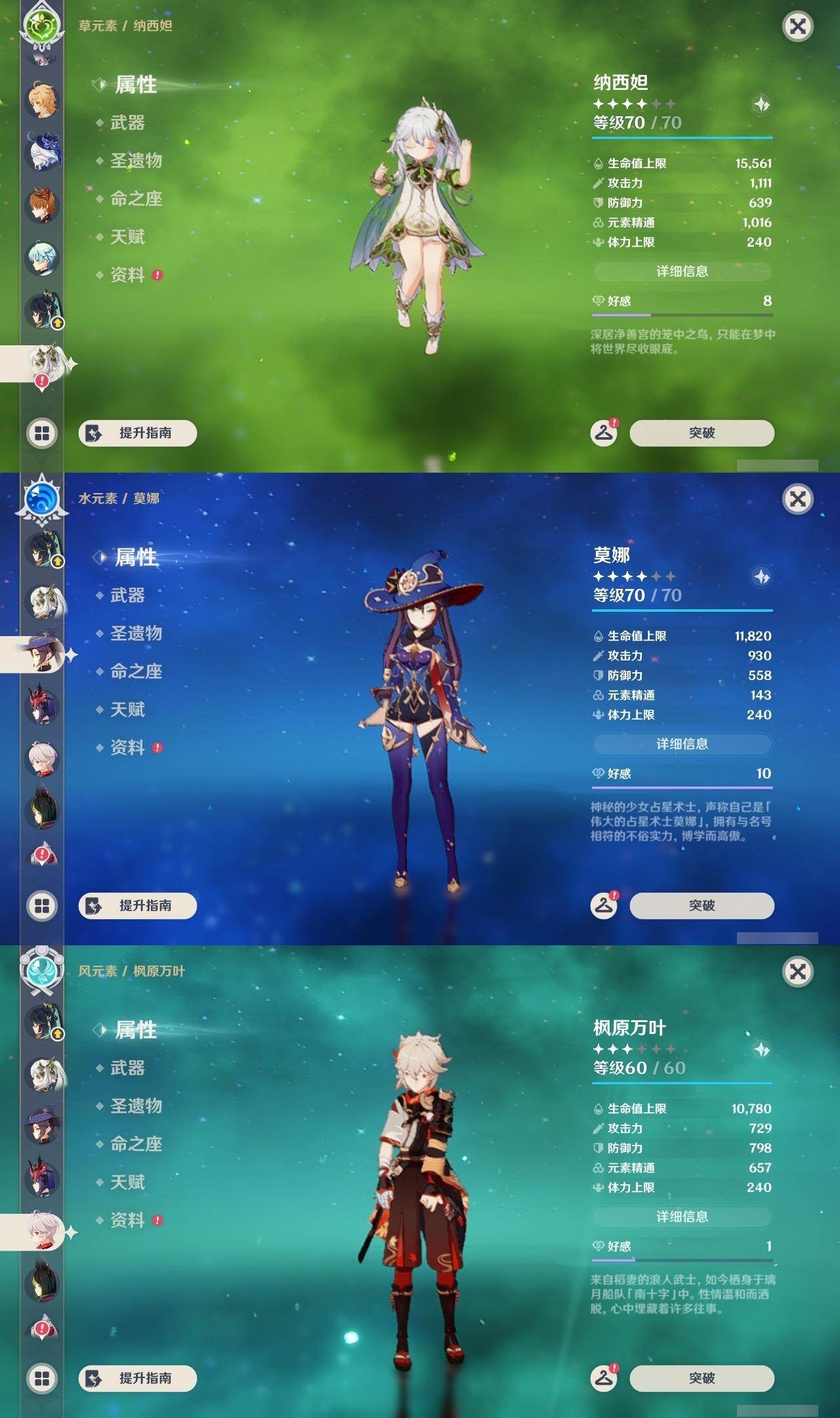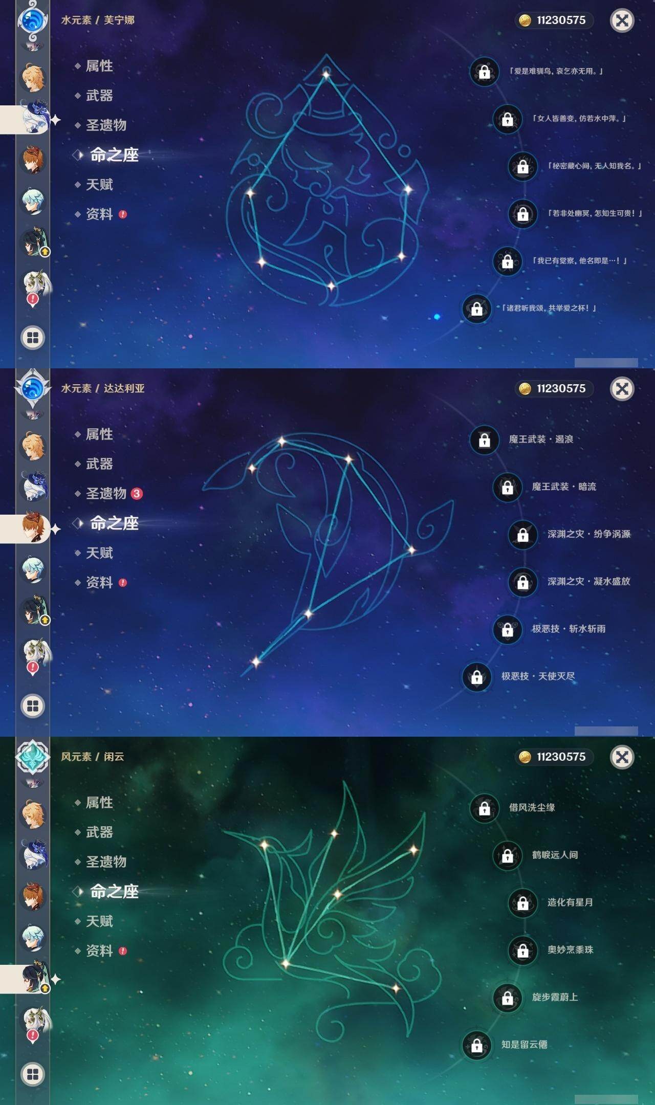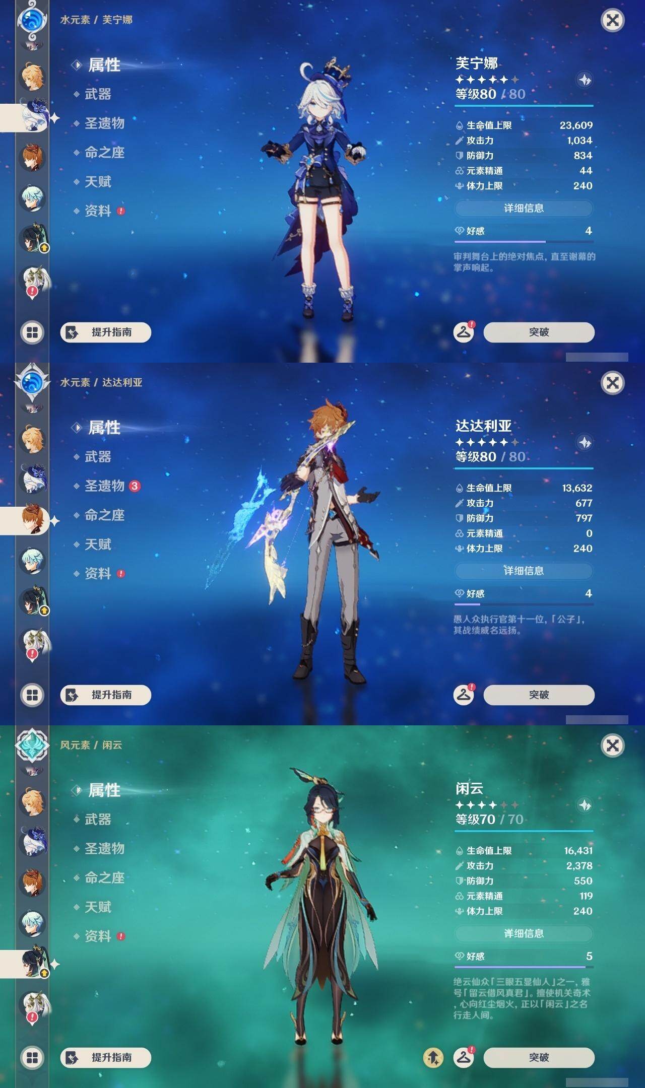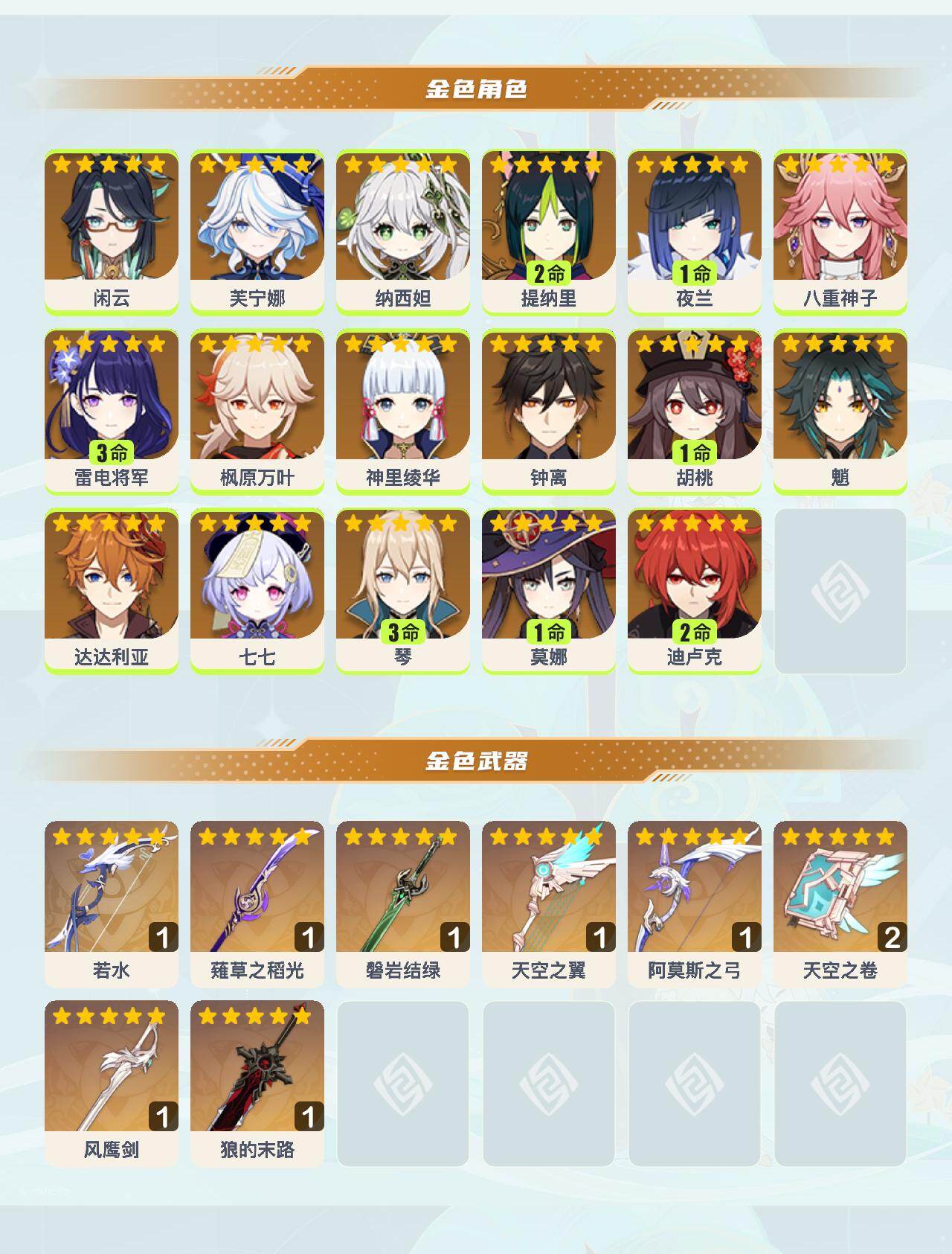 0命闲云,0命芙宁娜,0命纳西妲,2命提纳里,1命夜兰,0命八重神子,3命雷电将军,0命枫原万叶,0命神里绫华,0命钟离,1命胡桃,0命魈,0命达达利亚,0命七七,3命琴,1命莫娜,2命迪卢克,精1若水,精1薙草之稻光,精1磐岩结绿,精1天空之翼,精1阿莫斯之弓,精2天空之卷,精1风鹰剑,精1狼的末路