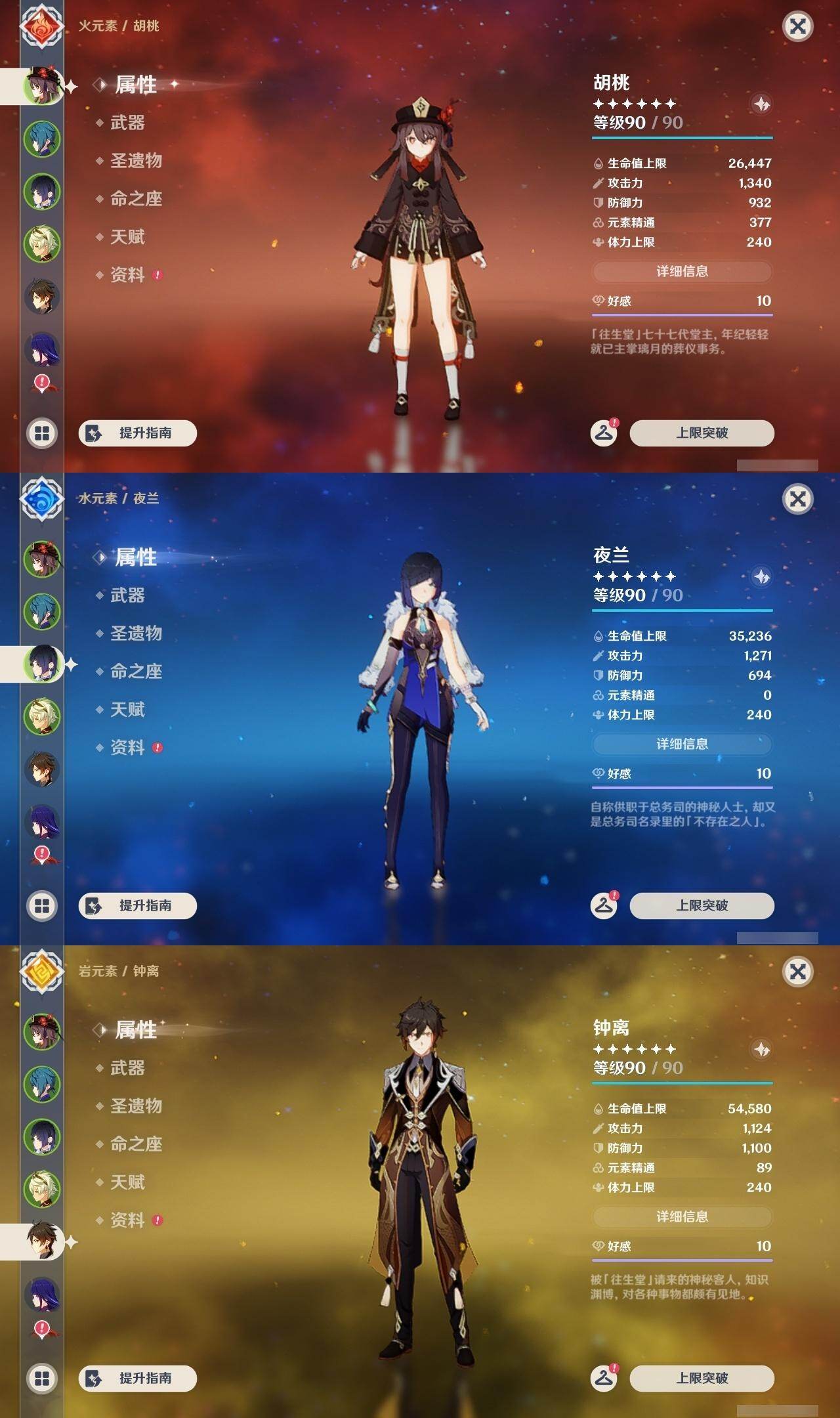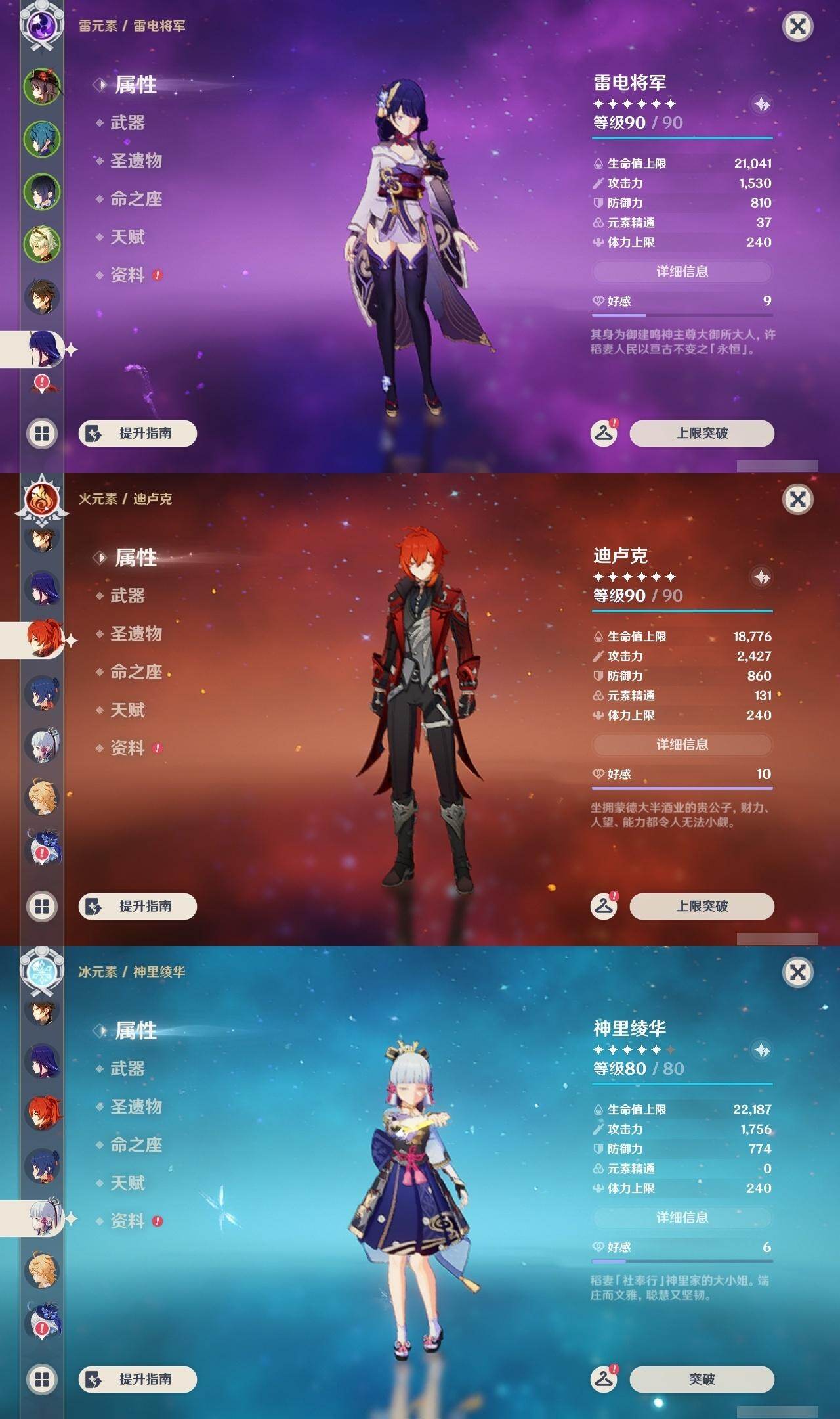 胡桃,钟离,雷电将军,迪卢克,神里凌华,达达利亚,莫娜,枫原万叶,琴,八重神子,魈,七七