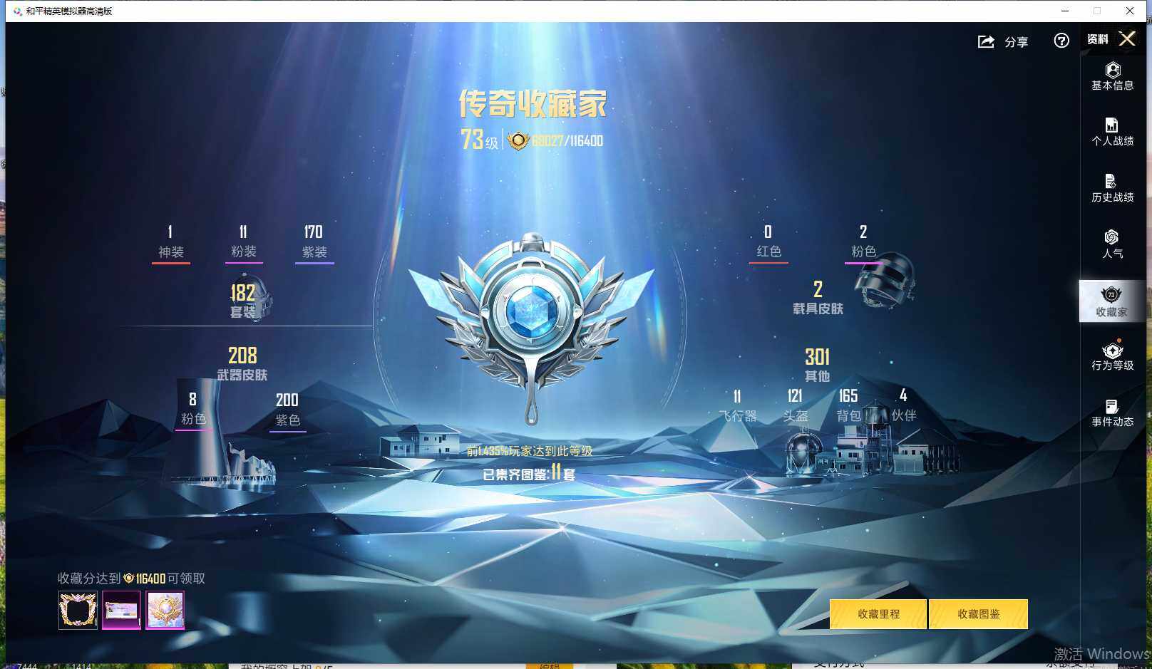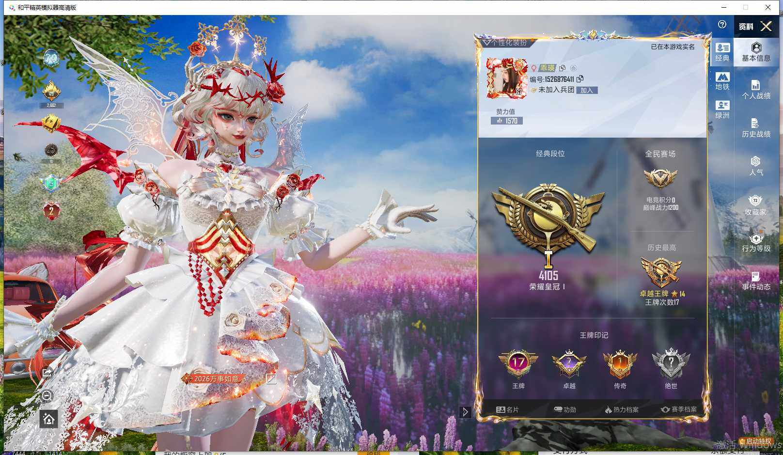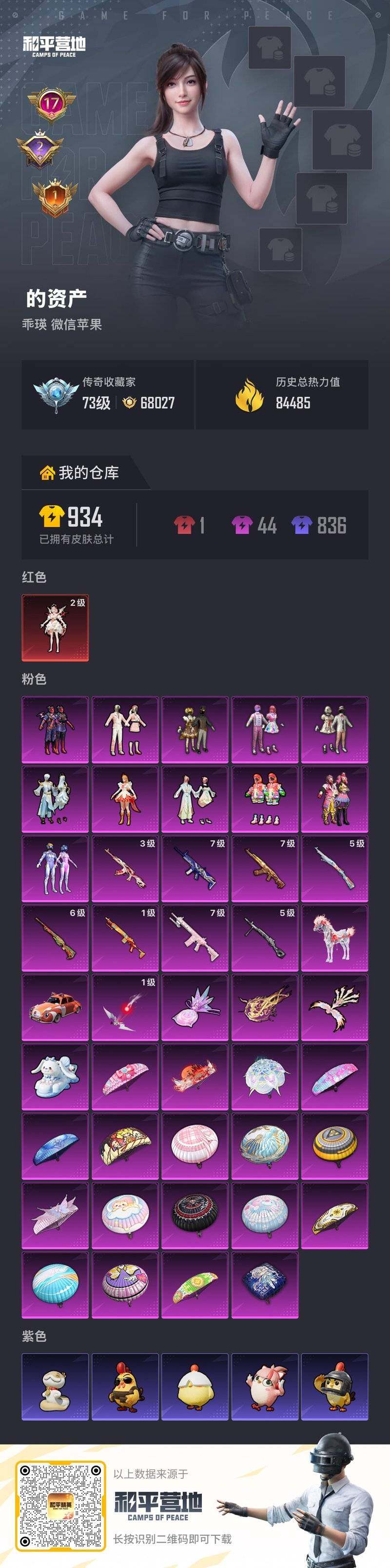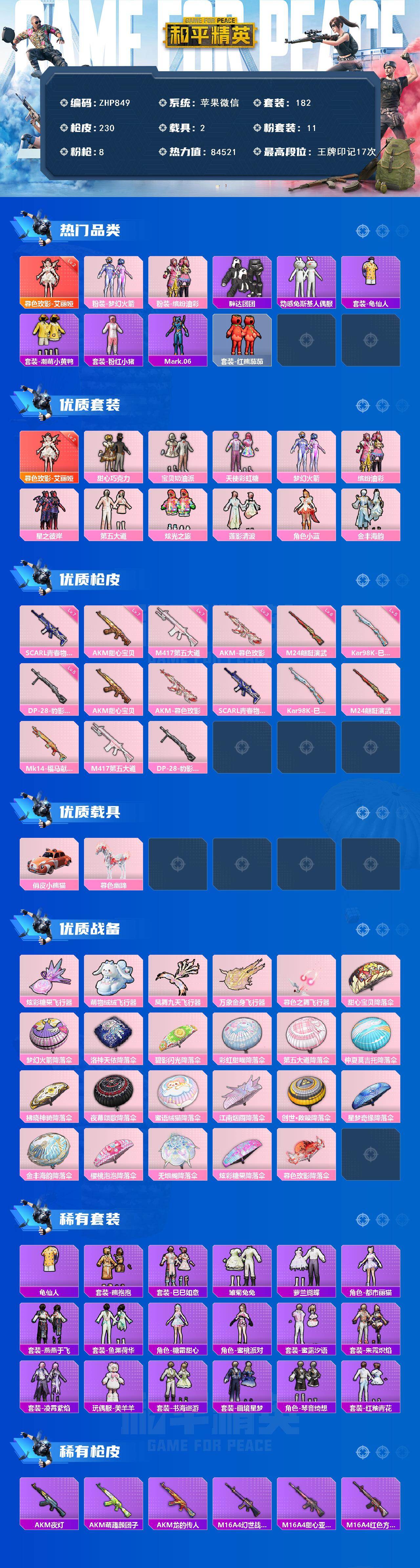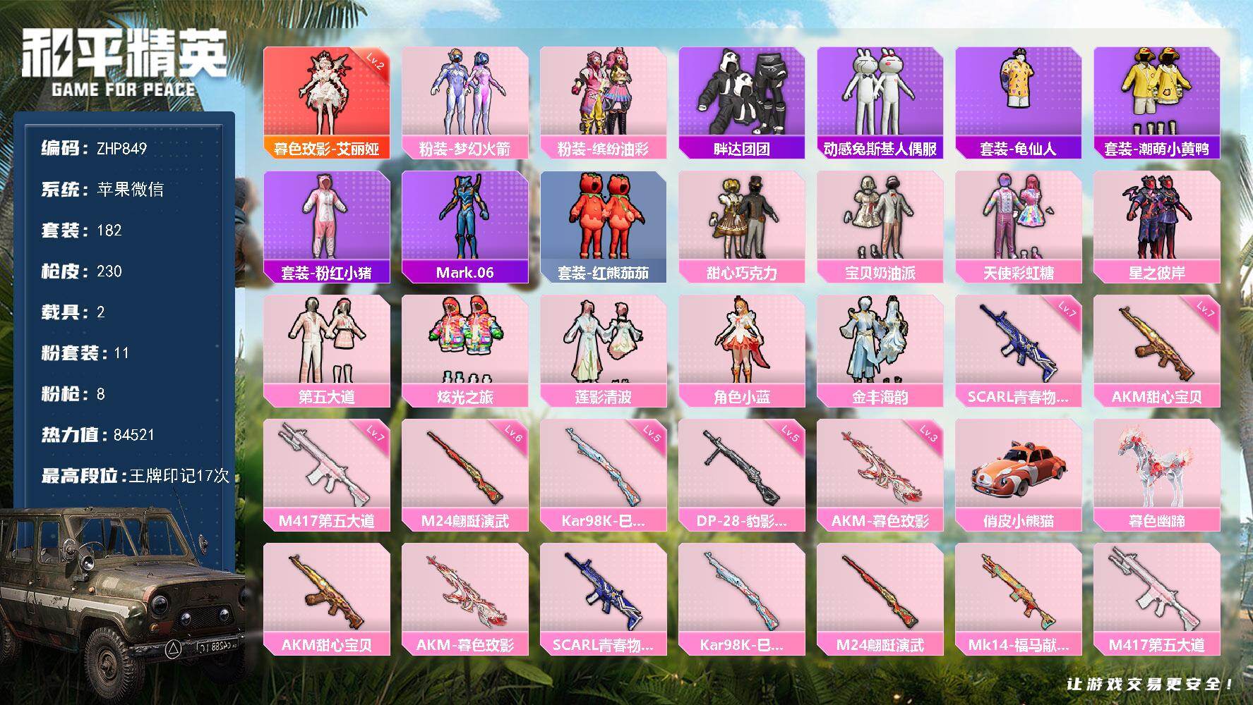 [17256111]苹果 微信-1神装-11粉装-8特效枪-2载具-1僚机-5粉色飞行器-84521热力值-17王牌印记-182套装-230枪皮