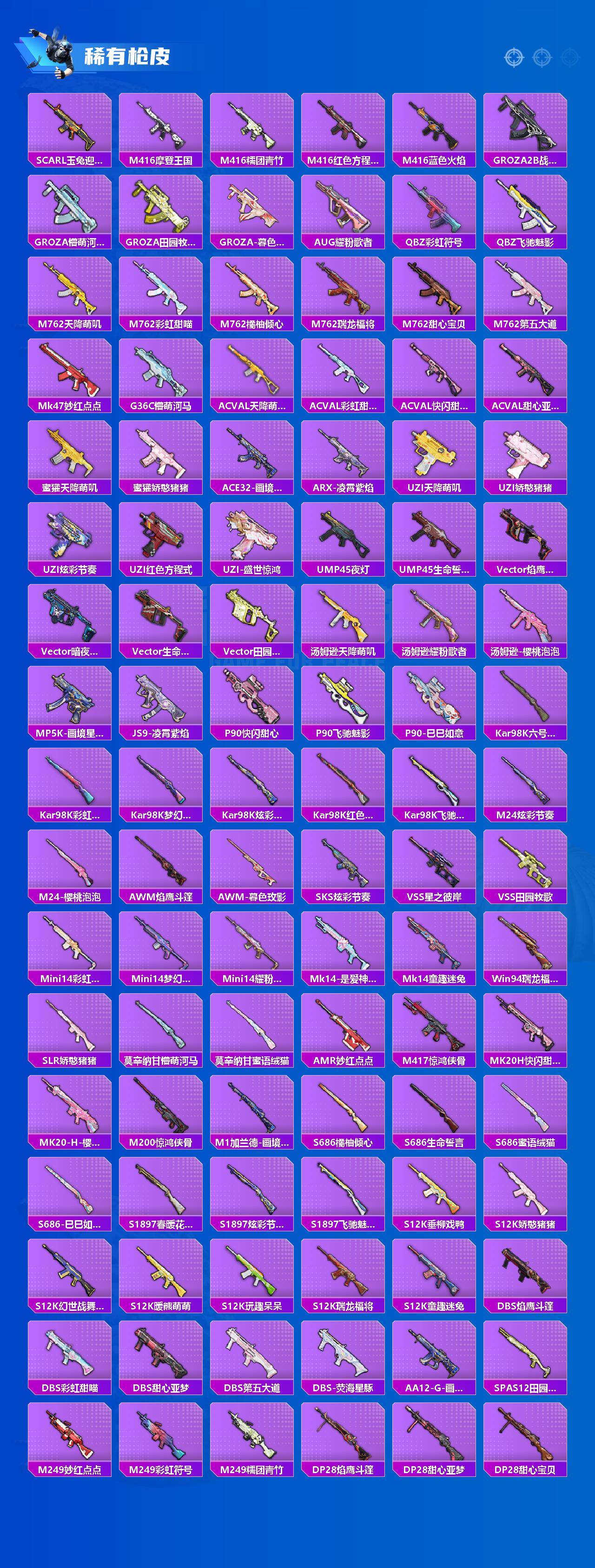 【稀有枪皮】:AUG-冰晶雪宝,AKM-夜灯,AKM-萌趣颜团子,AKM-龙的传人,M16A4-幻世战舞者,M16A4-甜心亚梦,M16A4-红色方程式,SCAR-L-玉兔迎春,M416-摩登王国,M416-糯团青竹,M416-红色方程式,M416-蓝色火焰,GROZA-2B战斗