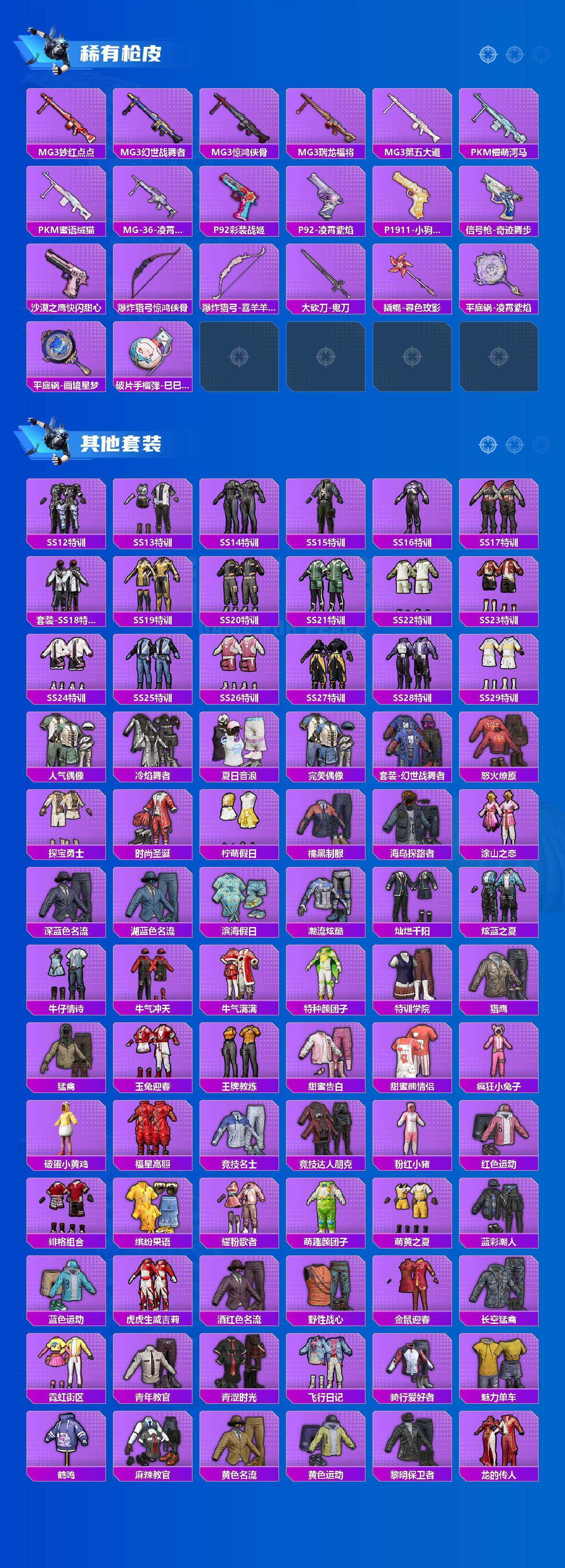 [17256111]苹果 微信-1神装-11粉装-8特效枪-2载具-1僚机-5粉色飞行器-84521热力值-17王牌印记-182套装-230枪皮 【红色神装等级】:暮色玫影-艾丽娅(二级) 【红色角色神装】:暮色玫影-艾丽娅 【热门品类】:粉装-梦幻火箭,粉装-缤纷油彩,套装-胖达团团,套装-动感兔斯基人偶服,套装-龟仙人,套装-潮萌小黄鸭,套装-粉红小猪,角色-Mark.06,套装-红熊茄茄 【粉色套装】:粉装-甜心巧克力,粉装-宝贝奶油派,粉装-天使彩虹糖,粉装-梦幻火箭,粉装-缤纷油彩,粉装-星之彼岸,粉装-第五大道,粉装-炫光之旅,粉装-莲影清波,角色-小蓝,粉装-金丰海韵 【粉色枪皮等级】:AKM-甜心宝贝(七级),AKM-暮色玫影(三级),SCAR-L-青春物语(七级),Kar98K-巳巳如意(五级),M24-翩跹演武(六级),M417-第五大道(七级),DP-28-豹影疾电(五级) 【粉色载具】:俏皮小熊猫,暮色幽蹄 【粉色枪皮】:AKM-甜心宝贝,AKM-暮色玫影,SCAR-L-青春物语,Kar98K-巳巳如意,M24-翩跹演武,Mk14-福马献瑞,M417-第五大道,DP-28-豹影疾电 【粉色飞行器】:炫彩糖果飞行器,萌物绒绒飞行器,凤舞九天飞行器,万象金身飞行器,暮色之舞飞行器 【粉色降落伞】:甜心宝贝降落伞,梦幻火箭降落伞,洛神天依降落伞,碧影闪光降落伞,彩虹甜喵降落伞,第五大道降落伞,仲夏莫吉托降落伞,拂晓神骑降落伞,夜幕颂歌降落伞,蜜语绒猫降落伞,江南烟雨降落伞,创世·救赎降落伞,星梦奇缘降落伞,金丰海韵降落伞,樱桃泡泡降落伞,无垠阁降落伞,炫彩糖果降落伞,暮色玫影降落伞 【稀有套装】:套装-龟仙人,套装-熊抱抱,套装-巳巳如意,套装-炫彩糖果,套装-雏菊兔兔,套装-萝兰蝴蝶,角色-都市丽猫,套装-燕燕于飞,套装-鱼渊荷华,角色-糖霜甜心,角色-蜜桃派对,套装-蜜露汐语,套装-朱霞炽焰,套装-凌霄紫焰,玩偶服-美羊羊,套装-书海巡游,套装-画境星梦,套装-琴音绮想,套装-红釉青花 【稀有枪皮】:AUG-冰晶雪宝,AKM-夜灯,AKM-萌趣颜团子,AKM-龙的传人,M16A4-幻世战舞者,M16A4-甜心亚梦,M16A4-红色方程式,SCAR-L-玉兔迎春,M416-摩登王国,M416-糯团青竹,M416-红色方程式,M416-蓝色火焰,GROZA-2B战斗
