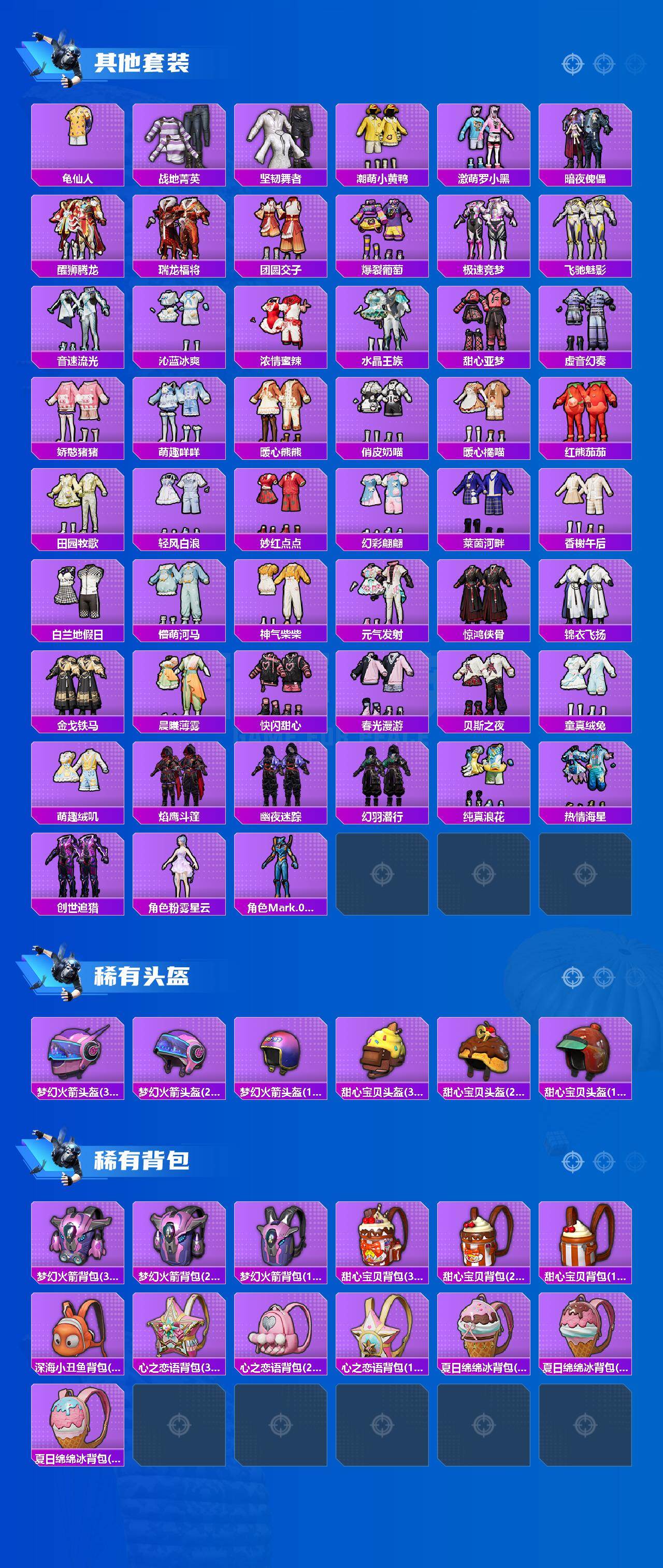 【稀有套装】:套装-龟仙人,套装-熊抱抱,套装-巳巳如意,套装-炫彩糖果,套装-雏菊兔兔,套装-萝兰蝴蝶,角色-都市丽猫,套装-燕燕于飞,套装-鱼渊荷华,角色-糖霜甜心,角色-蜜桃派对,套装-蜜露汐语,套装-朱霞炽焰,套装-凌霄紫焰,玩偶服-美羊羊,套装-书海巡游,套装-画境星梦,套装-琴音绮想,套装-红釉青花